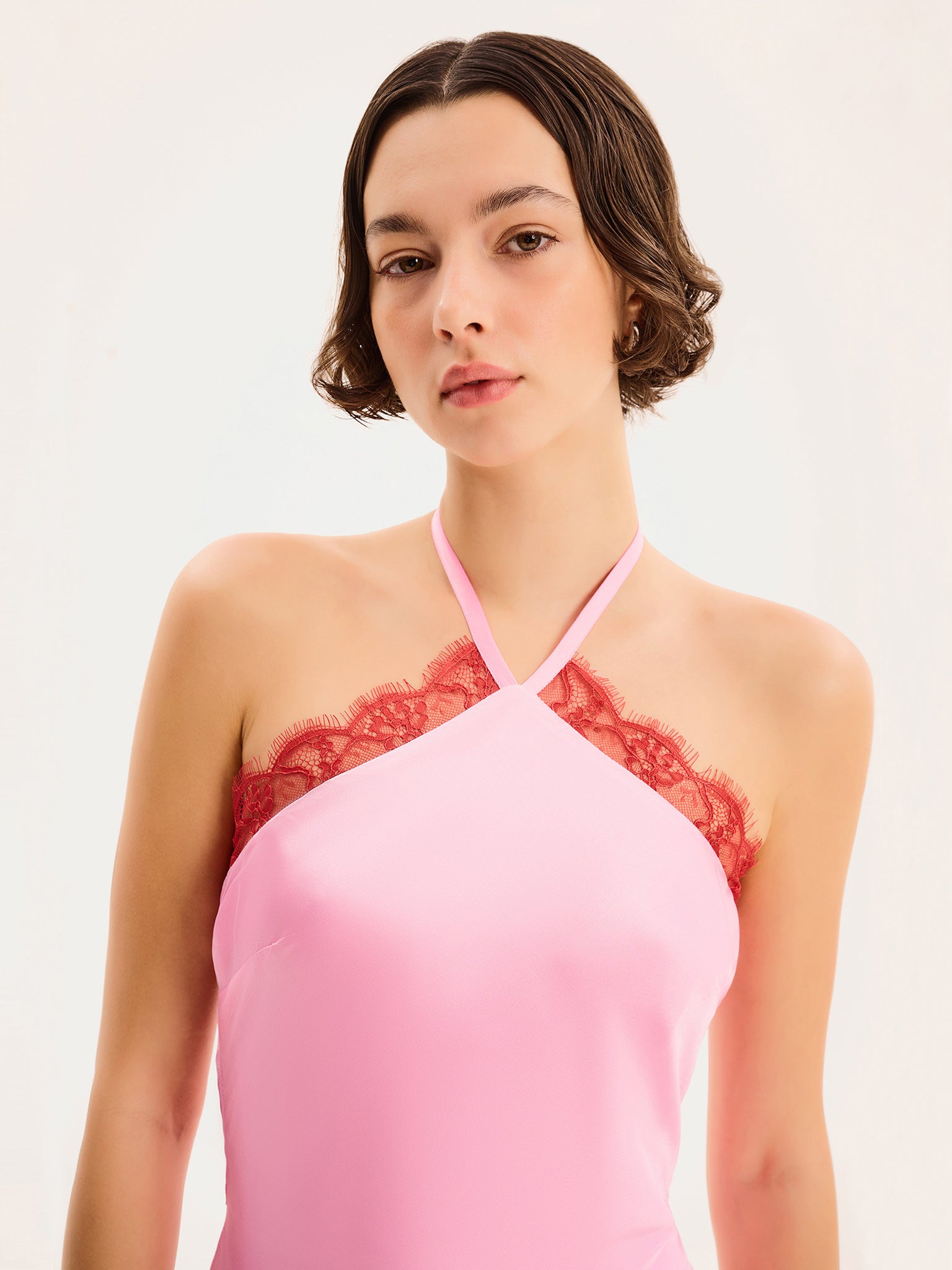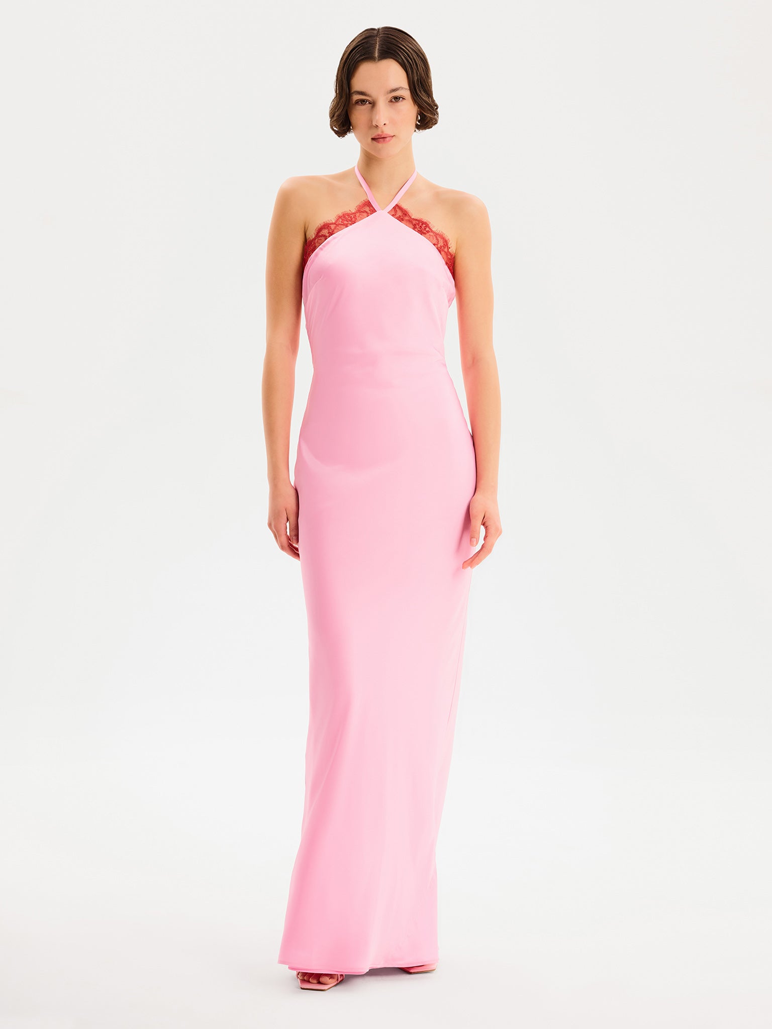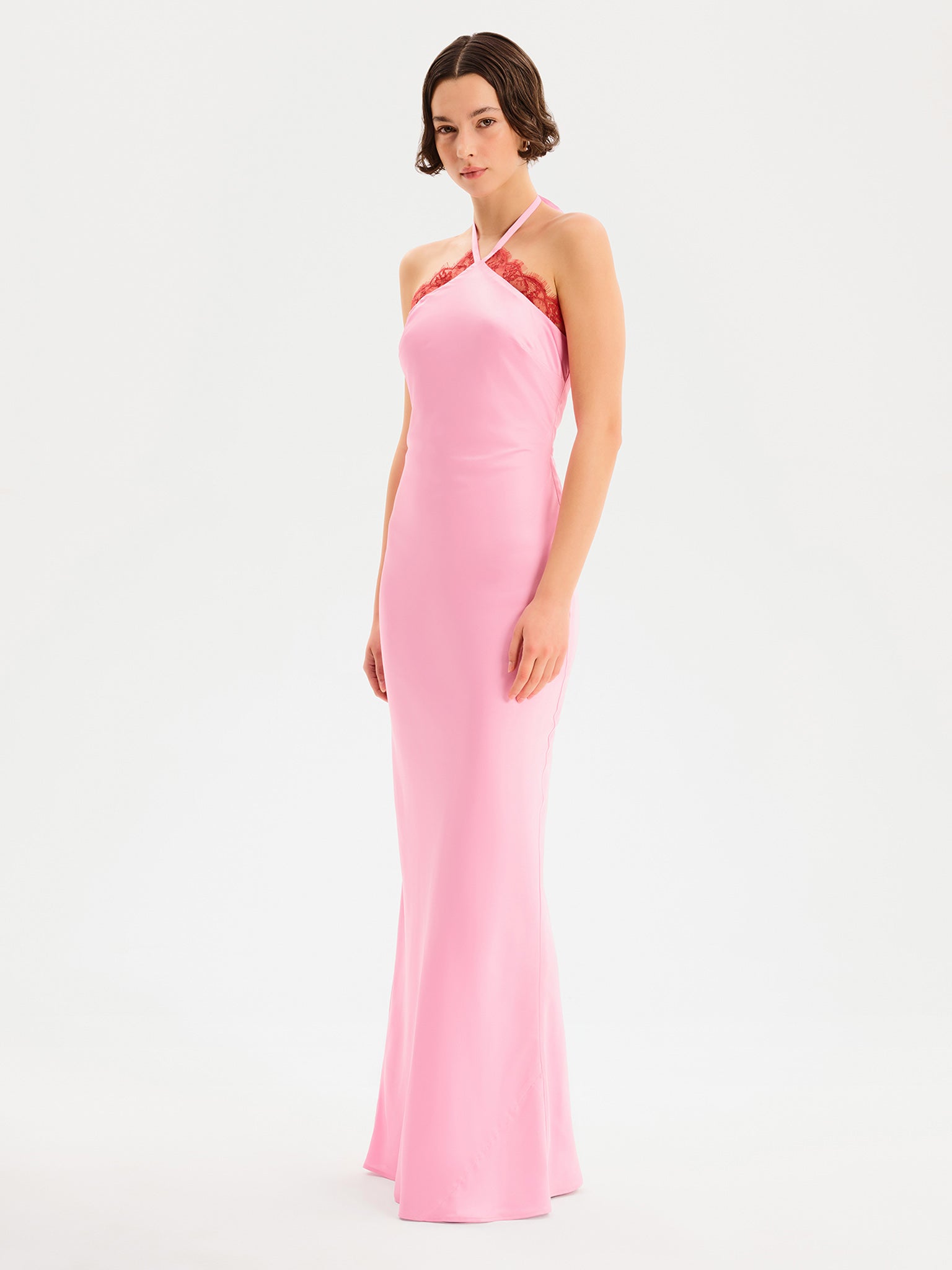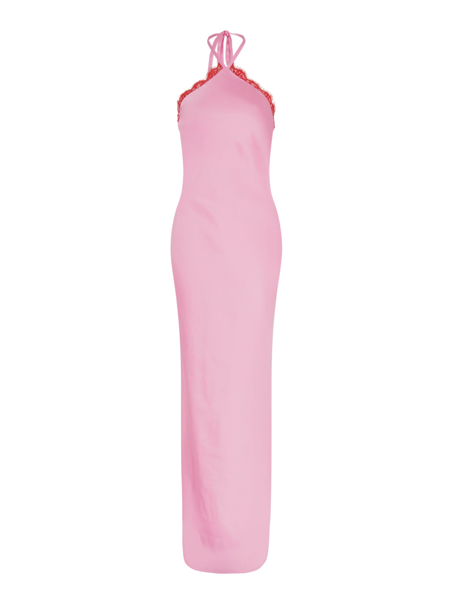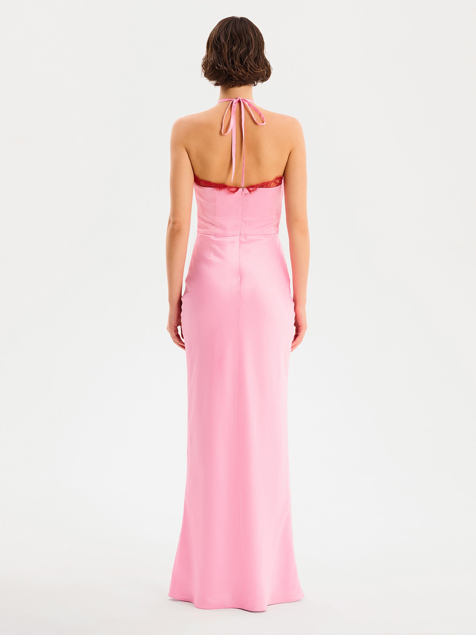 Andy effortlessly blends elegance with a touch of edge. This maxi dress is designed with a flattering halter-style neck, showcasing a contrasting lace trim. The simple silhouette enhances its graceful look, making it perfect for both special occasions and evenings out.