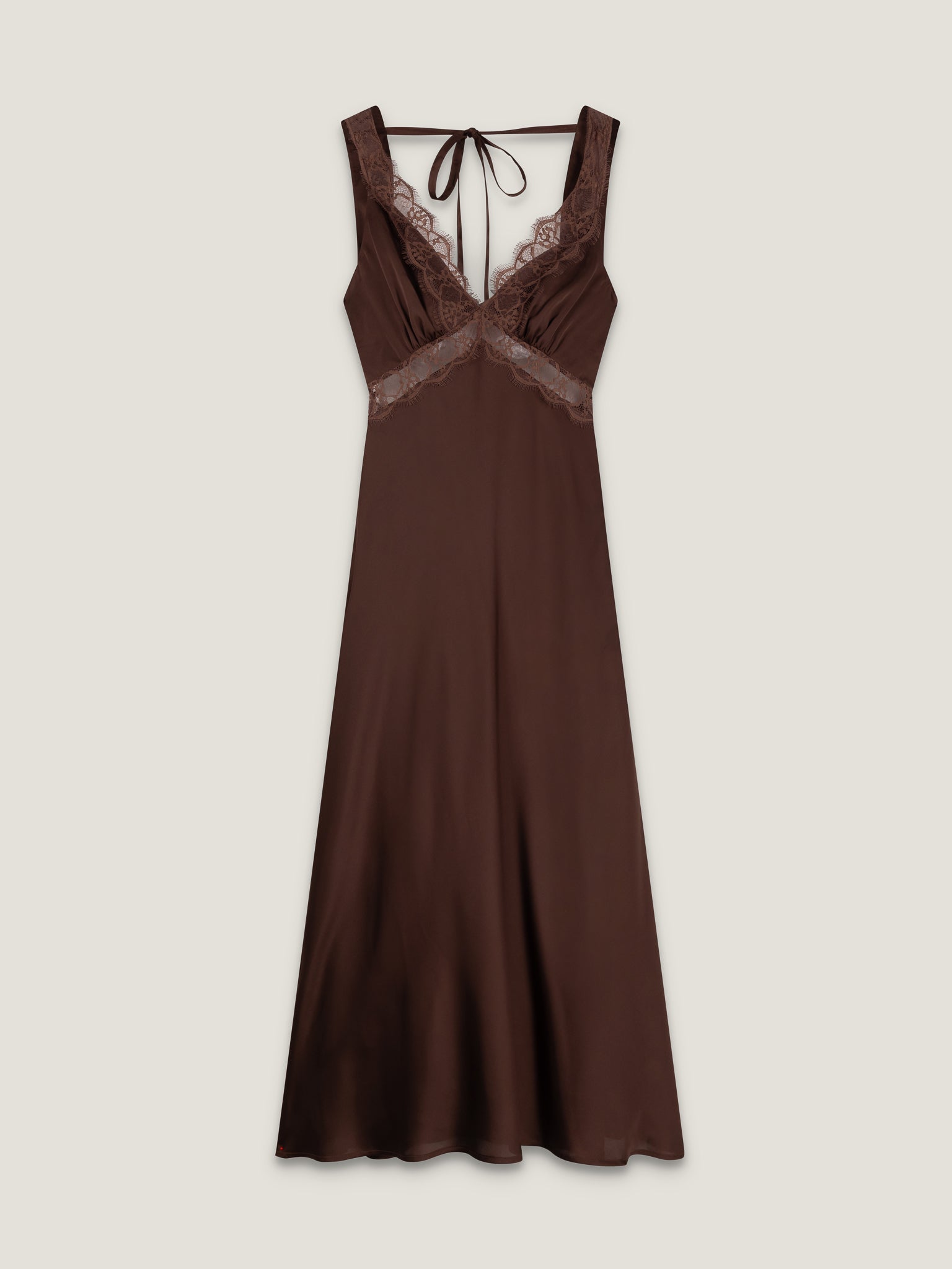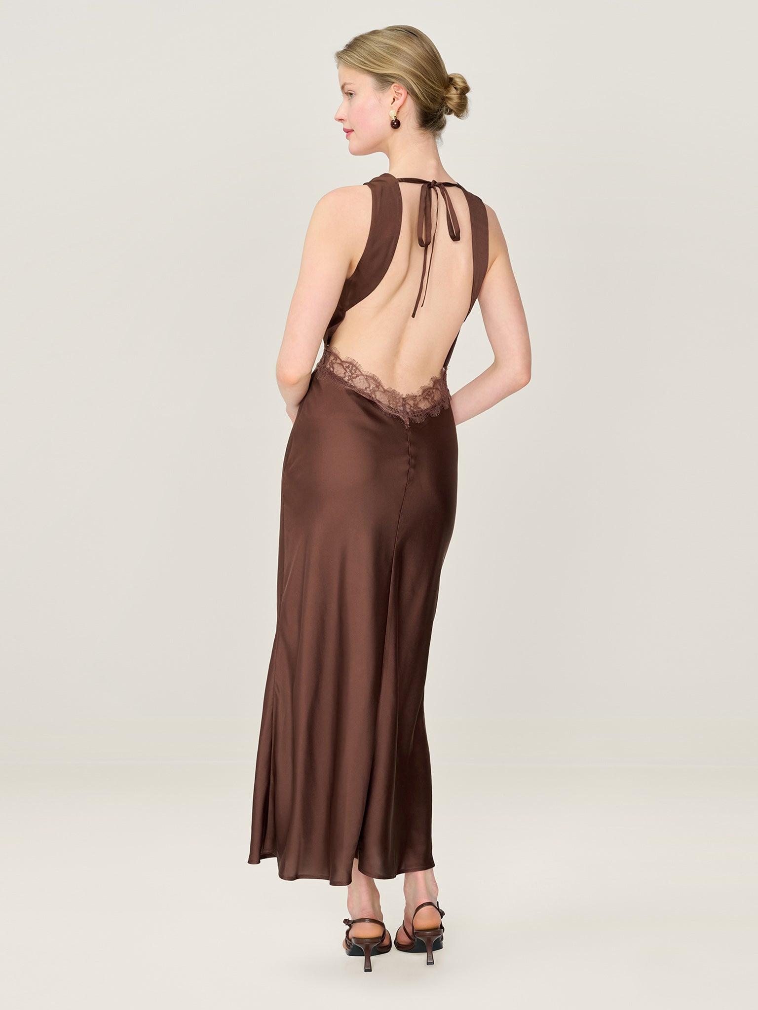 Aurelia features a plunging neckline and open back, artfully outlined by lace details. Crafted from satin in rich chocolate brown, this romantic midi dress is oozing with feminine details from the curved tie-back to the peek-a-boo lace under the bust.