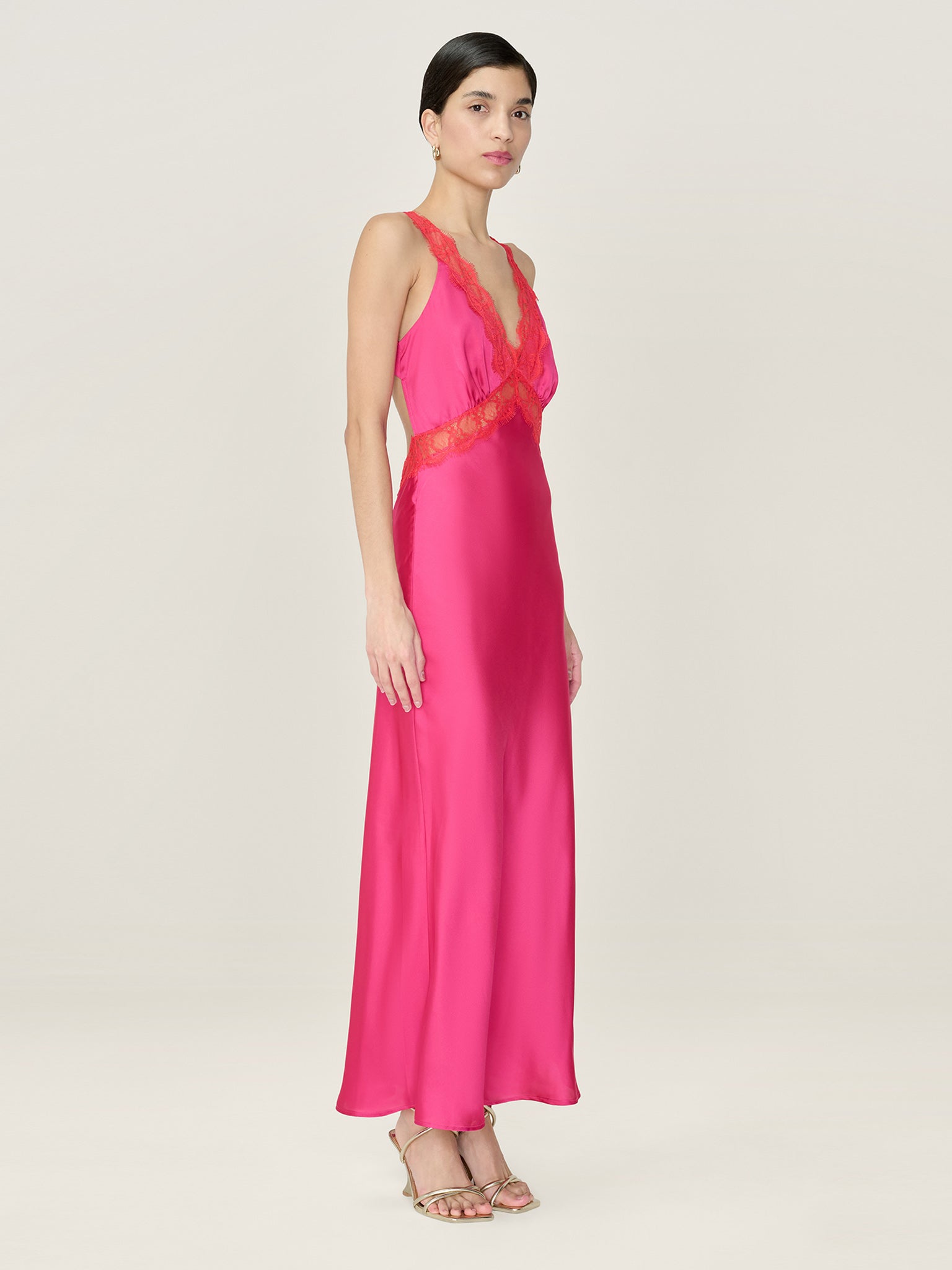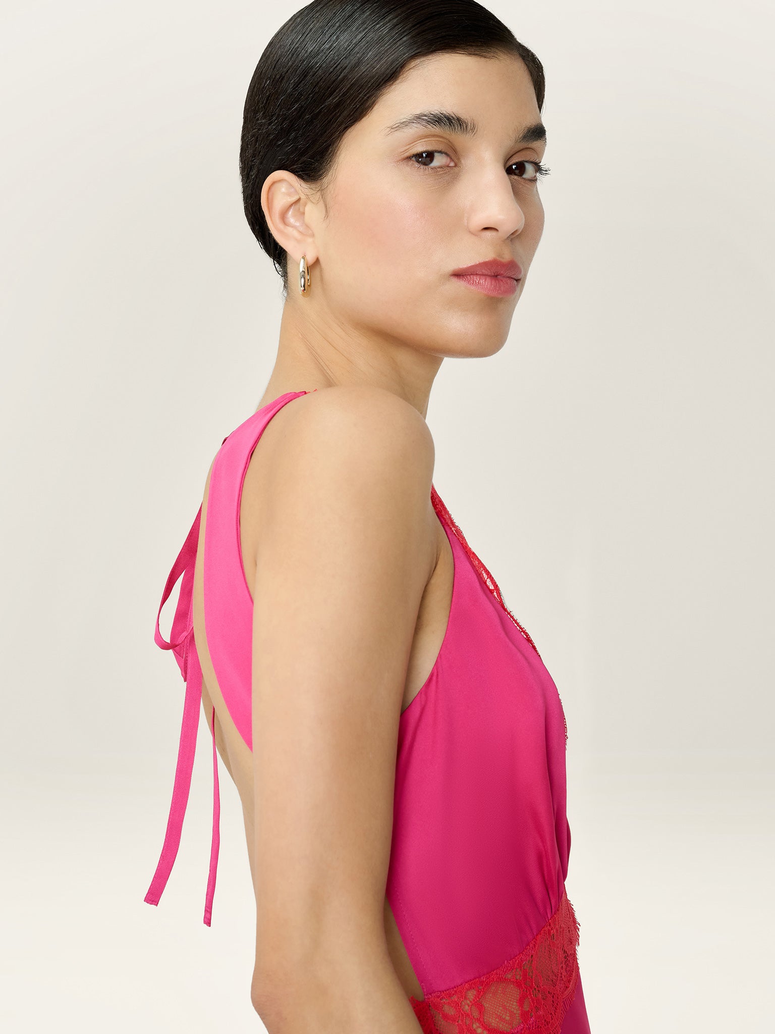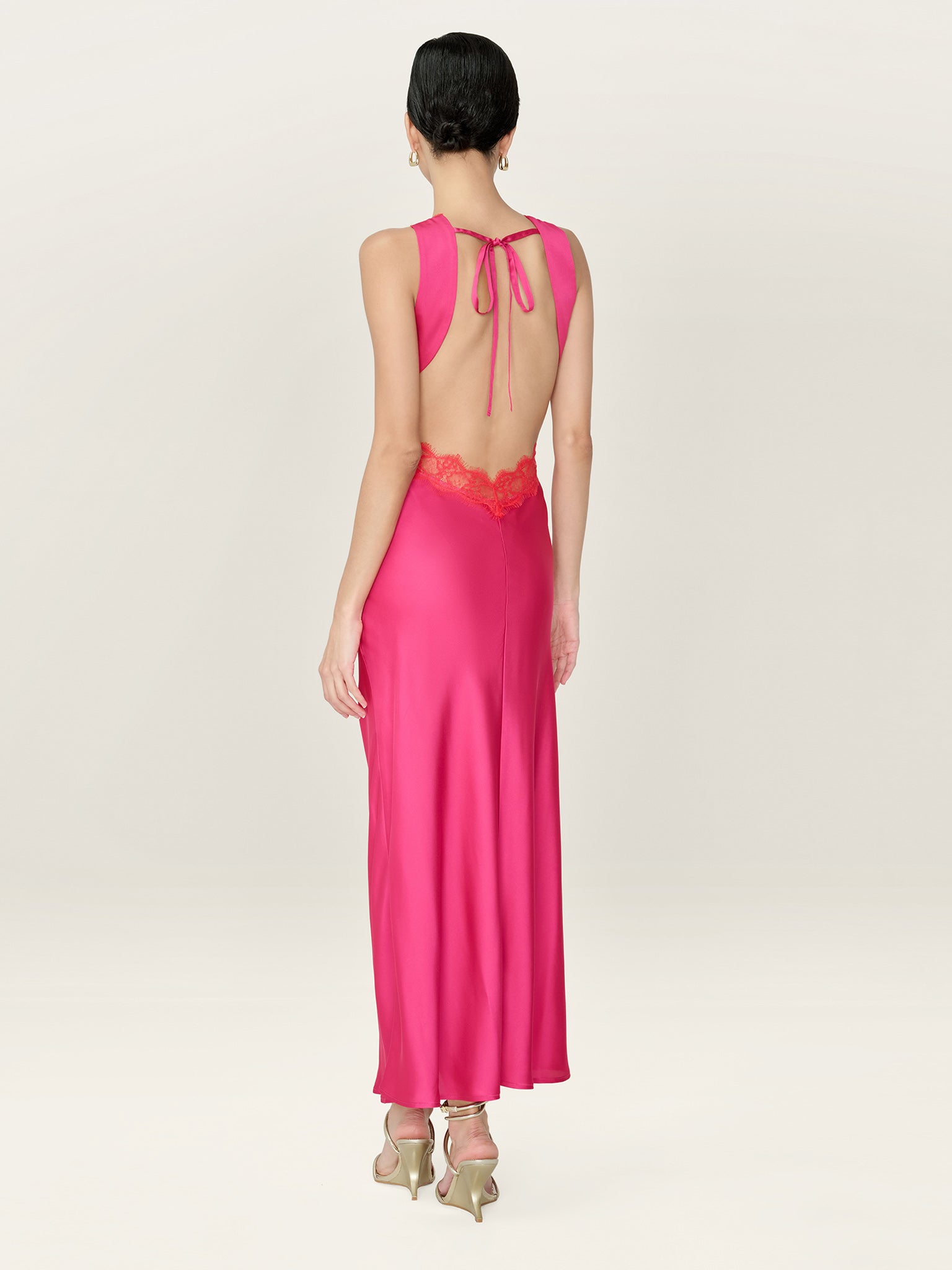 Aurelia features a plunging neckline and open back, artfully outlined by lace details. Crafted from satin in hot pink with contrastic red details, this romantic midi dress is oozing with feminine details from the curved tie-back to the peek-a-boo lace under the bust.