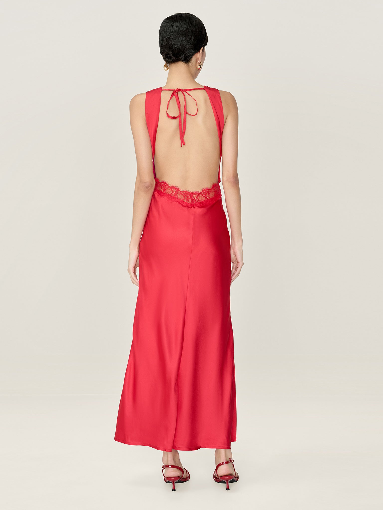 Aurelia features a plunging neckline and open back, artfully outlined by lace details. Crafted from recycled polyester satin in a cherry red, she's oozing with feminine details from the curved tie-back to the peek-a-boo lace under the bust.
