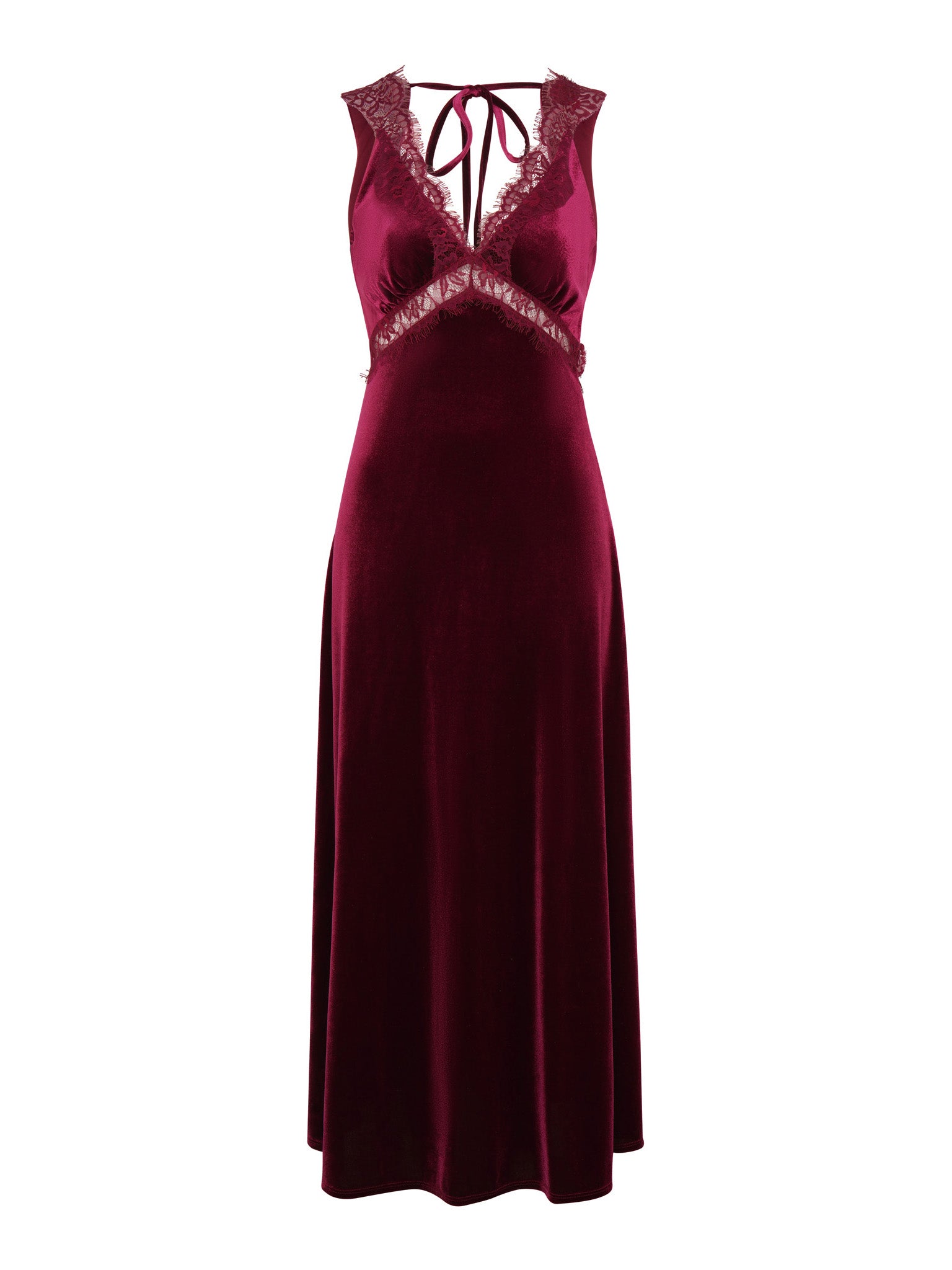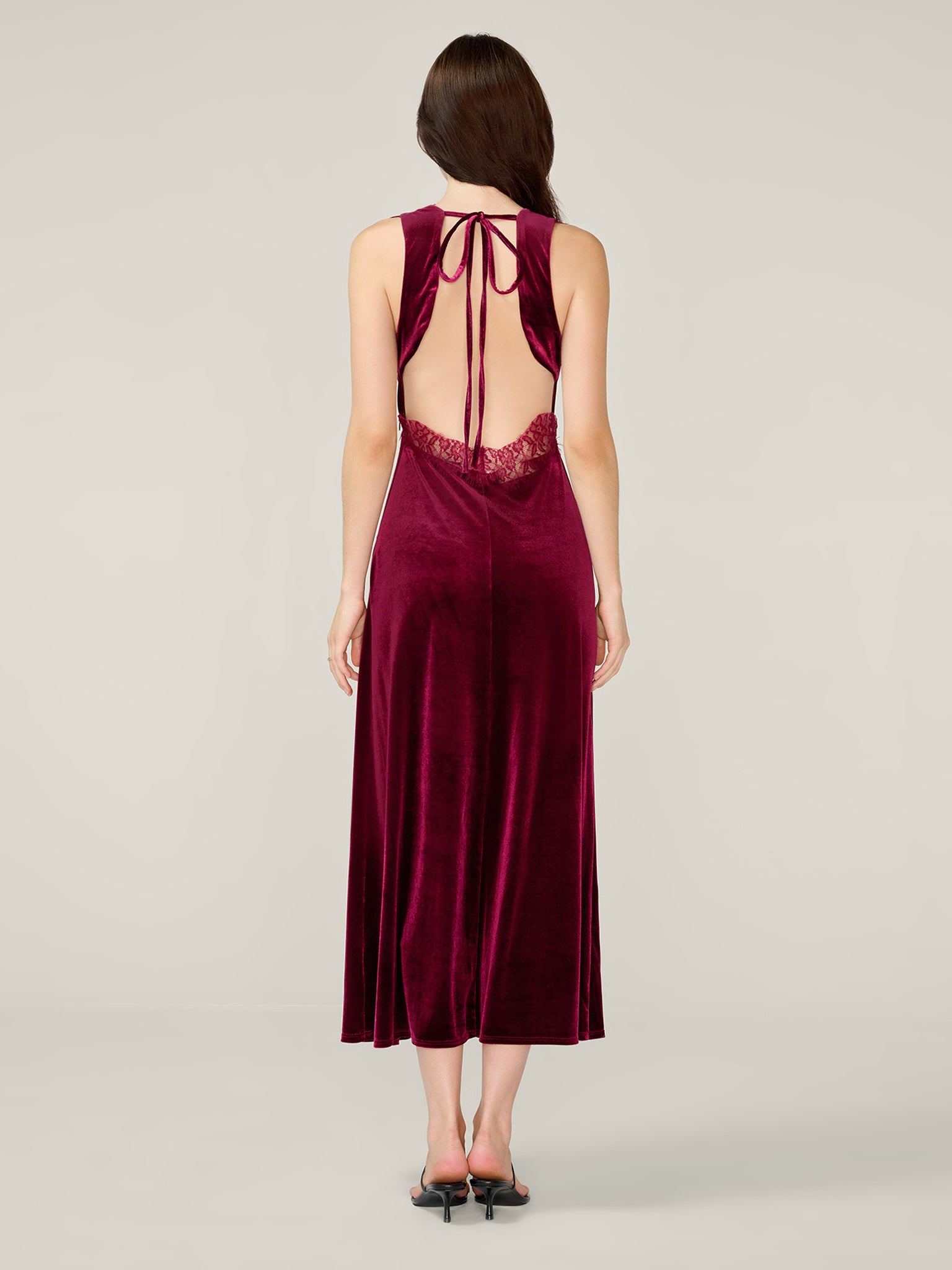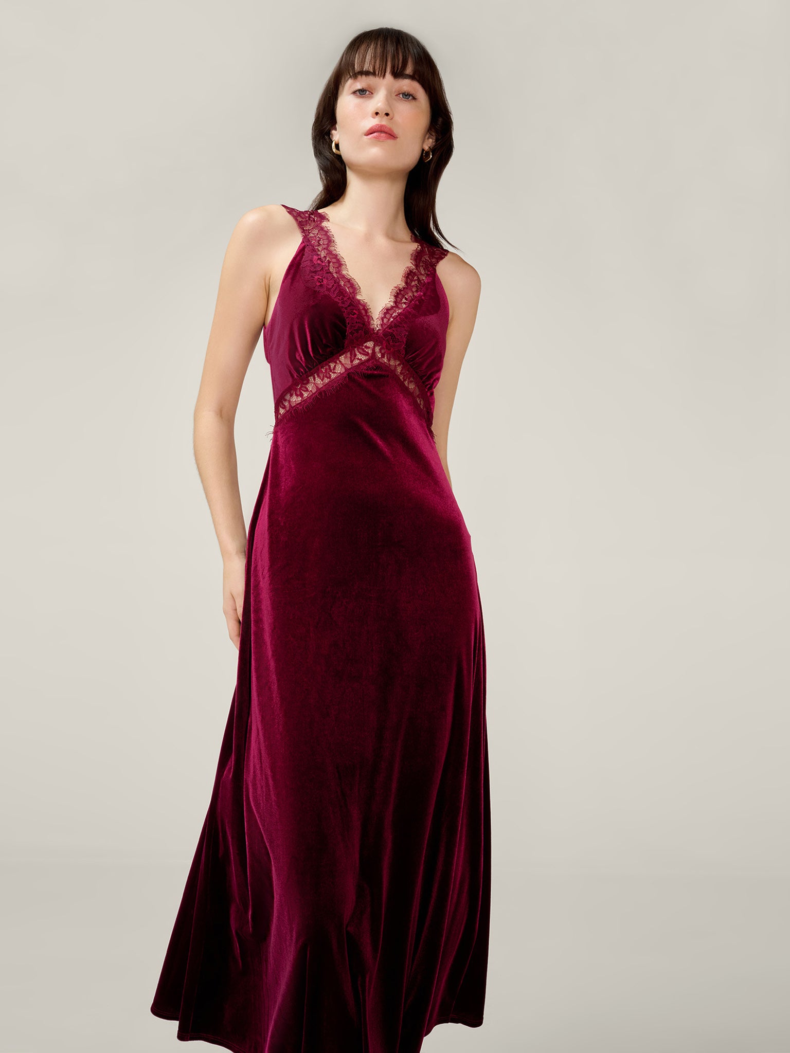 Crafted from deep wine red velvet, Aurelia features a plunging neckline and open back with delicate late detailing. This silhouette is all about bold femininity and texture. Designed with special occasions in mind, Aurelia is a striking choice for bridesmaids; or anyone looking to make an entrance.