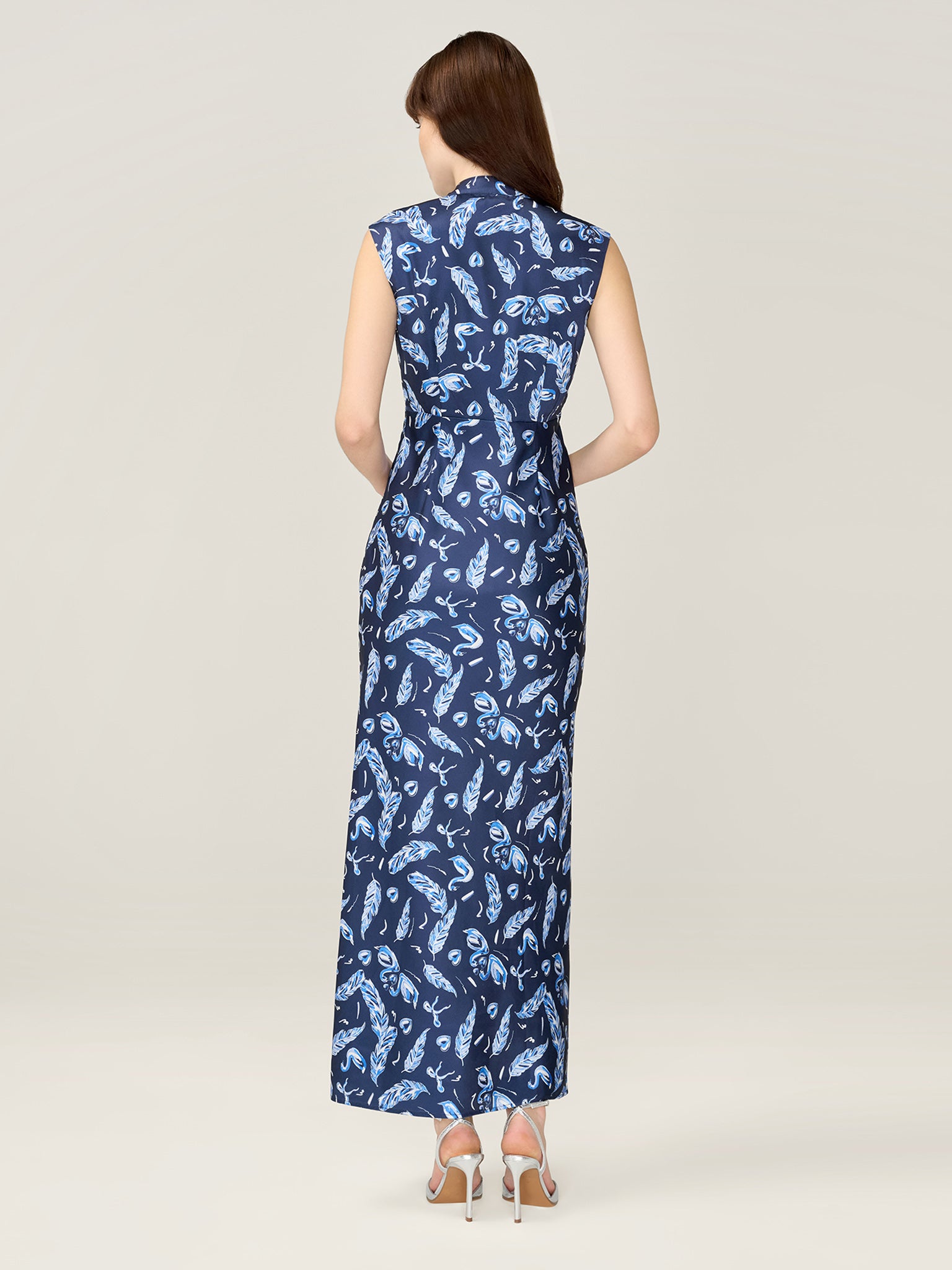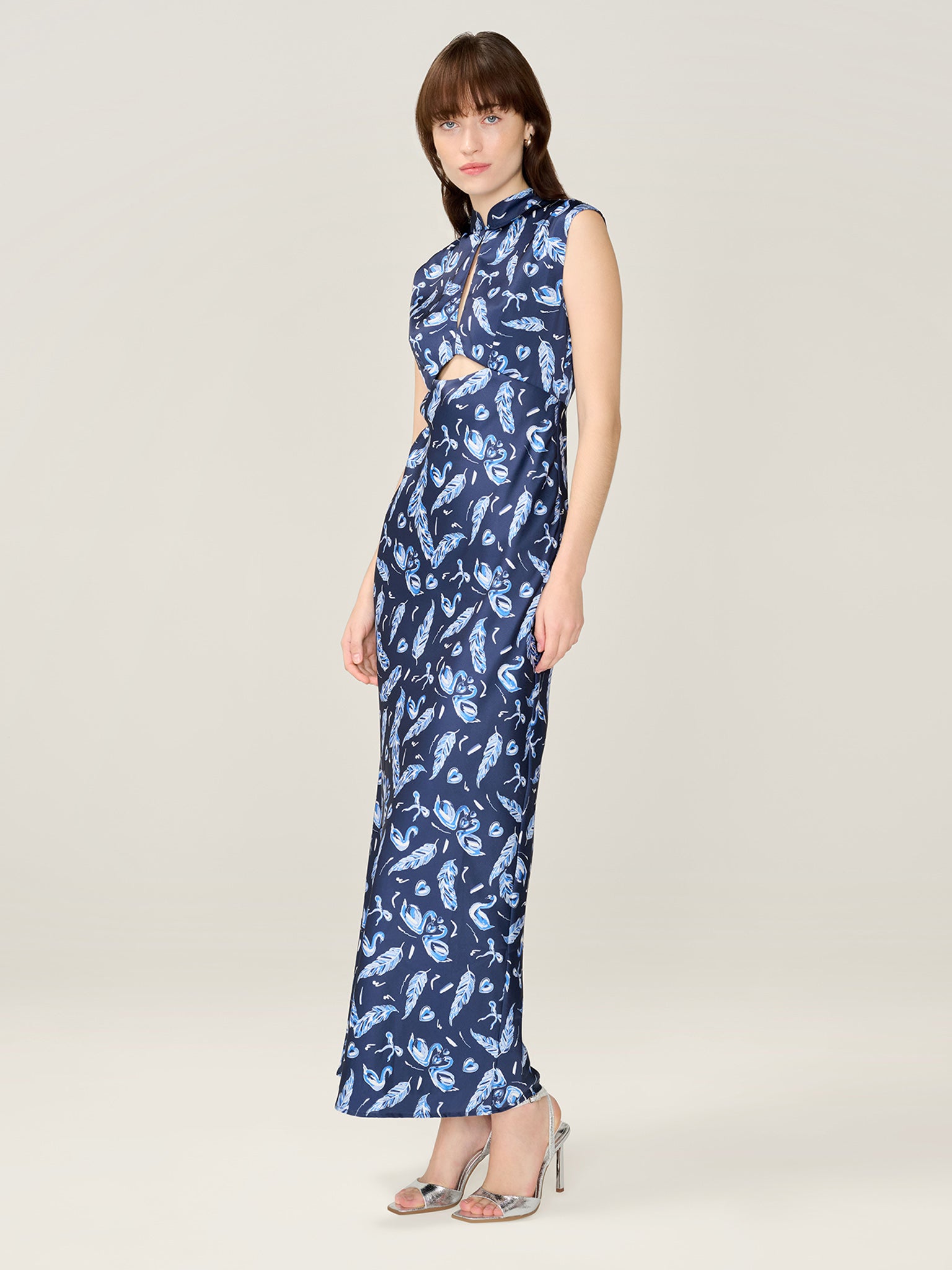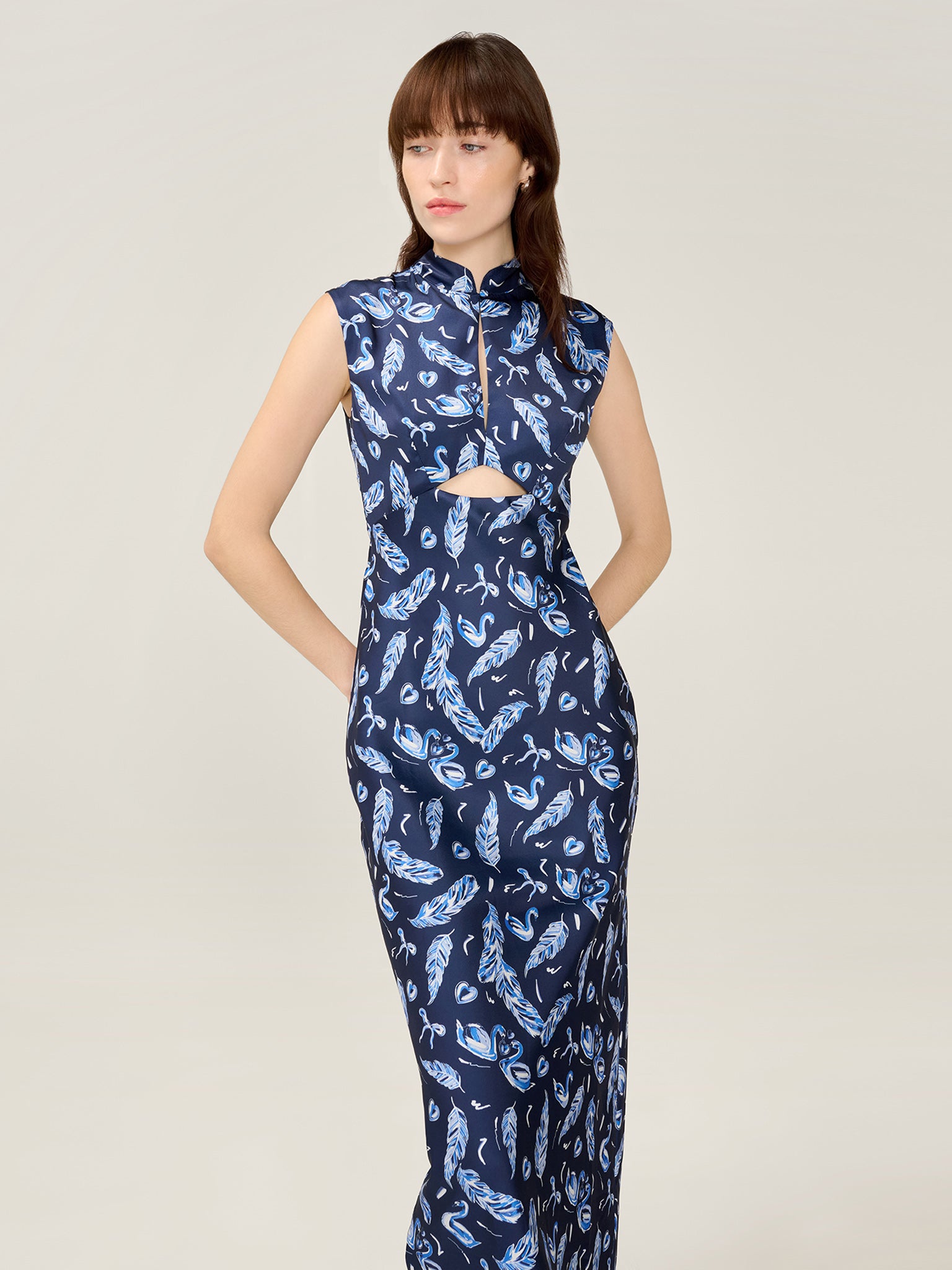 The Candice dress blends timeless elegance with contemporary charm. Crafted in a slinky navy satin with an illustrated swan print, this sophisticated midi dress reimagines a classic silhouette with a fresh perspective. Delicate keyhole details along the collar add just the right amount of intrigue to the clean, sculpted shape. Refined yet statement-making, Candice is perfect for winter soirées, evening plans, or any occasion that calls for a playfully bold look.