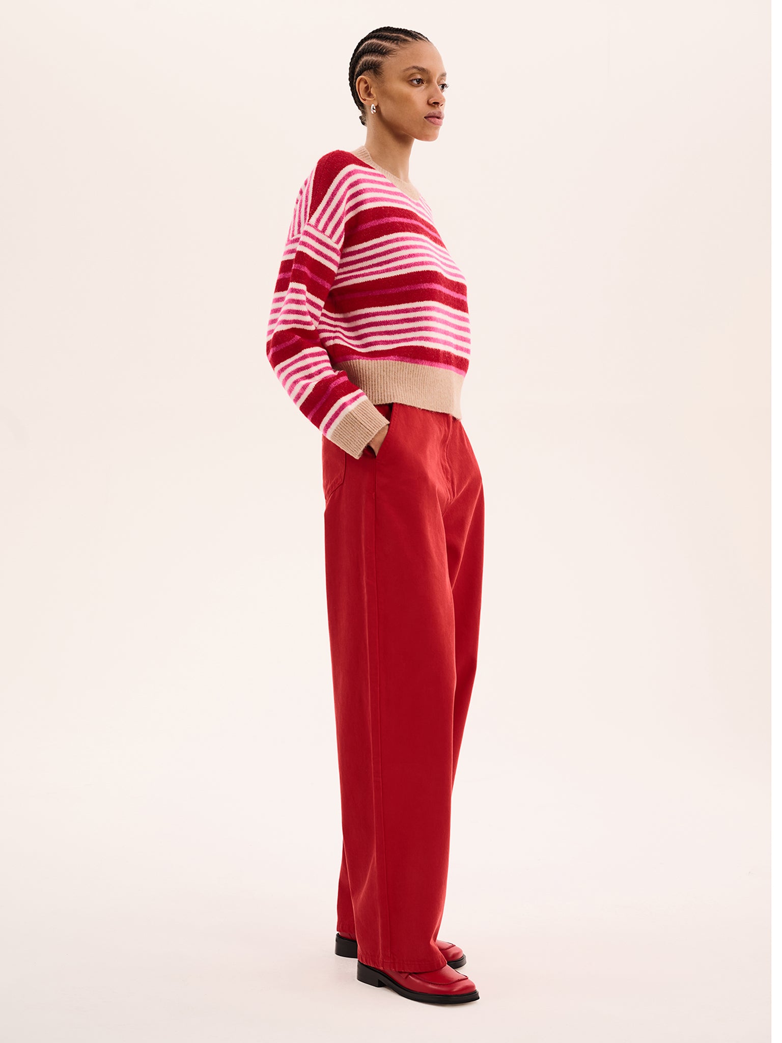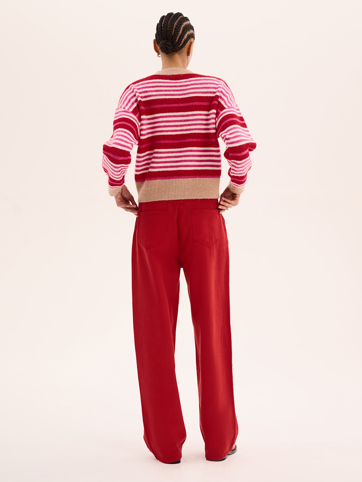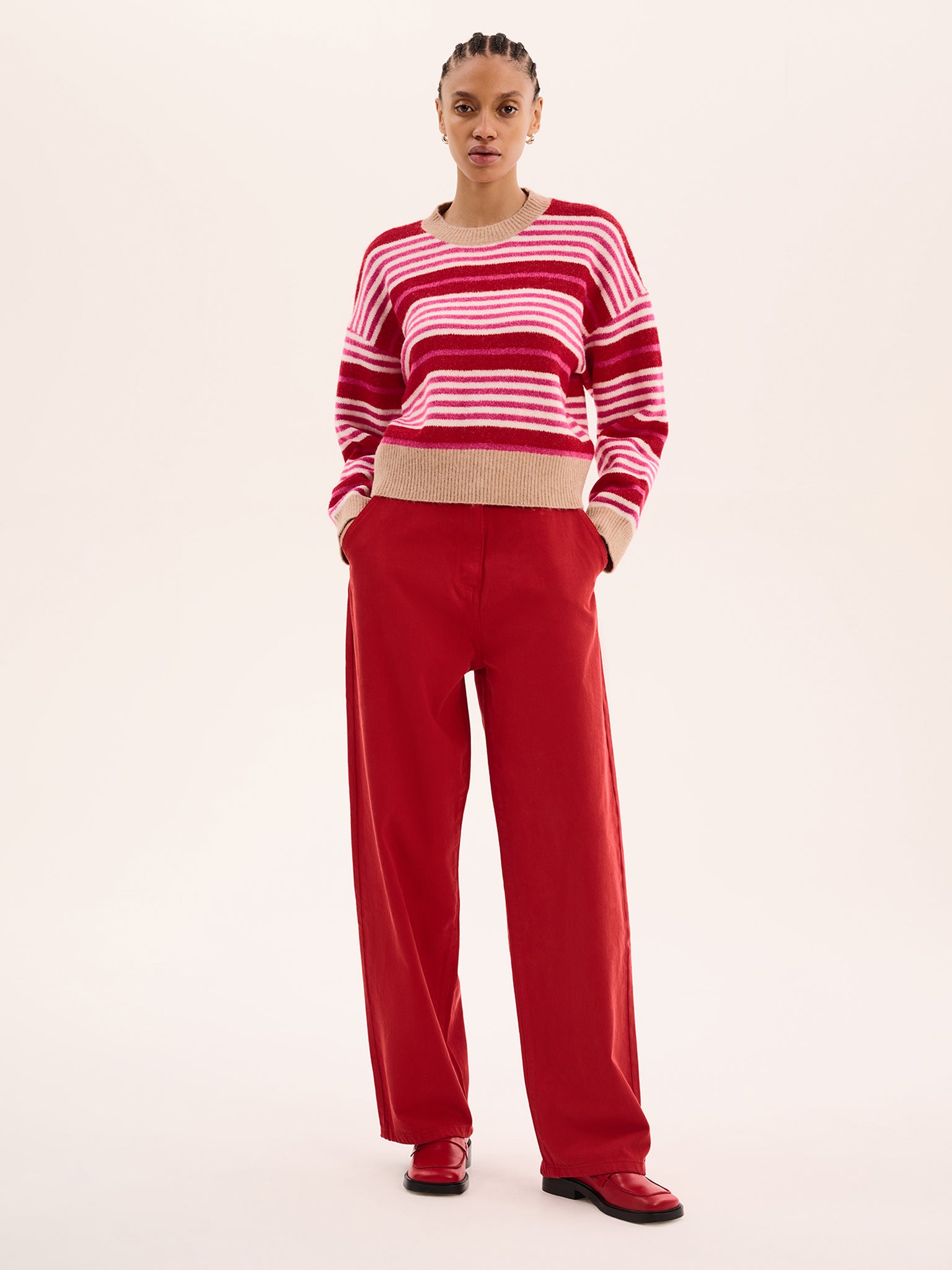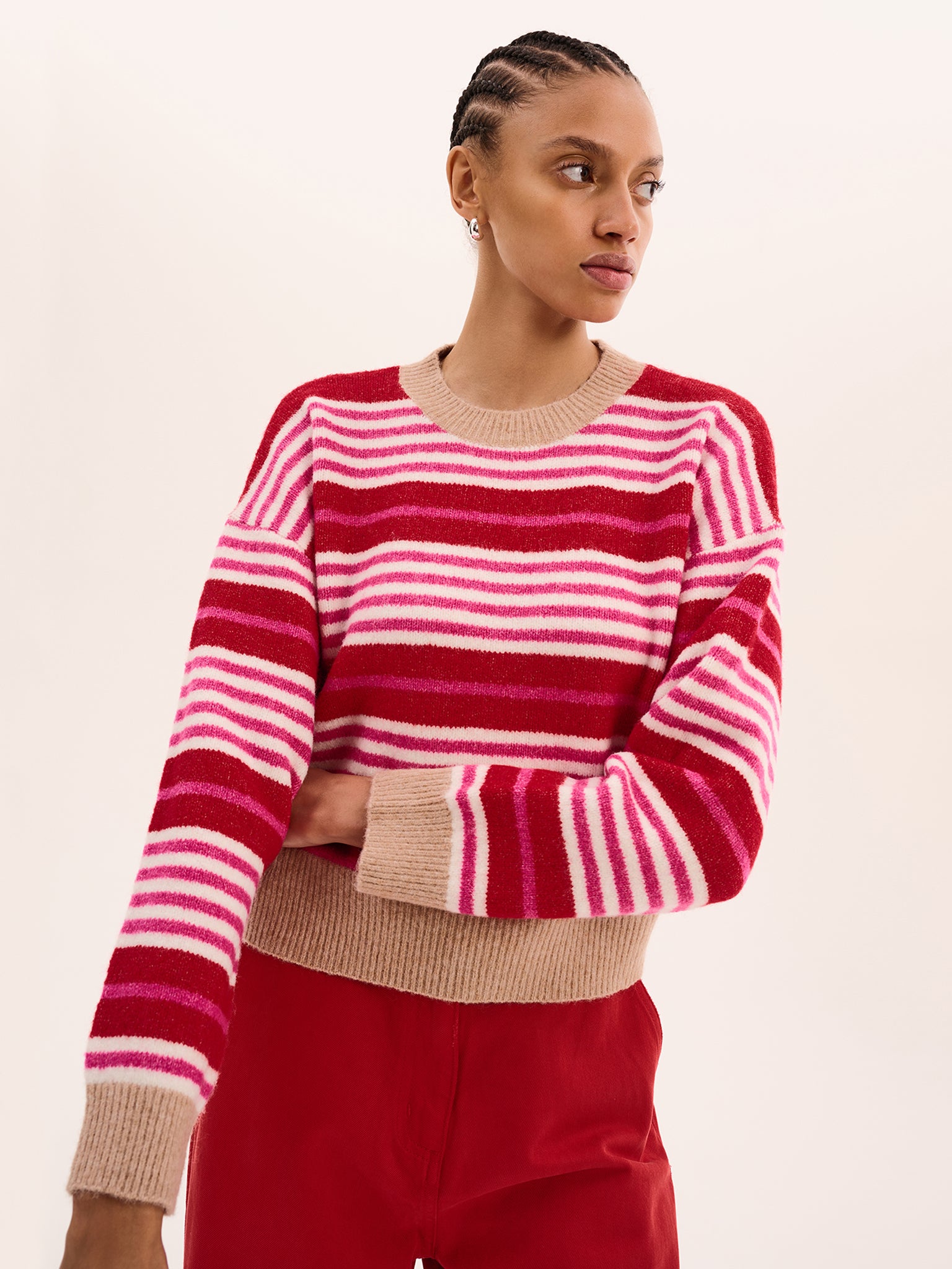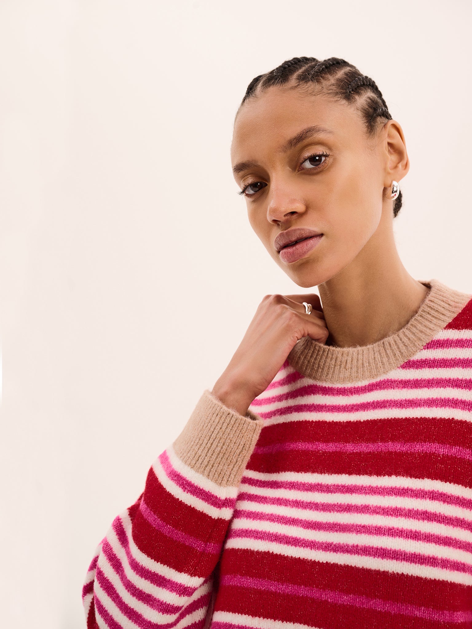 Cosy up with Clementine, the slouchy jumper you'll turn to again and again. This season we've designed this jumper with a bright pink and red stripe pattern with contrasting cuffs in cappuccino. Crafted from fluffy yarns with a crew neck and ribbed cuffs, she's designed with an oversized fit.