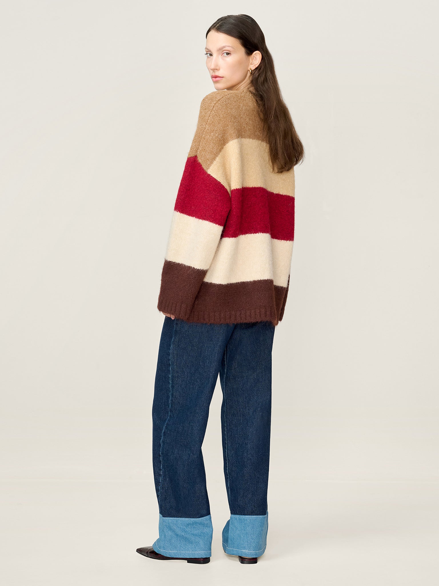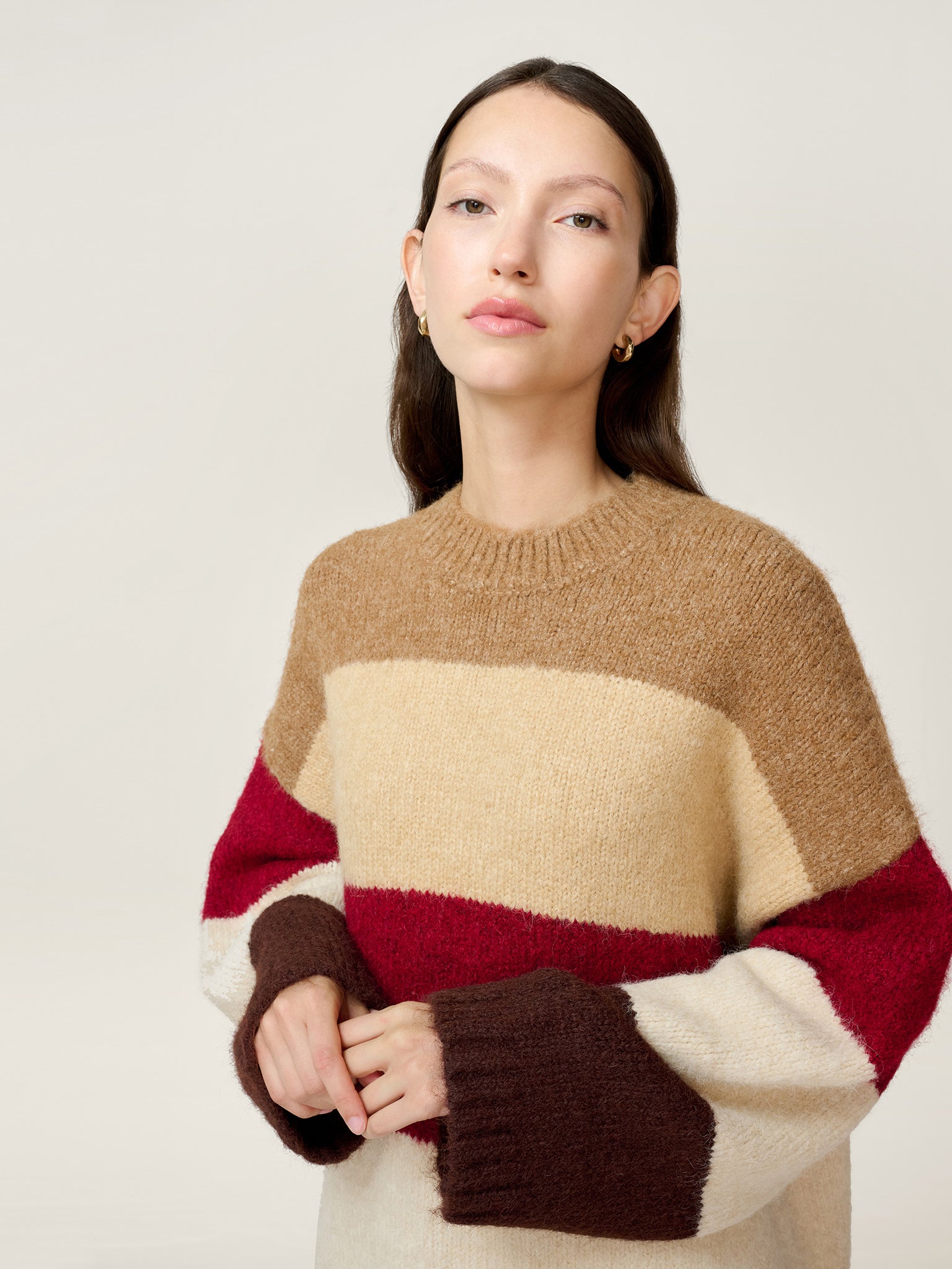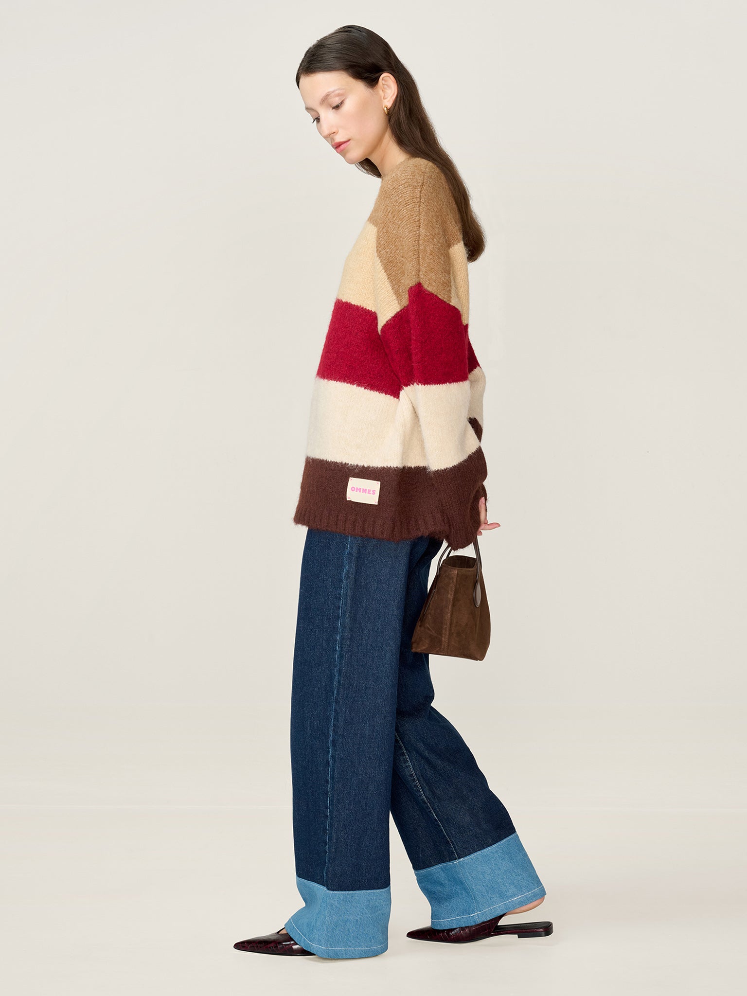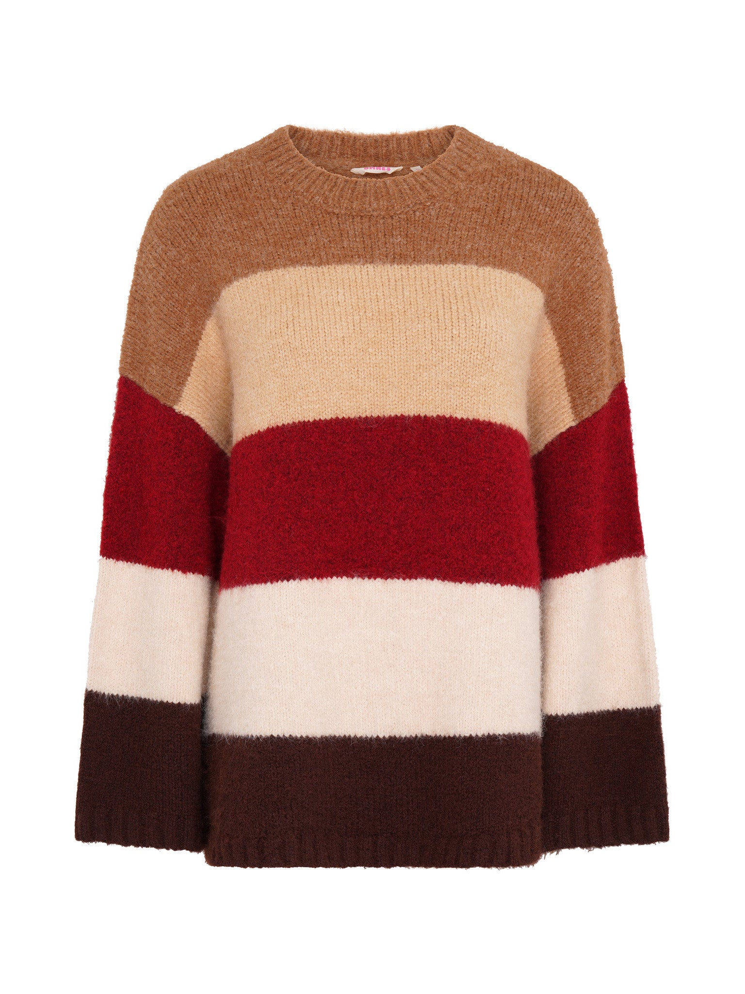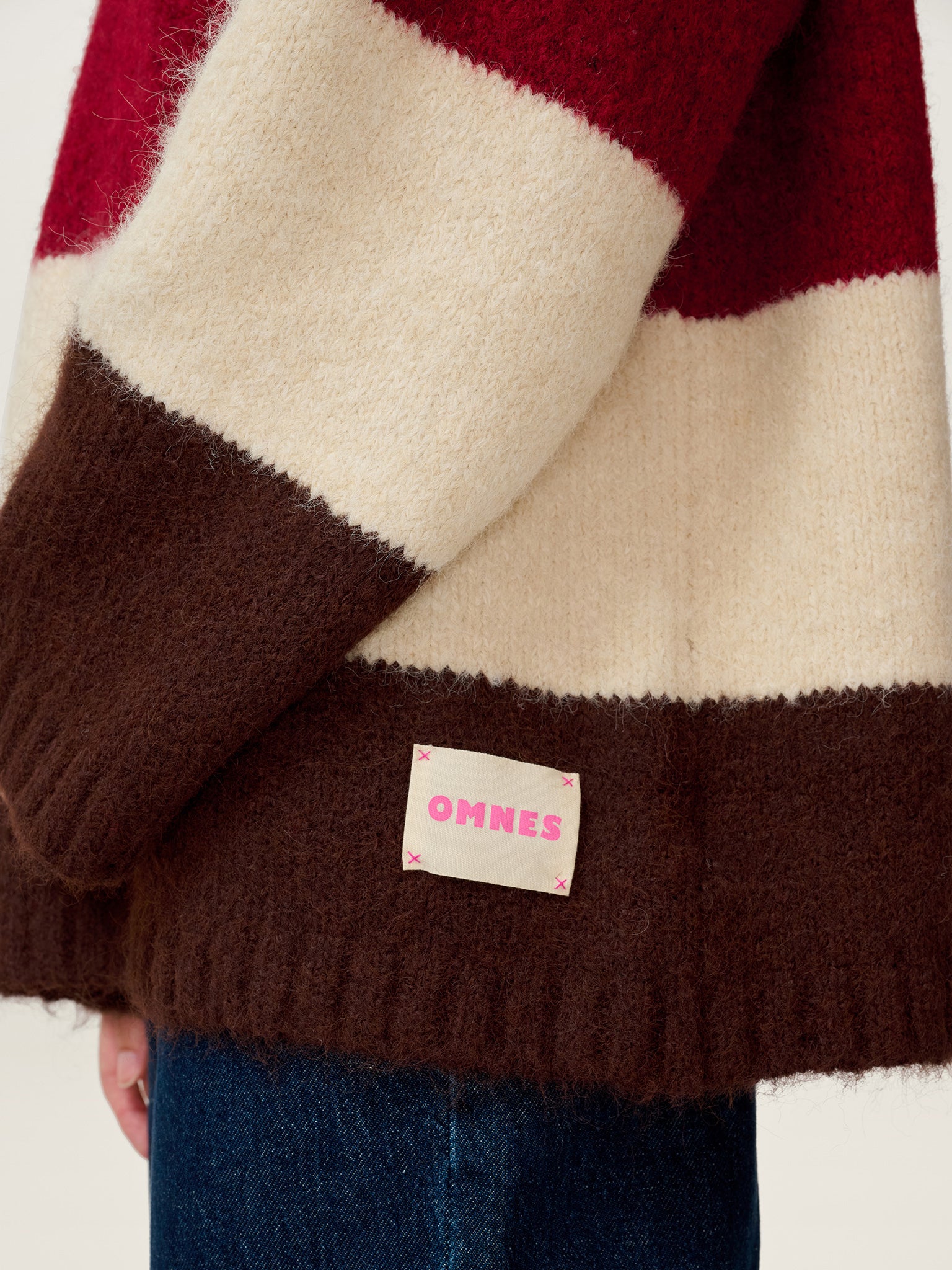 Constance is where purposeful design means playful simplicity. Crafted in a thick, heavy knit, this longline jumper features open sleeves and bold, warm-tone stripes in shades of chocolate, merlot, and cream. The relaxed silhouette and premium finish make it a standout layering piece; elevated in both look and feel. Part of our Studio OMNES collection, this piece is designed with a removable brand patch.