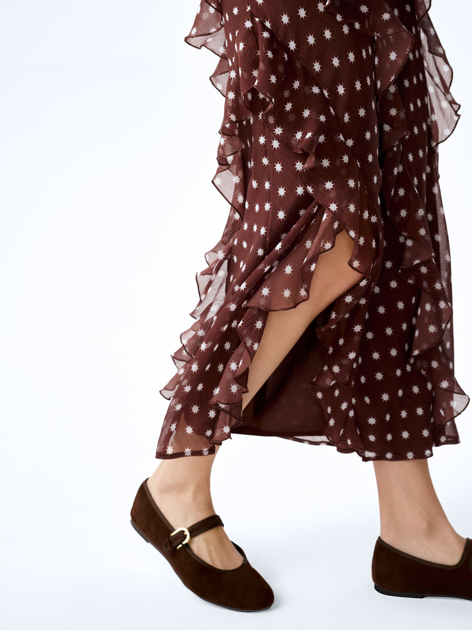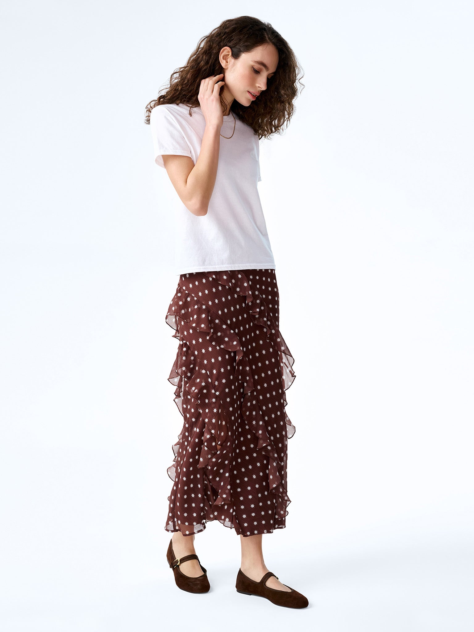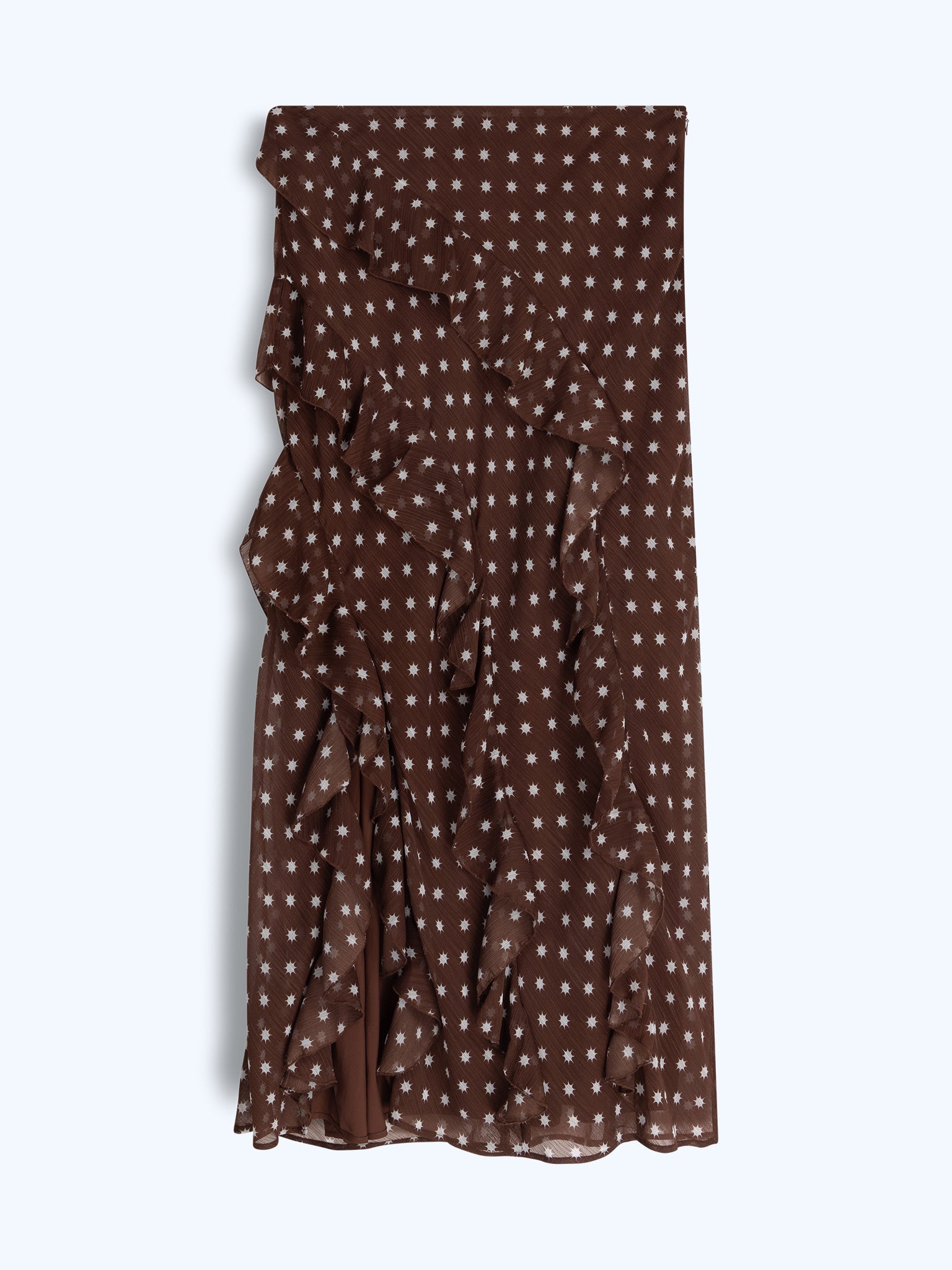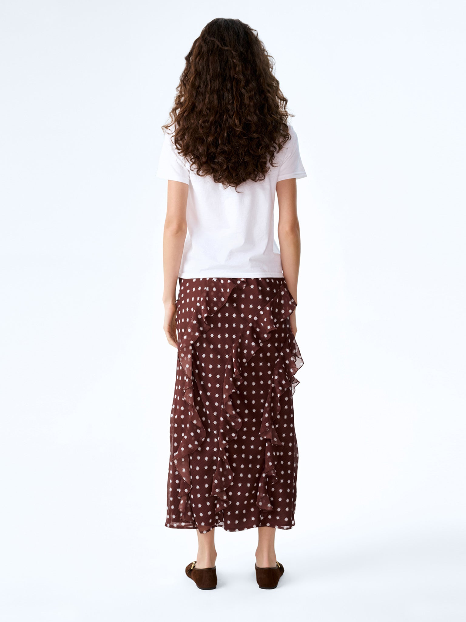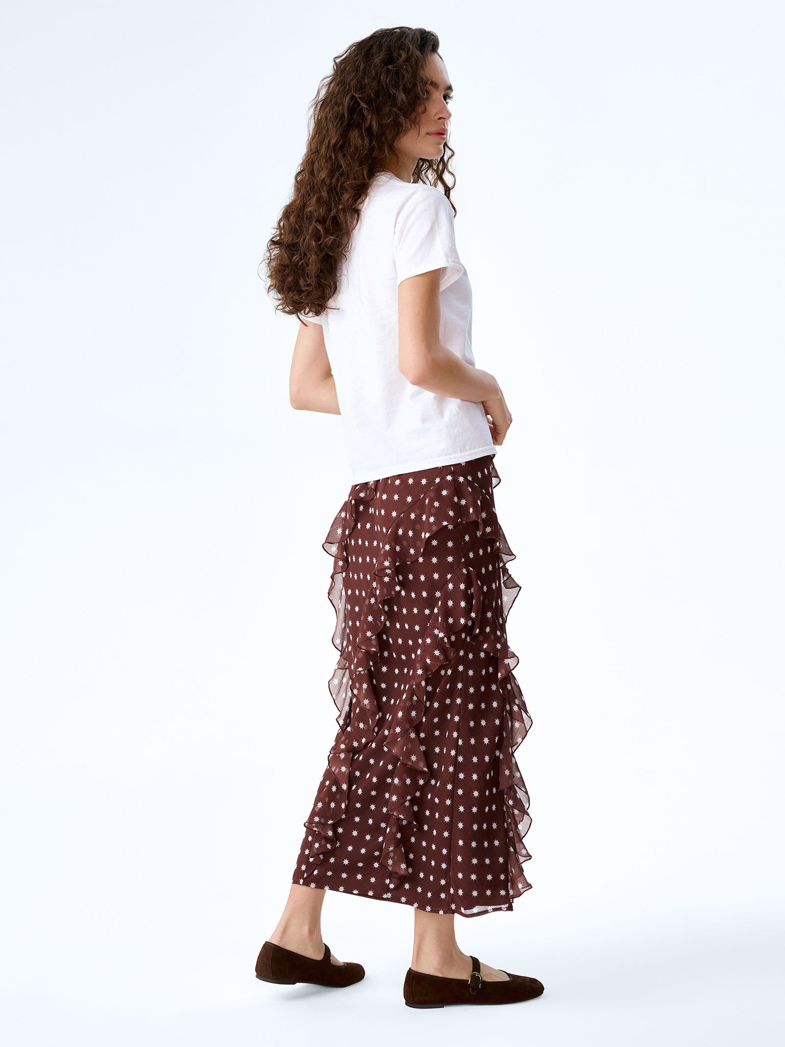 The Darline midi skirt is fantastically frilly, designed in lightweight chocolate chiffon with a delicate mini starburst print, it sits high on the waist for a flattering fit. An asymmetric frill adds soft movement, while the leg split brings an effortless, modern edge. Style it with the matching Francie Top for a cute occasion co-ord, or dress it down for easy, elevated dressing.