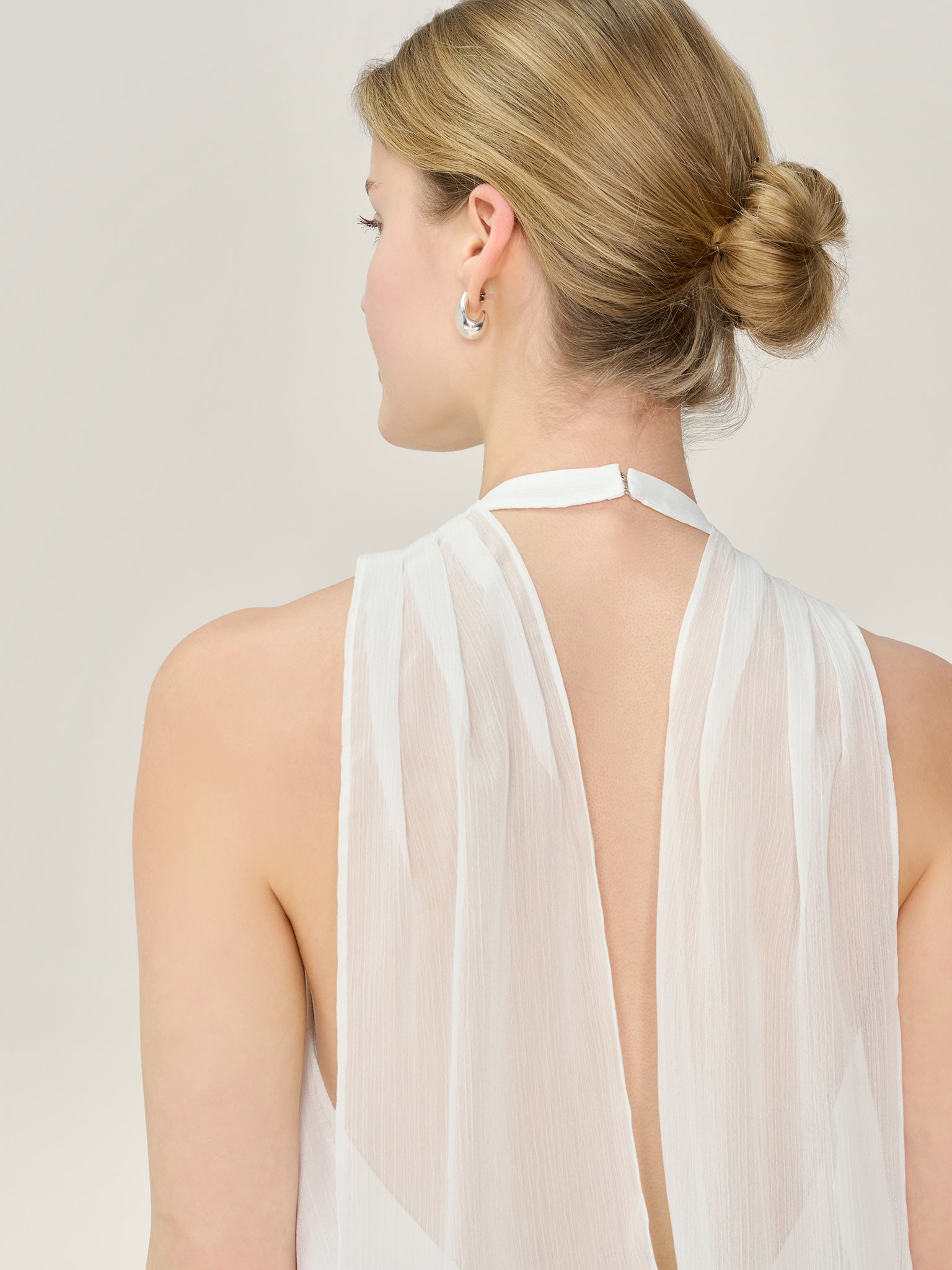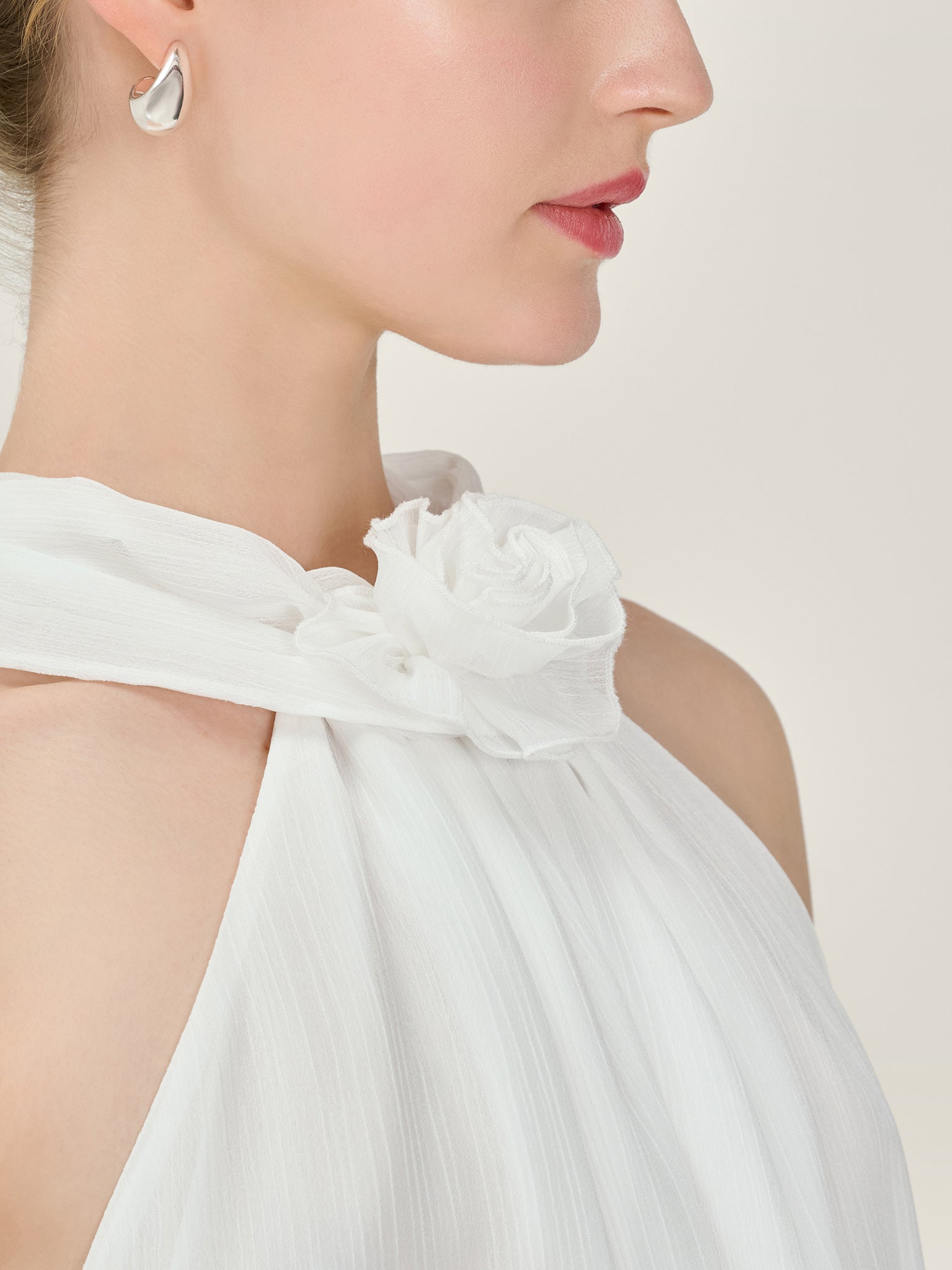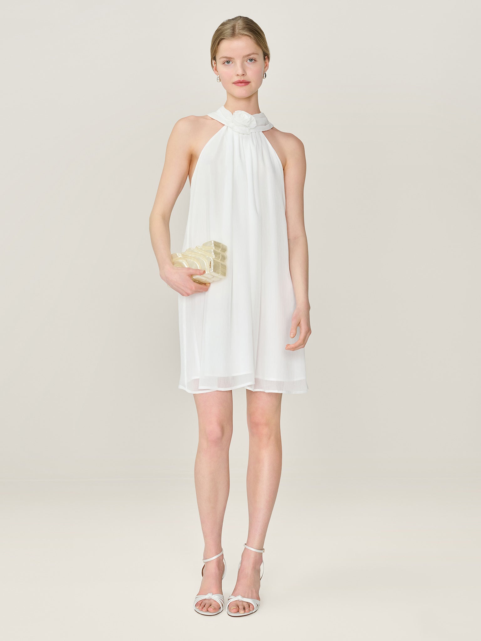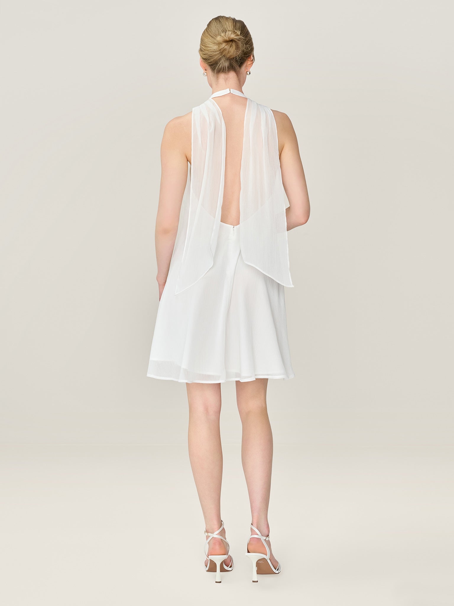 Demi is a playful yet polished ivory chiffon mini dress designed with a sleek high halter neckline. It features a statement rosette detail and a dramatic long tie at the neck that drapes dramatically down the back. The low back balances the soft romanticism with the contemporary finish. Light, feminine and made for engagement parties, honeymoons and more, Demi is part of our collection for modern brides.