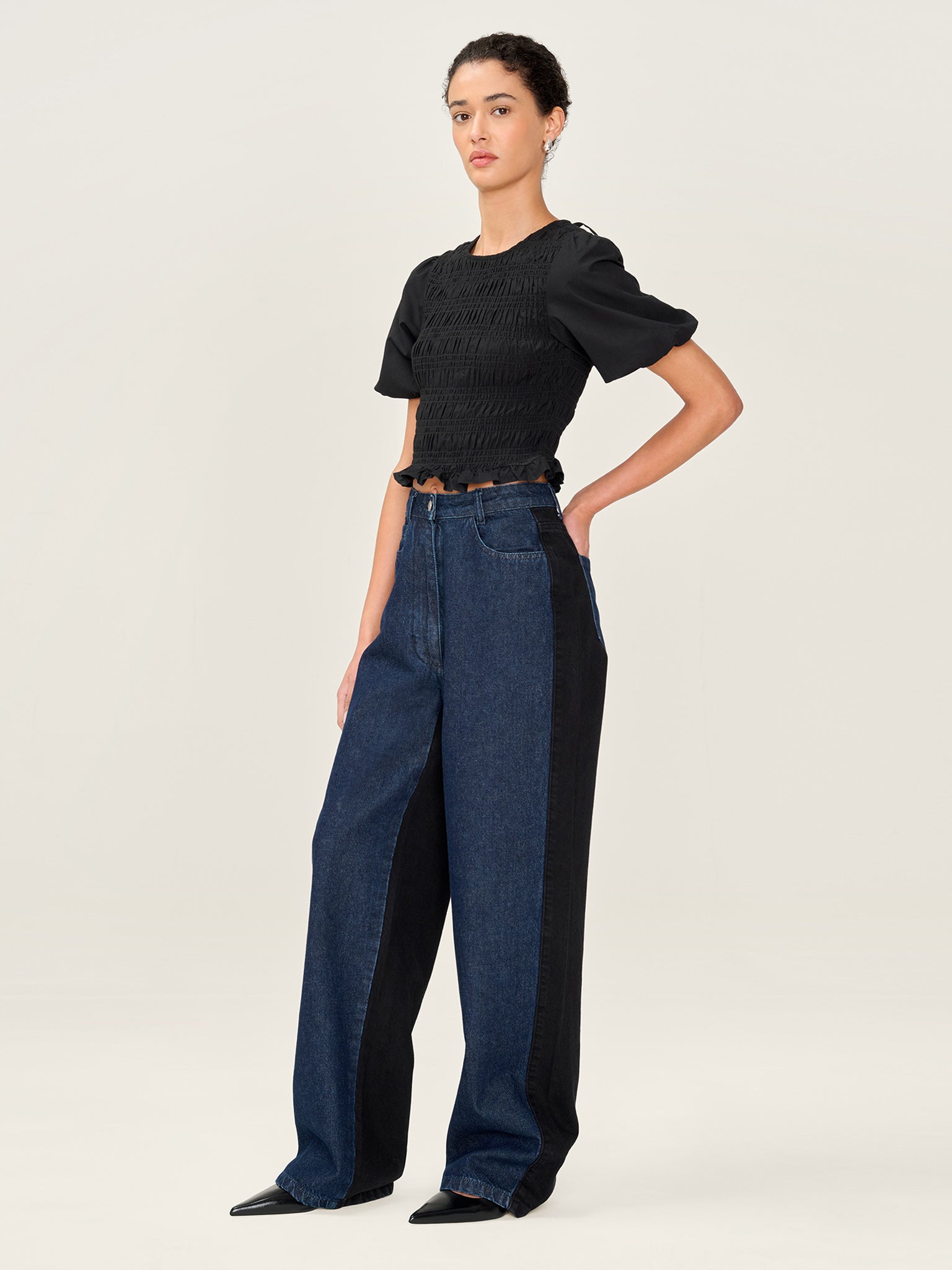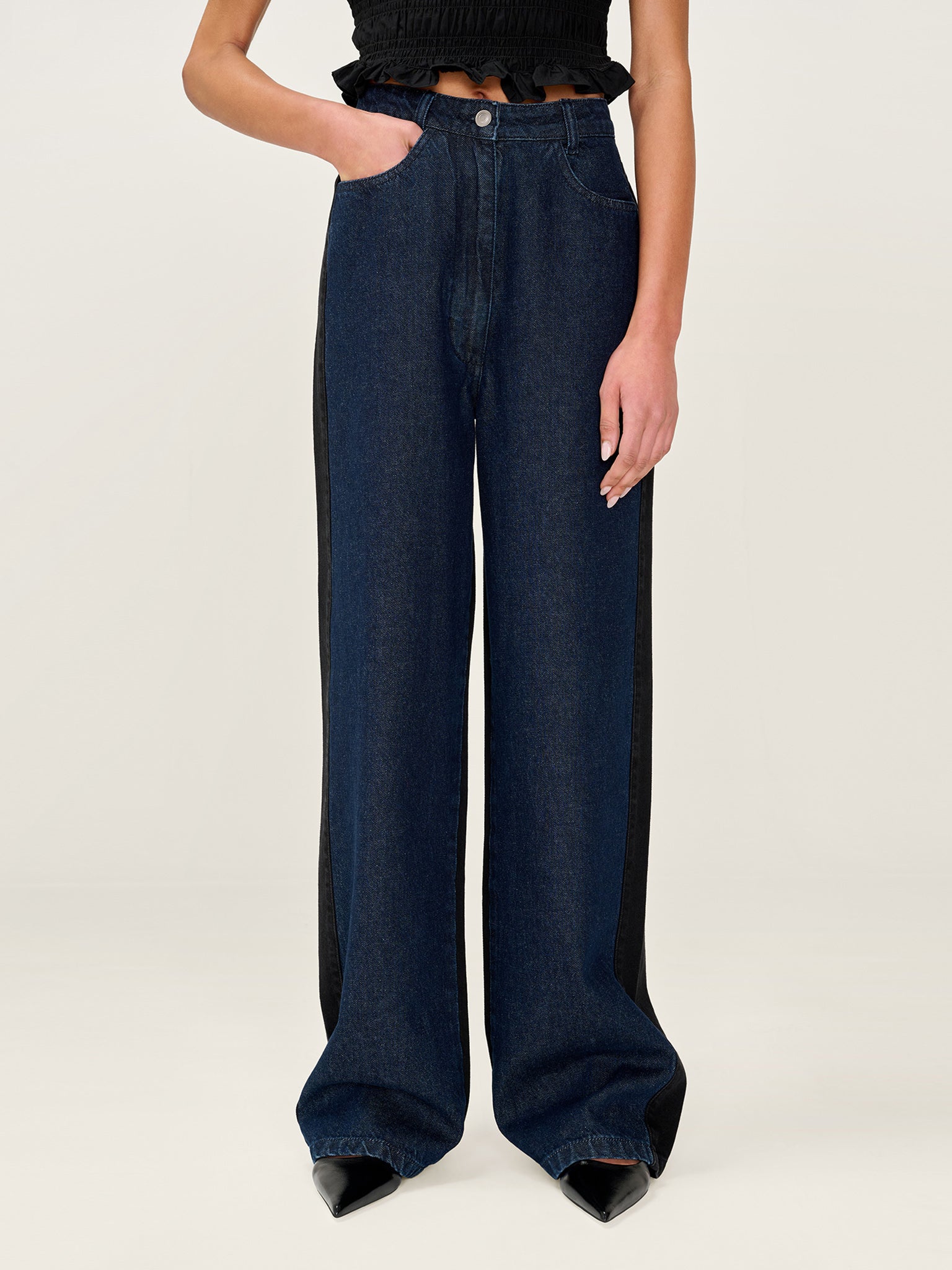 Designed with a high rise and relaxed wide leg, the Eddie jeans feature contrast wash panels in deep indigo and black for a graphic, directional edge. Finished with contrast back pockets, Eddie is the kind of jean that does all the talking.