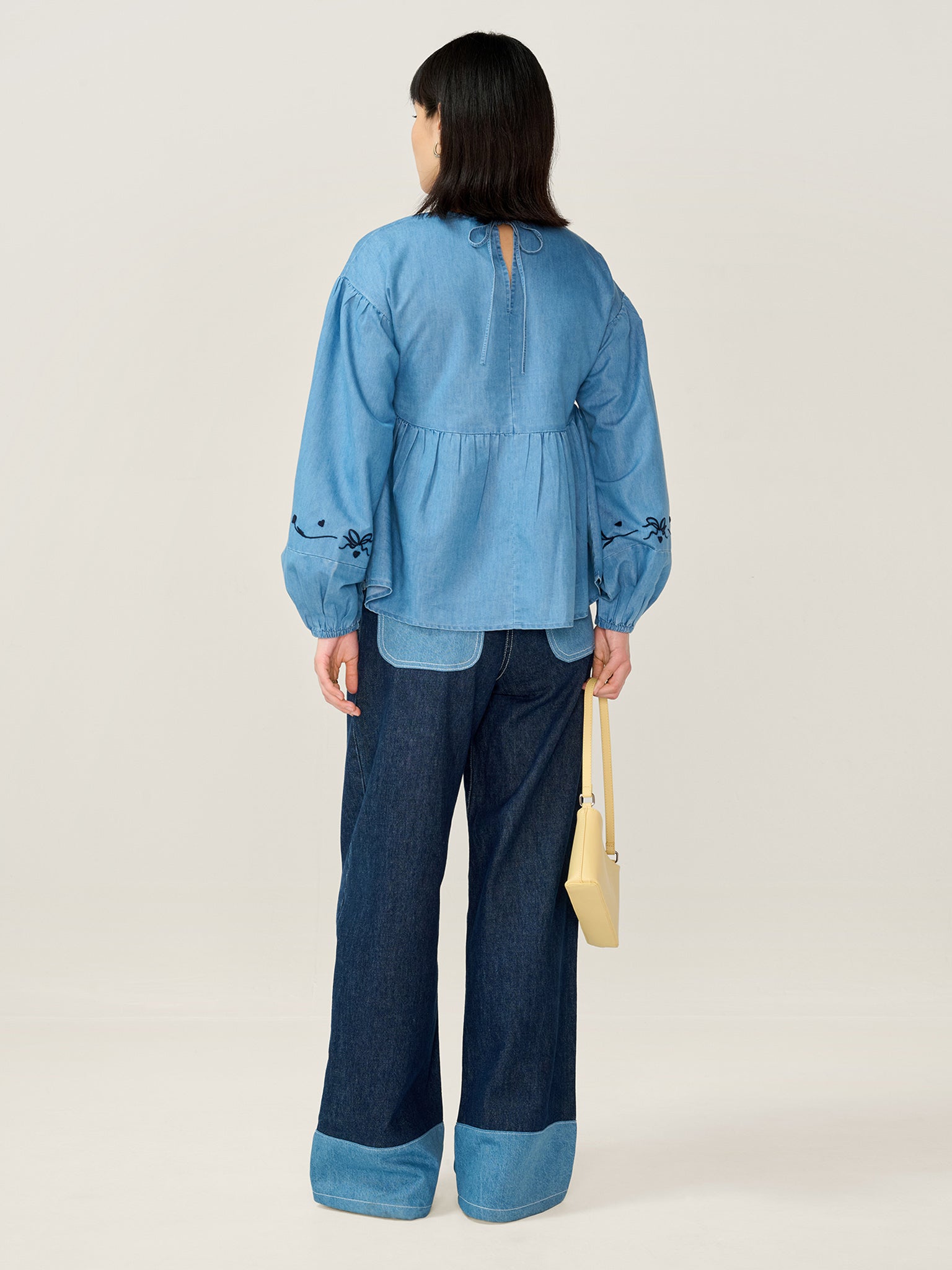 Elma brings a playful twist to everyday dressing. Crafted from soft chambray cotton, this long sleeve top is detailed with bow embroidery at the neck and sleeves for a sweet finish. Balloon sleeves and a subtle ruffle add volume and movement, making Elma an easy choice for when you want comfort with a little extra charm.