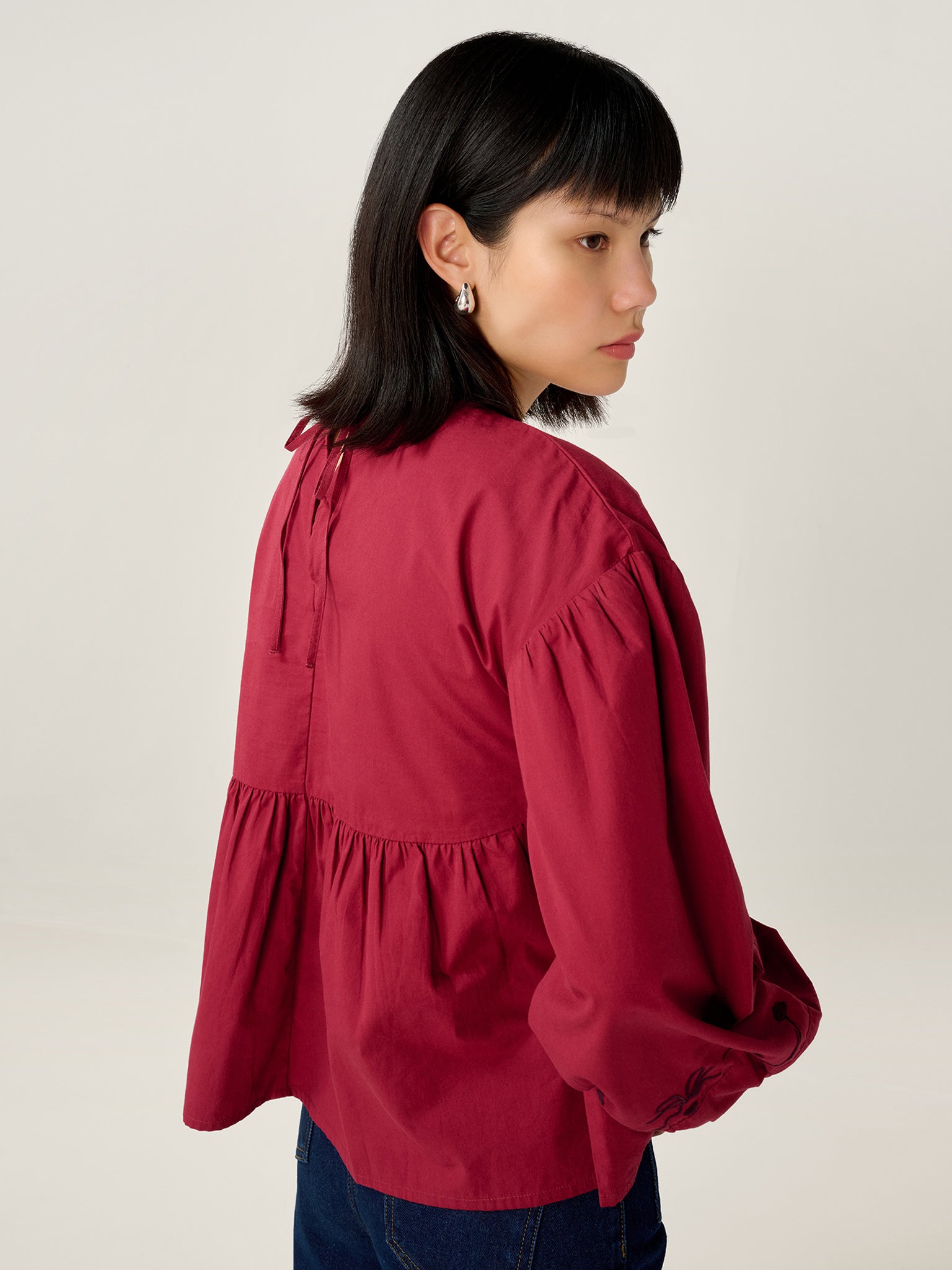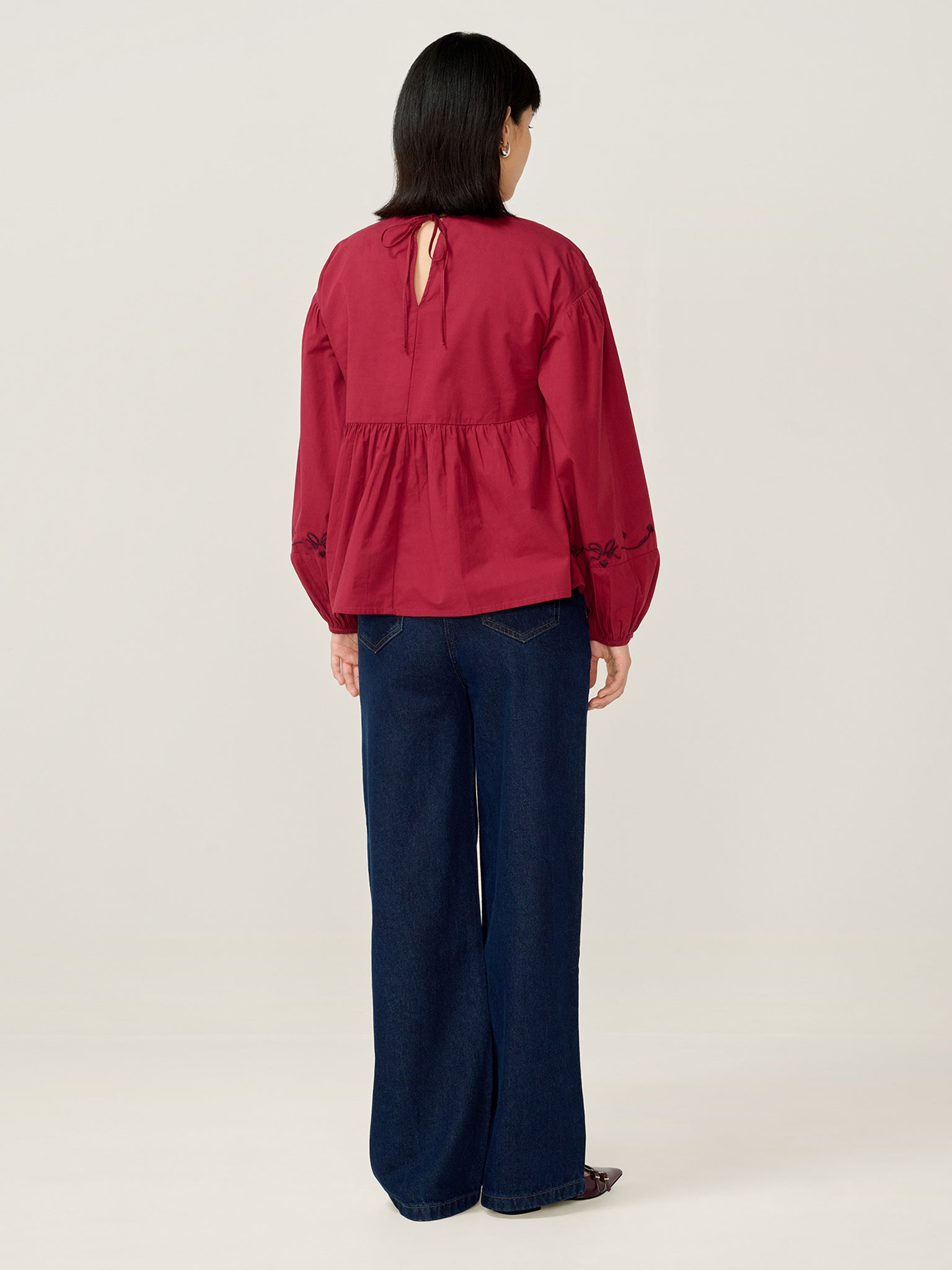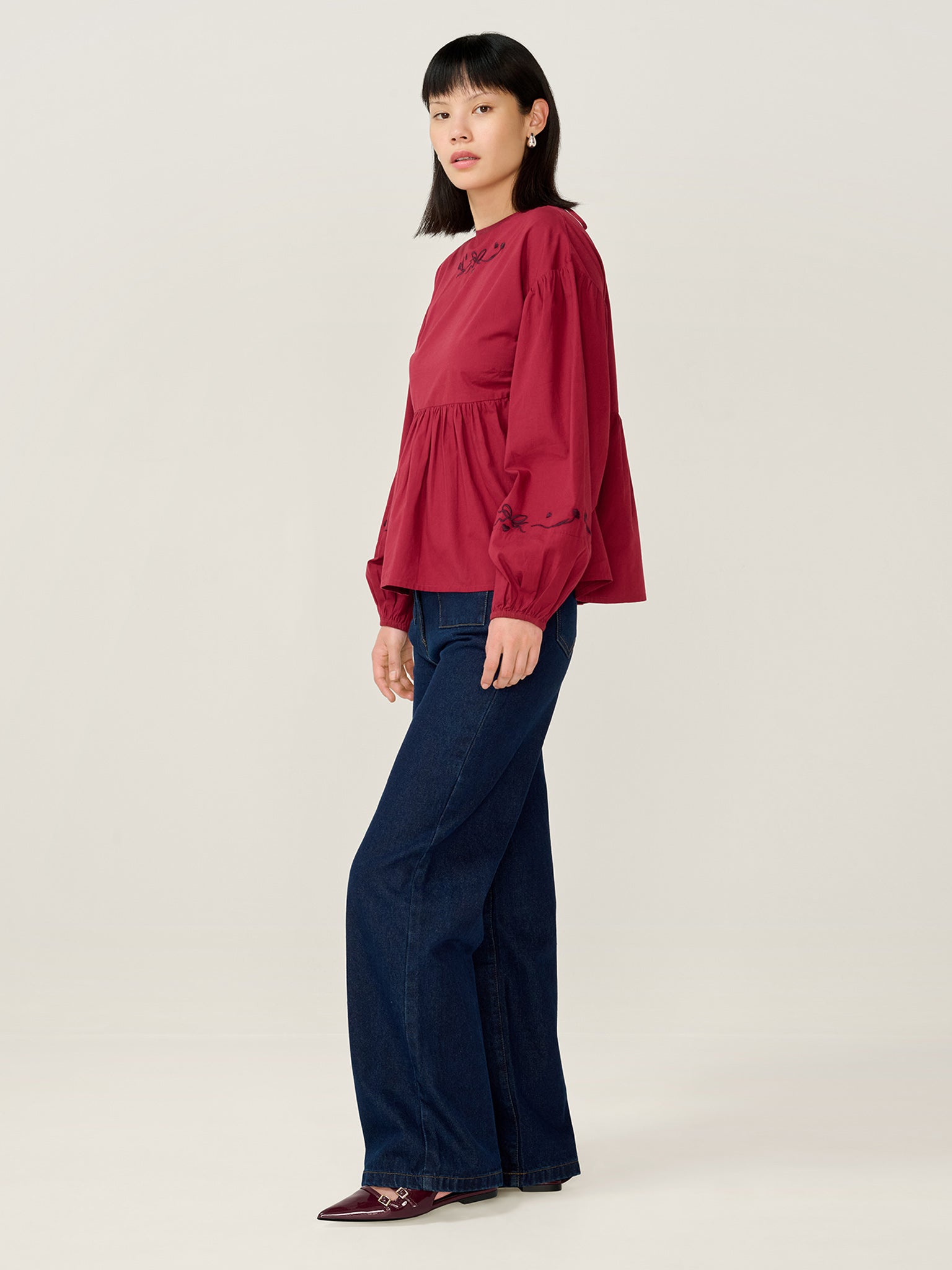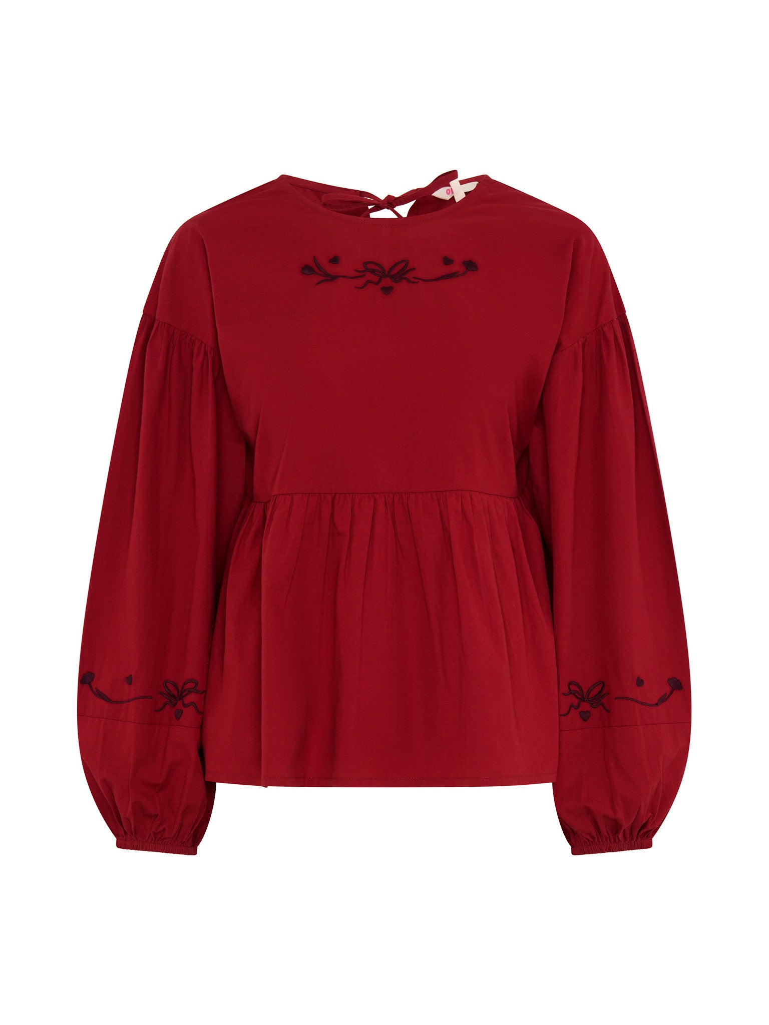 Elma brings a playful twist to everyday dressing. Crafted from rich merlot cotton, this long sleeve top is detailed with bow embroidery at the neck and sleeves for a sweet finish. Balloon sleeves and a subtle ruffle add volume and movement, making Elma an easy choice for when you want comfort with a little extra charm.