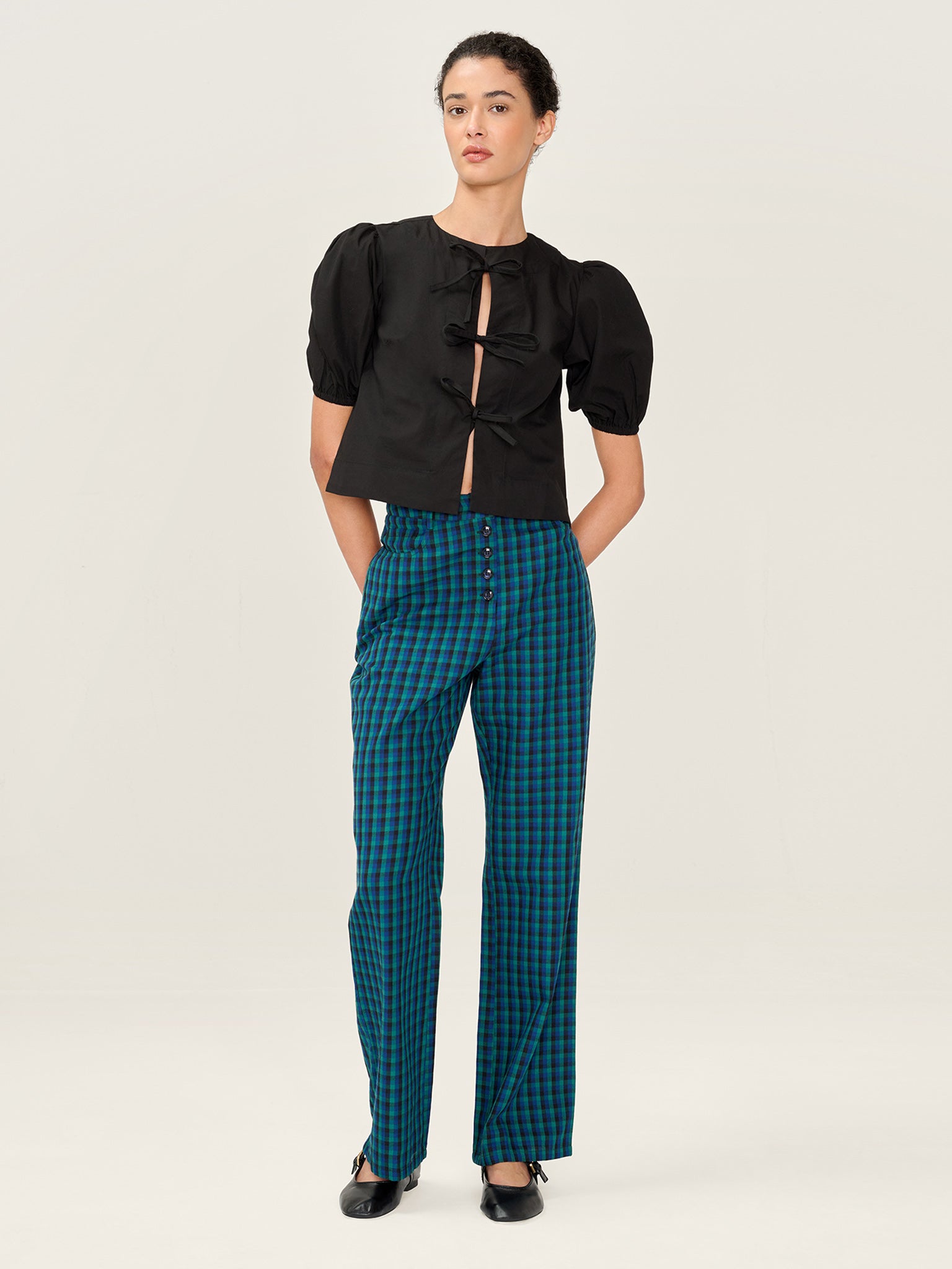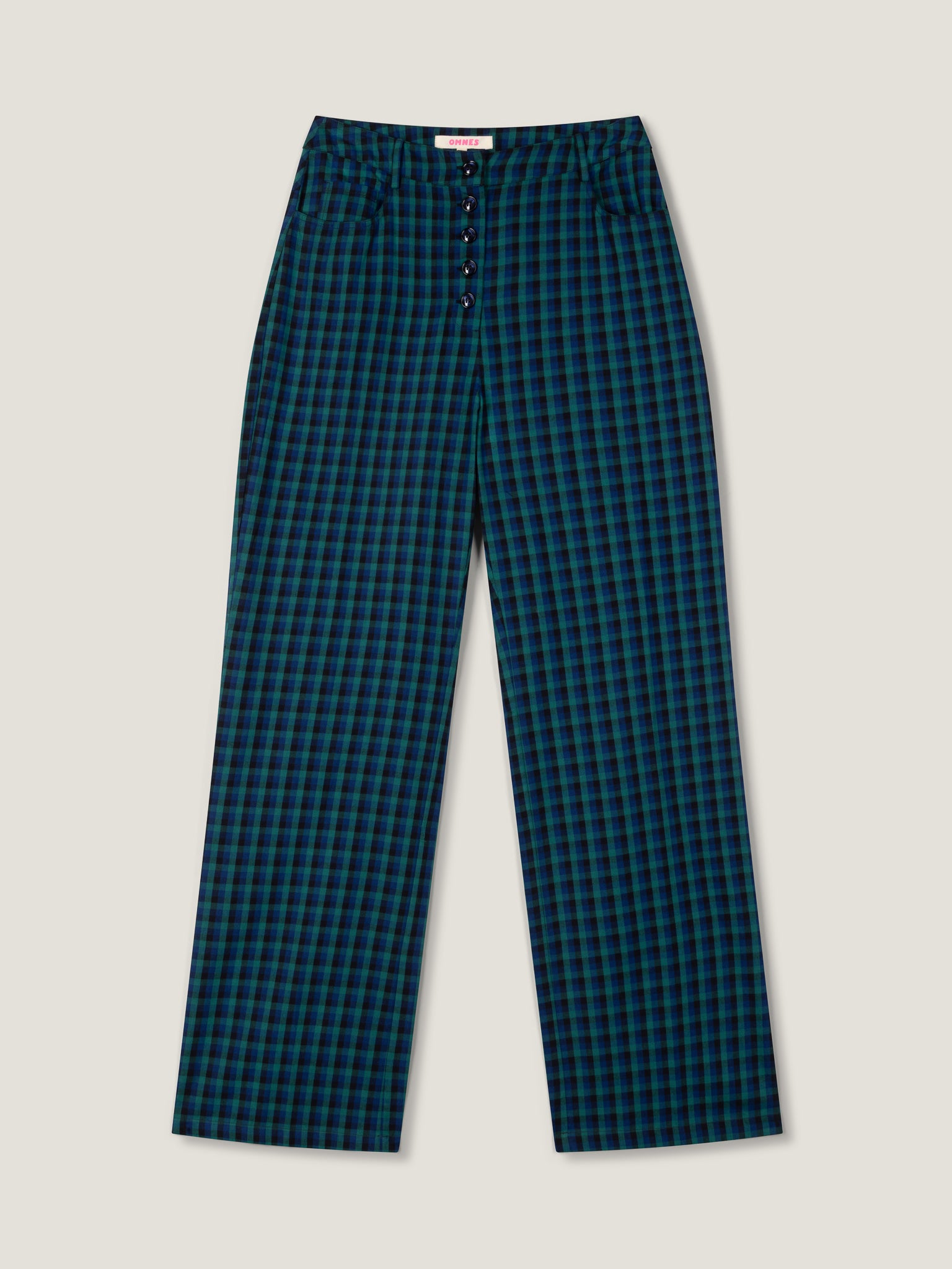 Designed in a charming blue and green check, Elodie is a high-waisted trouser with bags of personality. Fitted throughout, she’s straight-legged with a visible button fastening. Keep it simple with a plain tee or layer on the frills, light layers and more.
