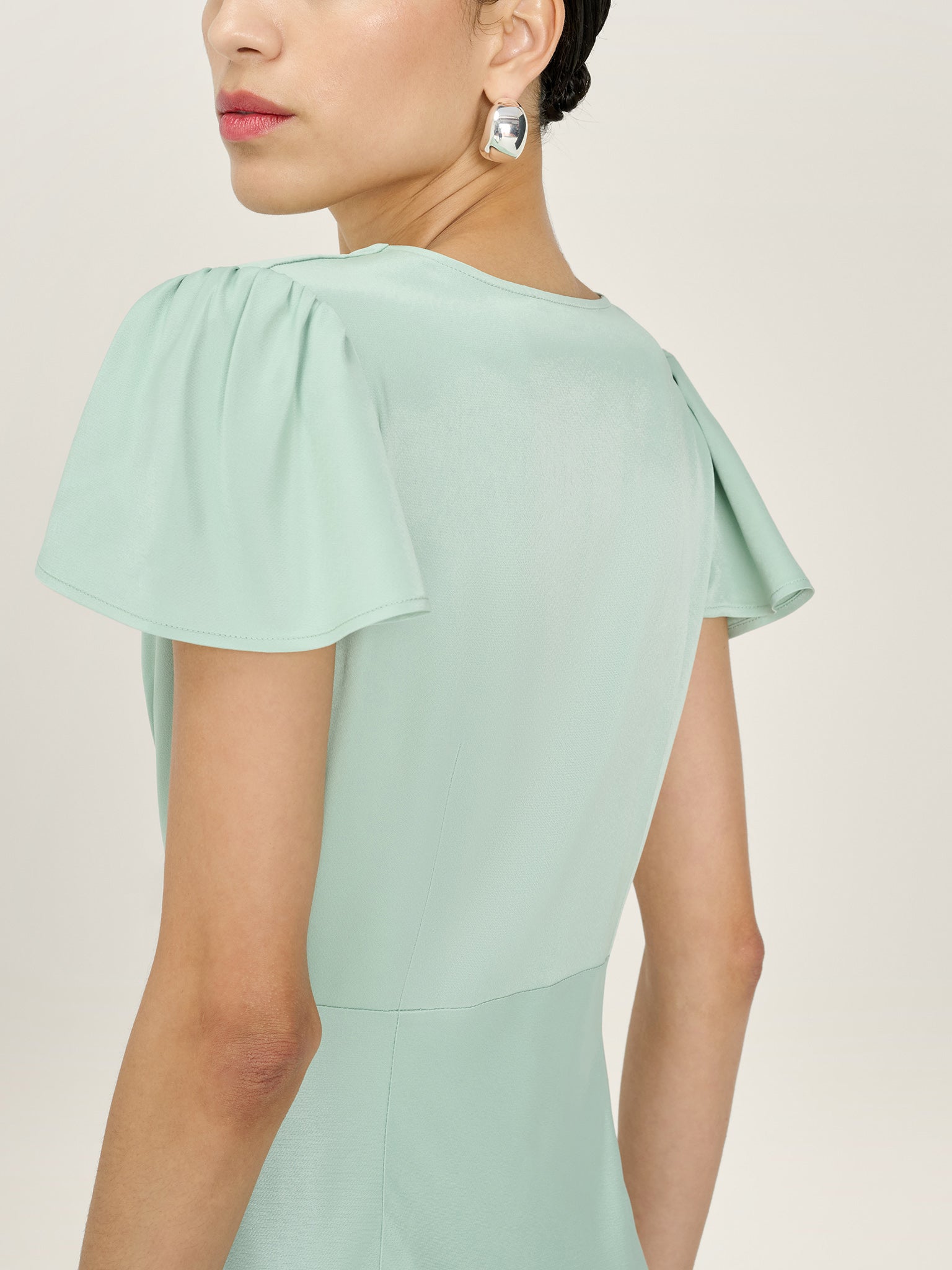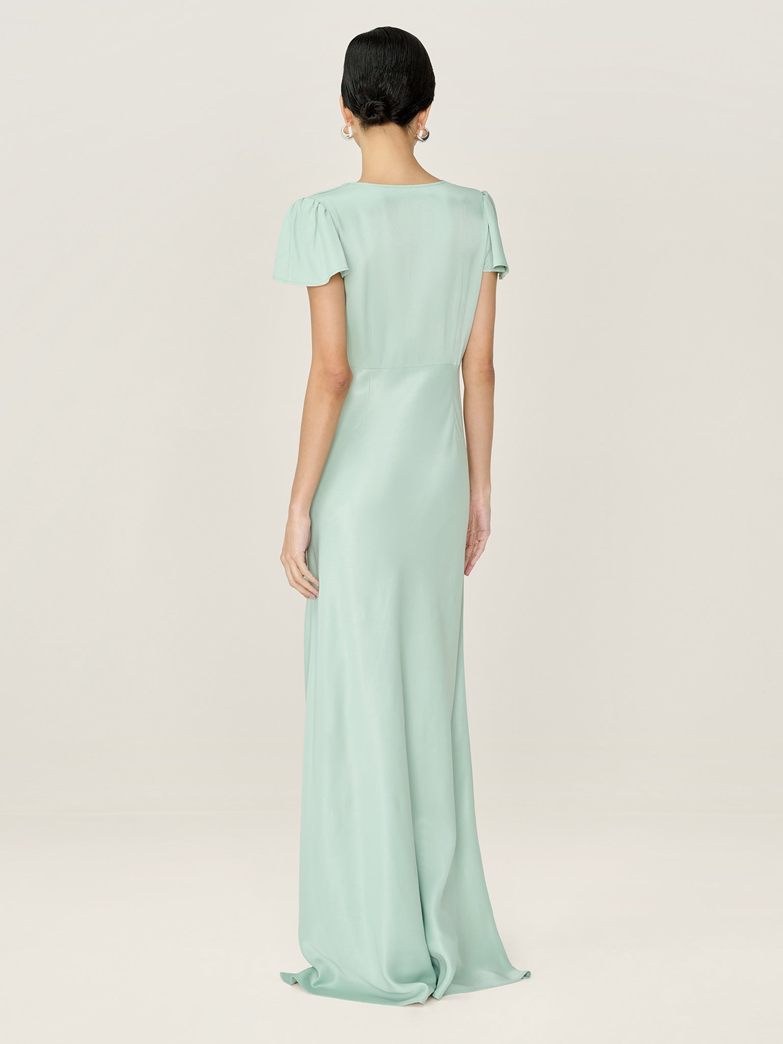 The Fai Dress offers effortless elegance, crafted from slinky viscose satin in sage green with a soft, light-catching sheen. It skims the silhouette cascading in a floor-length maxi dress that feels easy to wear and looks timeless. With a flattering V-neckline and delicate cap sleeve, Fai is designed with bridesmaids in mind but is equally headturning at any event.
