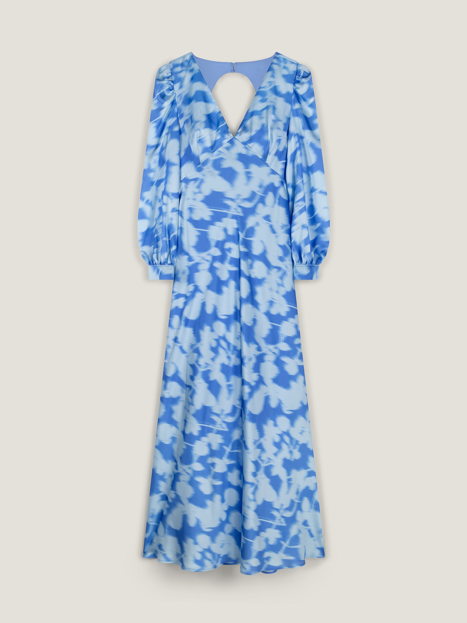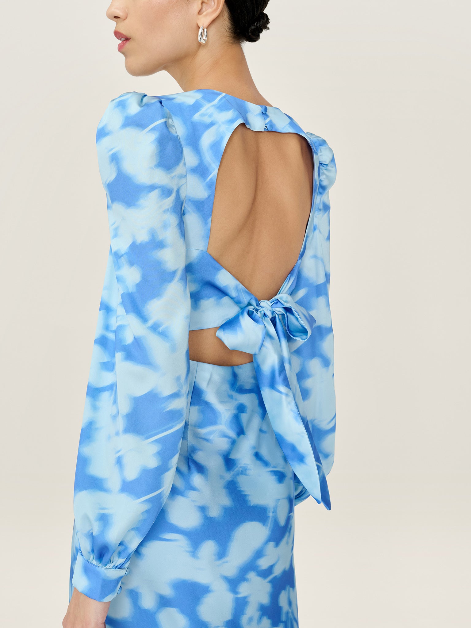Instantly charming thanks to an empire line cut, this Francoise satin midi dress is offset by long sleeves with elasticated cuffs. Designed with an open back with a sash tie and a button detail at the neck, this style effortlessly charms with a dreamy powder blue blurred floral print.