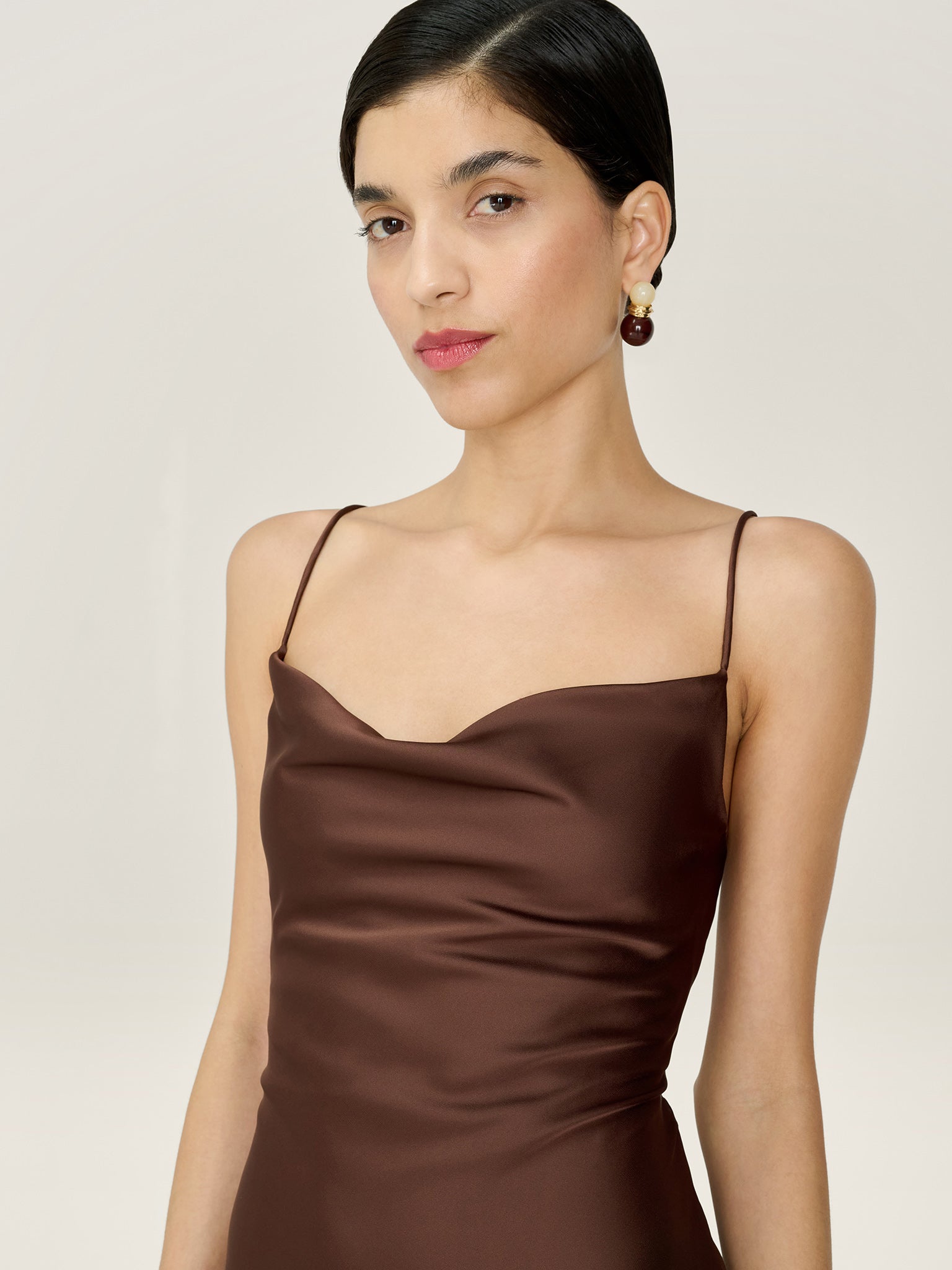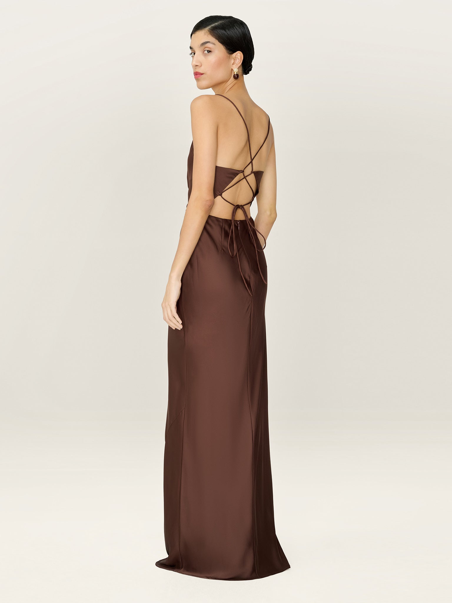 Ginny is the dreamiest of satin maxi dresses. She's got a delicate cowl neck and backless lace-up detail and is crafted from our signature slinky satin made using recycled polyester. In a sultry chocolate brown shade, Ginny is the perfect dress for when you feel like keeping it paired-back but chic.