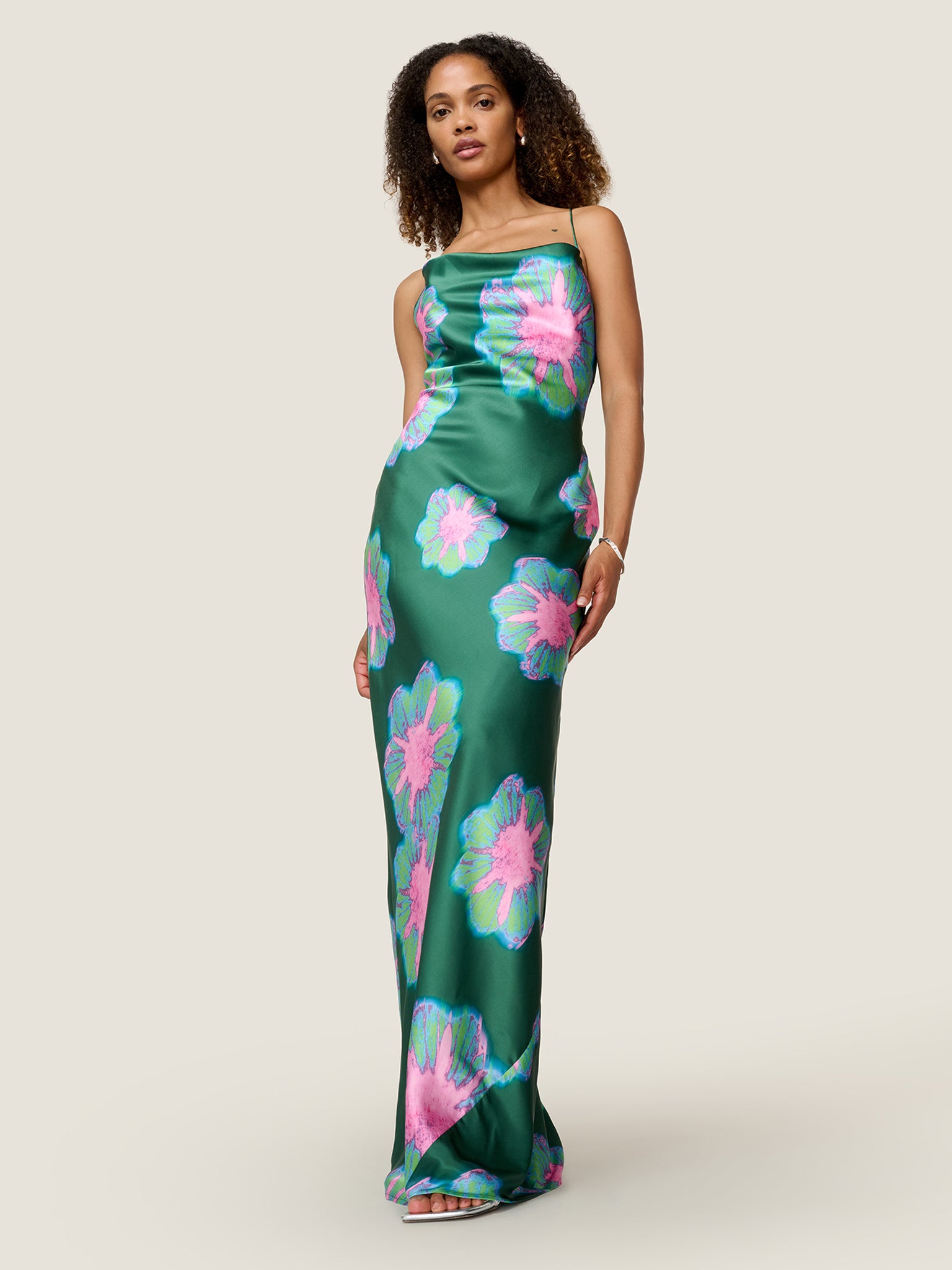 Ginny is designed to turn heads; featuring a fluid cowl neckline, open back, and delicate lace-up detail that flatters from every angle. Designed in a deep green hue with an all-over Cosmos floral print, it falls effortlessly to a maxi length for a striking silhouette. Ginny is the statement piece your wardrobe’s been waiting for.