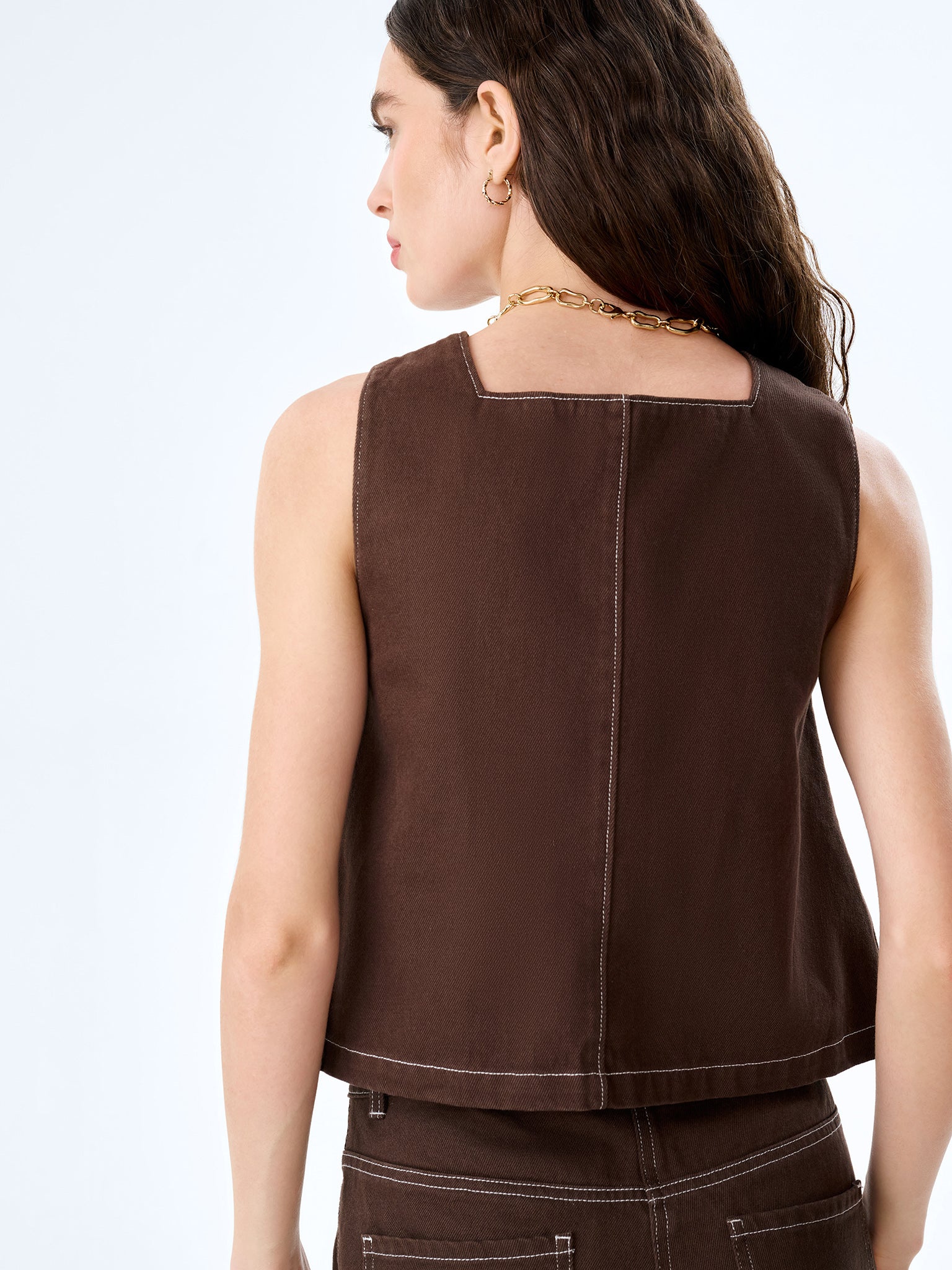 The Kiri top is a modern staple designed to elevate everyday denim. Crafted from structured chocolate denim, this denim tank features a clean square neckline and subtle contrast stitching for a contemporary finish. The A-lined silhouette skims the torso, making it perfect for effortless day-to-night styling. Pair it with the matching Orielle Jeans for a structured denim co-ord, or style with classic separates for an easy, wearable look.