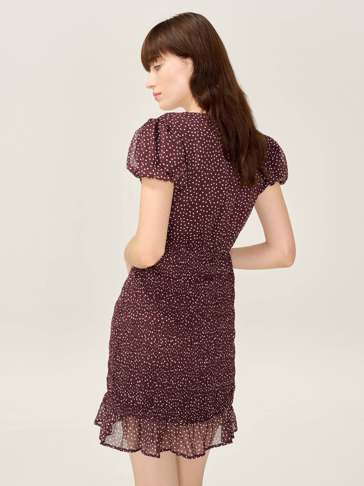 Kristen is a romantic mini dress crafted from lightweight chiffon in a warm chocolate polka dot print. Designed with a shirred skirt for a comfortable, form-flattering fit, it features a feminine frill hem that adds soft movement. The deep V-neckline creates a striking silhouette, while the puff sleeves bring a vintage-inspired touch. Perfect for date nights or daytime events, this chiffon mini dress blends effortless style with playful charm.