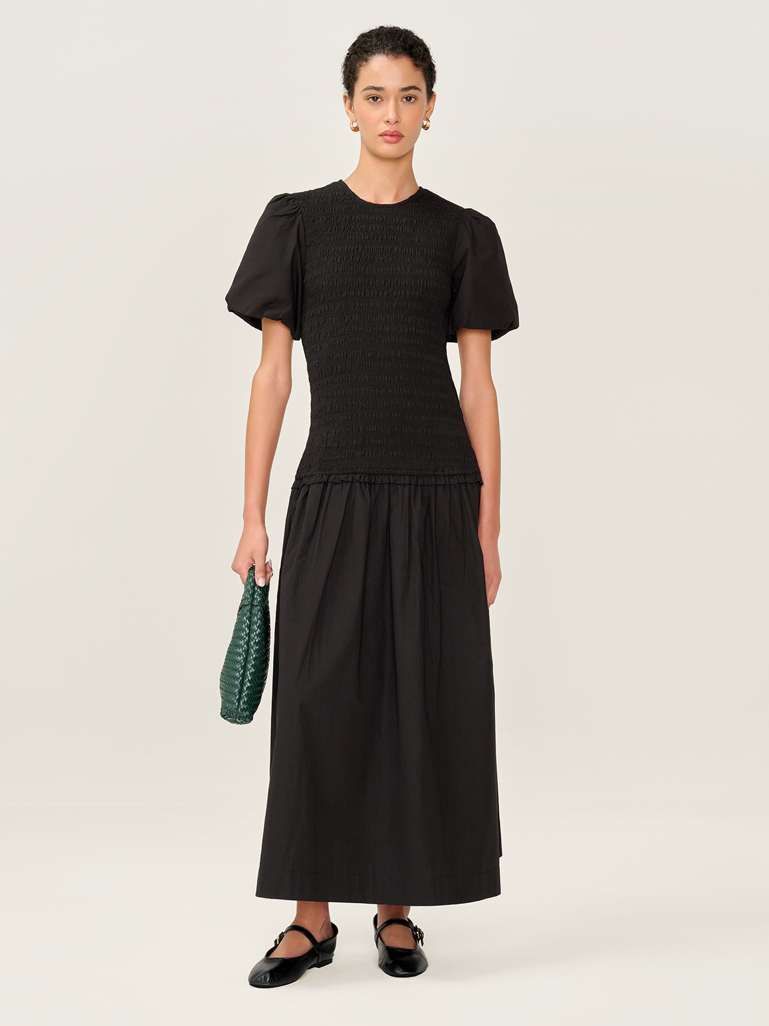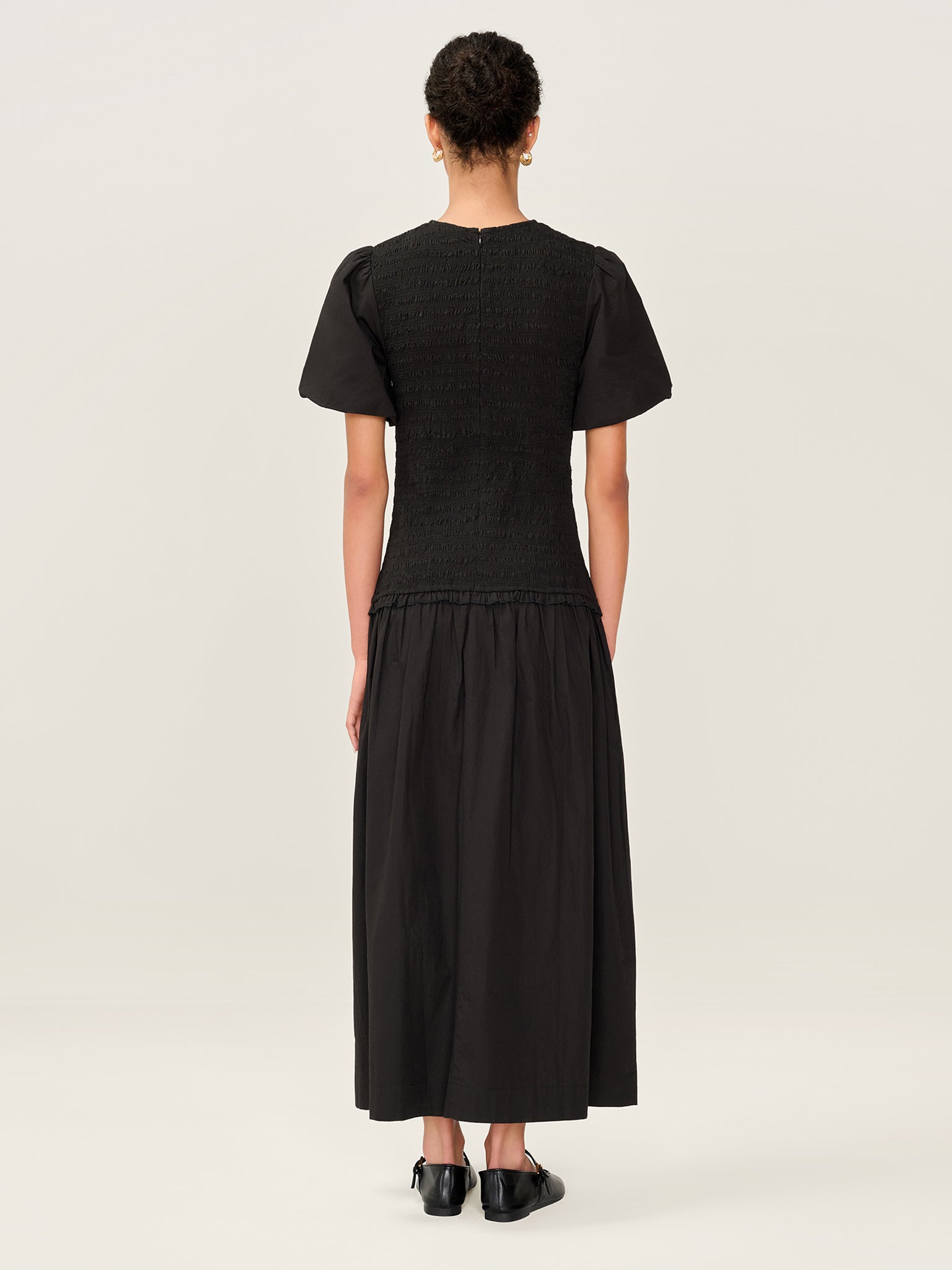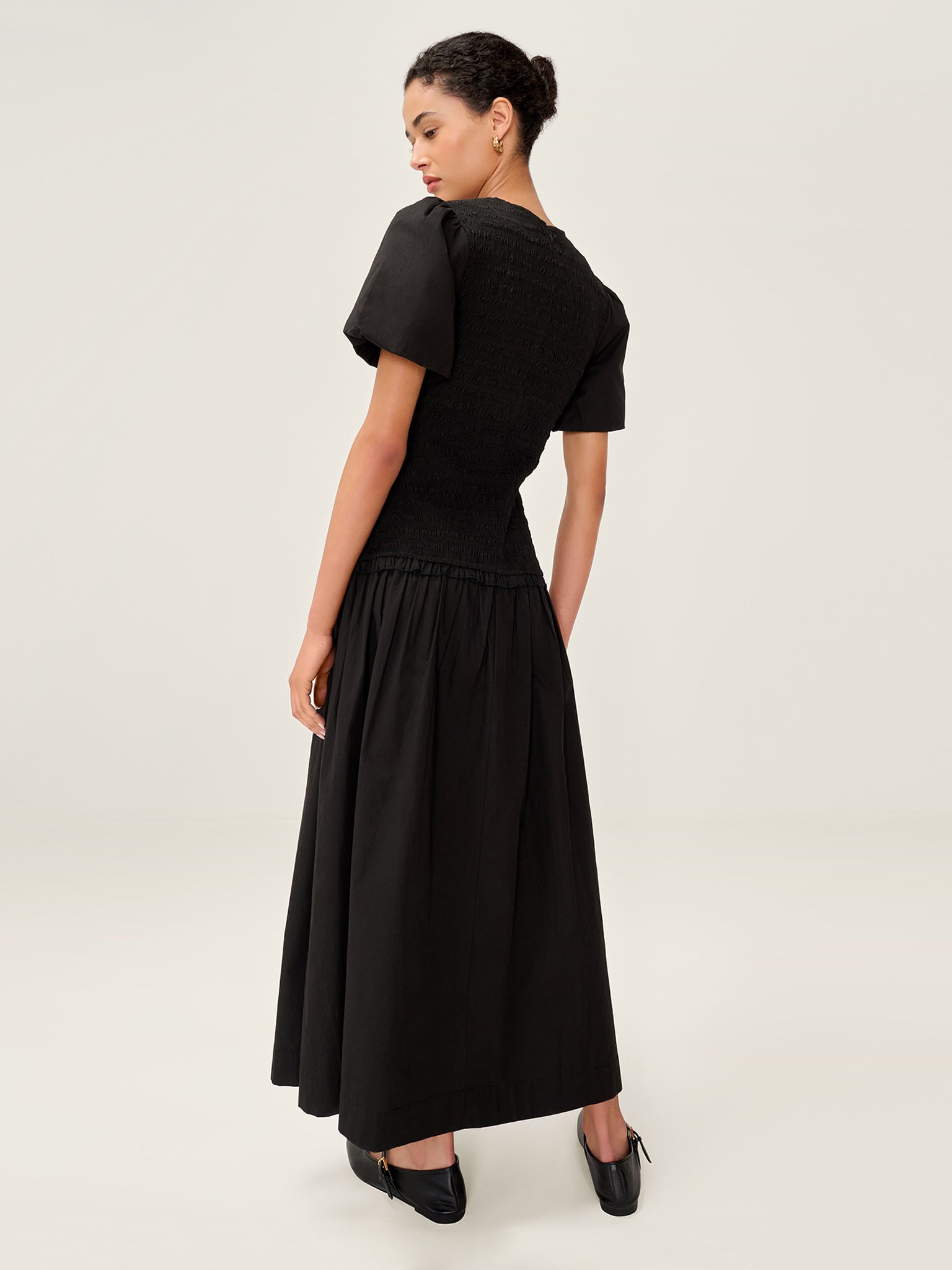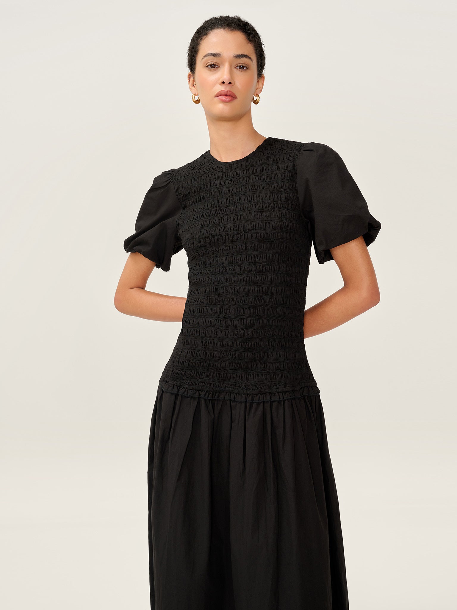 Aria is all about easy charm. In classic black, this cotton midi dress features a shirred top for a comfortable, flattering fit. A playful drop waist is finished with a mini frill for added movement, while puff sleeves add volume and a touch of romance. The soft cotton texture makes Aria perfect for all year round styling.