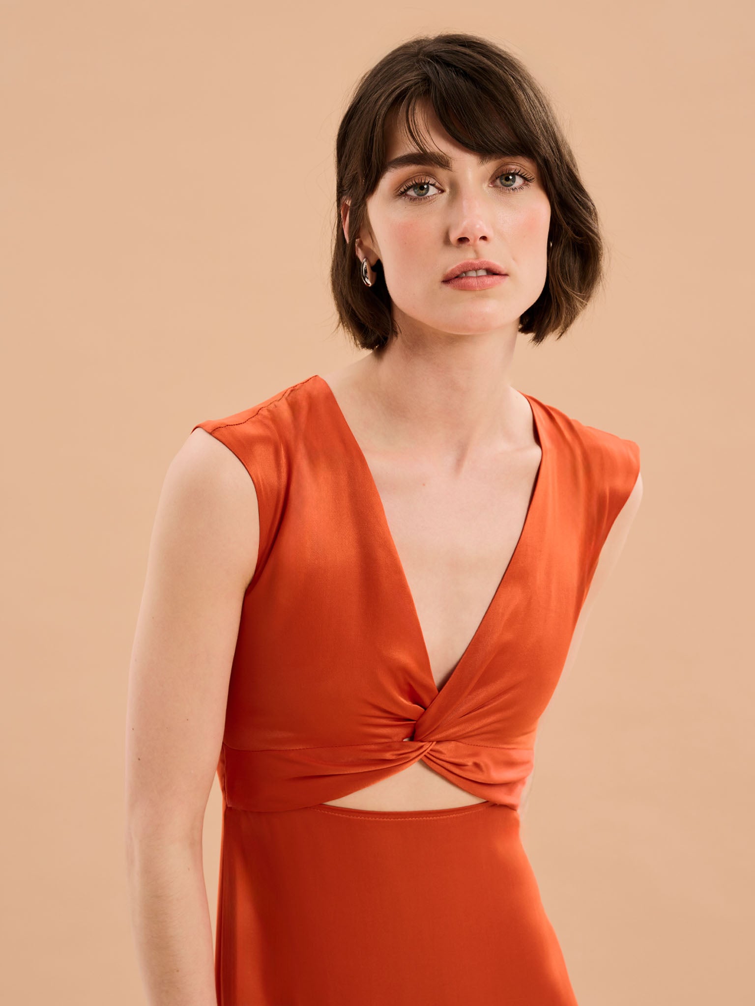 A little something extra. The Marin is your perfect sustainable satin occasion dress but with a twist front, v-neck and cutout under the bust. Crafted in rich burnt orange with a peek-a-boo cut-out detail at the back, she is giving a fresh take on a classic silhouette.