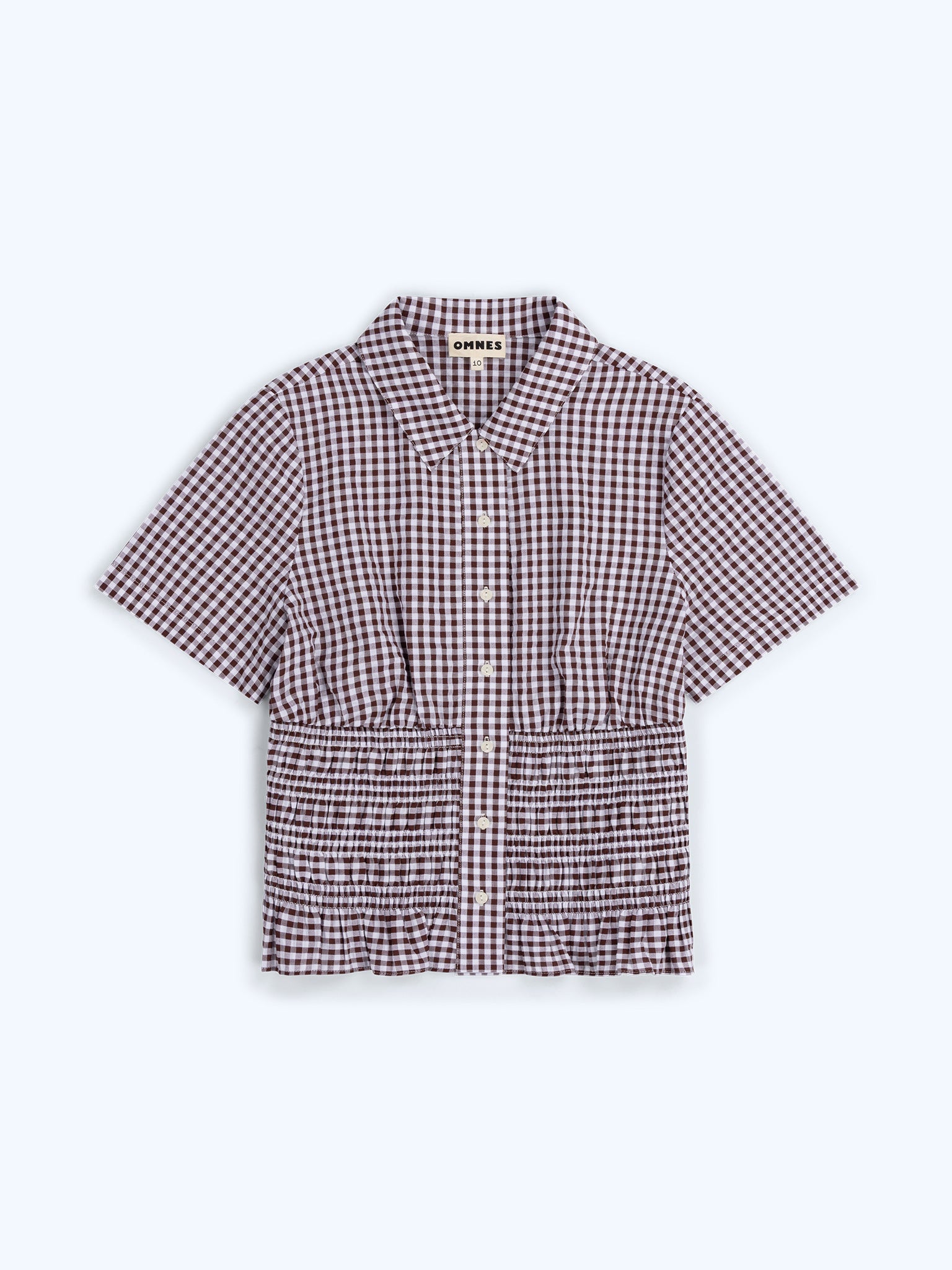 The Merida blouse is a fresh take on classic tailoring. Crafted from textured chocolate seersucker gingham, it features a collared neckline and short sleeves, balanced by a softly shirred waist that defInez the waist. Finished with a playful frill hem and mock pearl buttons, Merida is polished yet easy, perfect for dressing up your daily rotation.