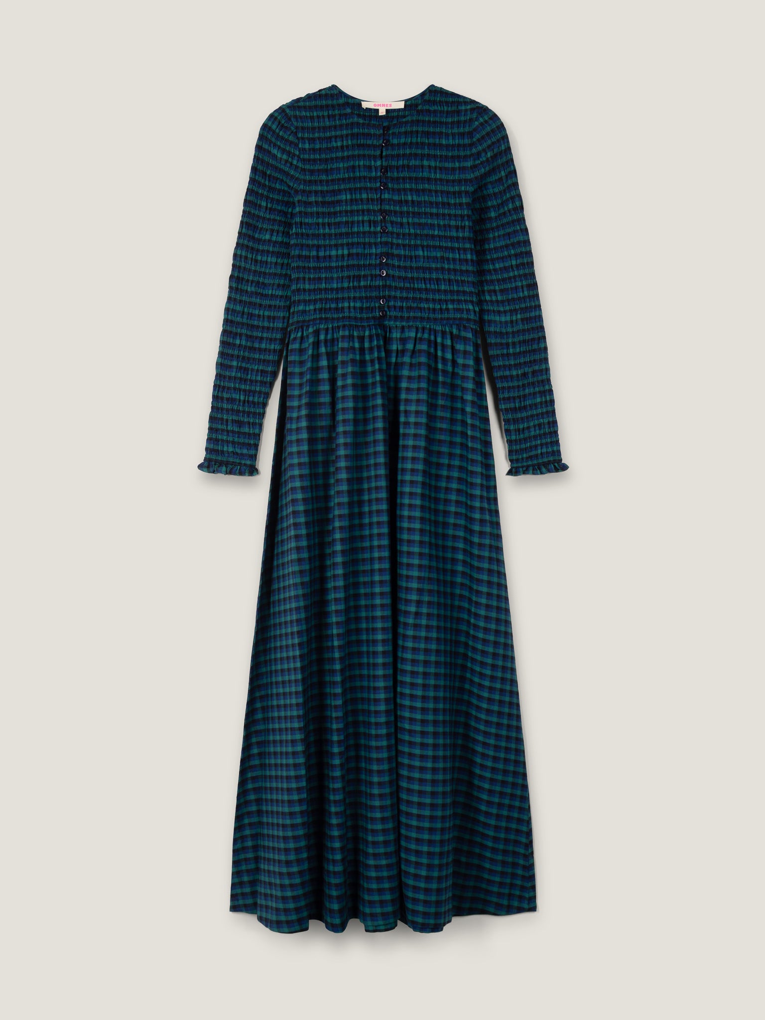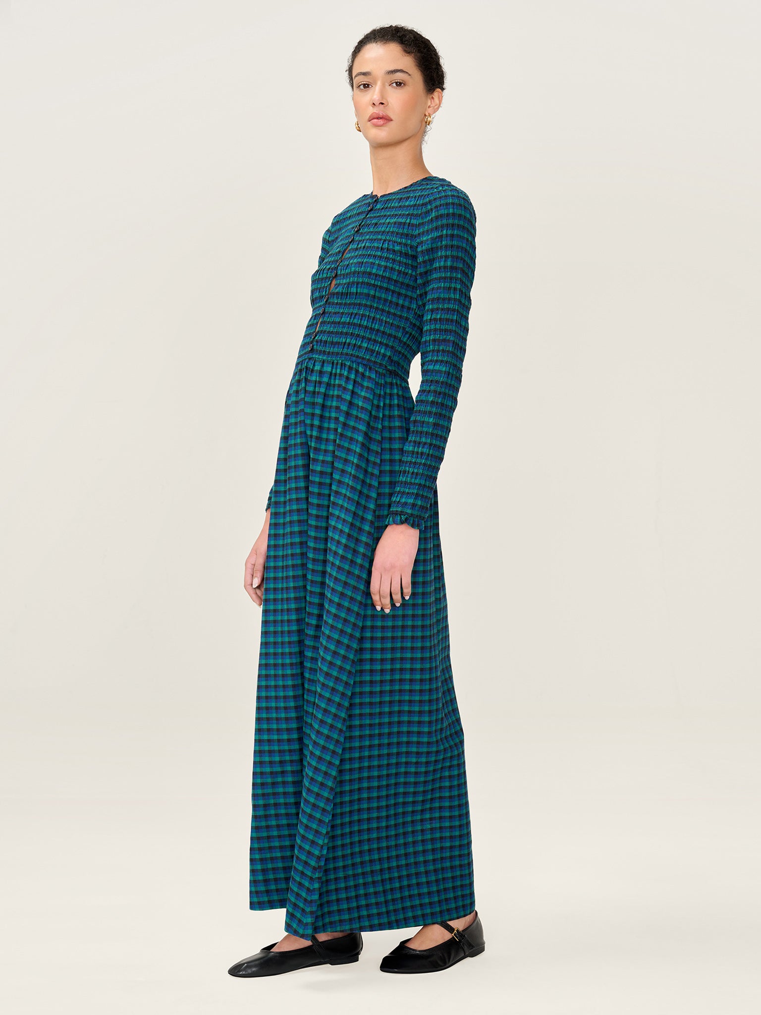 Full of delicate details, the Mina Dress is crafted from soft cotton in a dreamy blue and green check print. The shirred bodice and sleeves offer a comfortable, flattering fit, while button detailing adds vintage-inspired charm. A full midi-length skirt creates easy movement, and a subtle ruffle at the sleeve adds a feminine finishing touch. Perfect for transitional dressing, Mina brings playful polish to your everyday wardrobe.