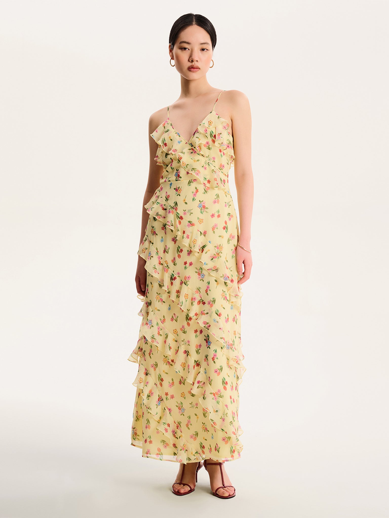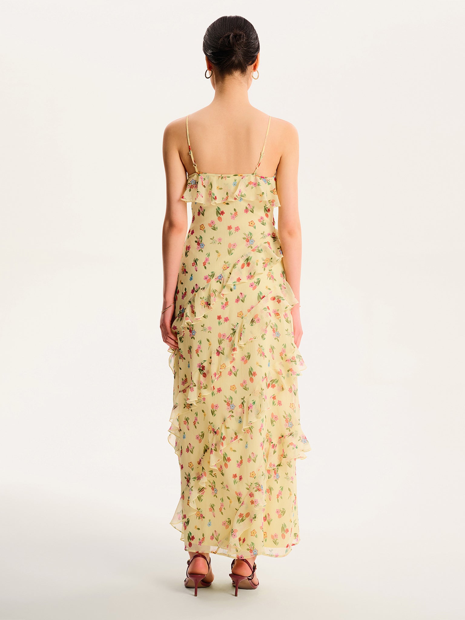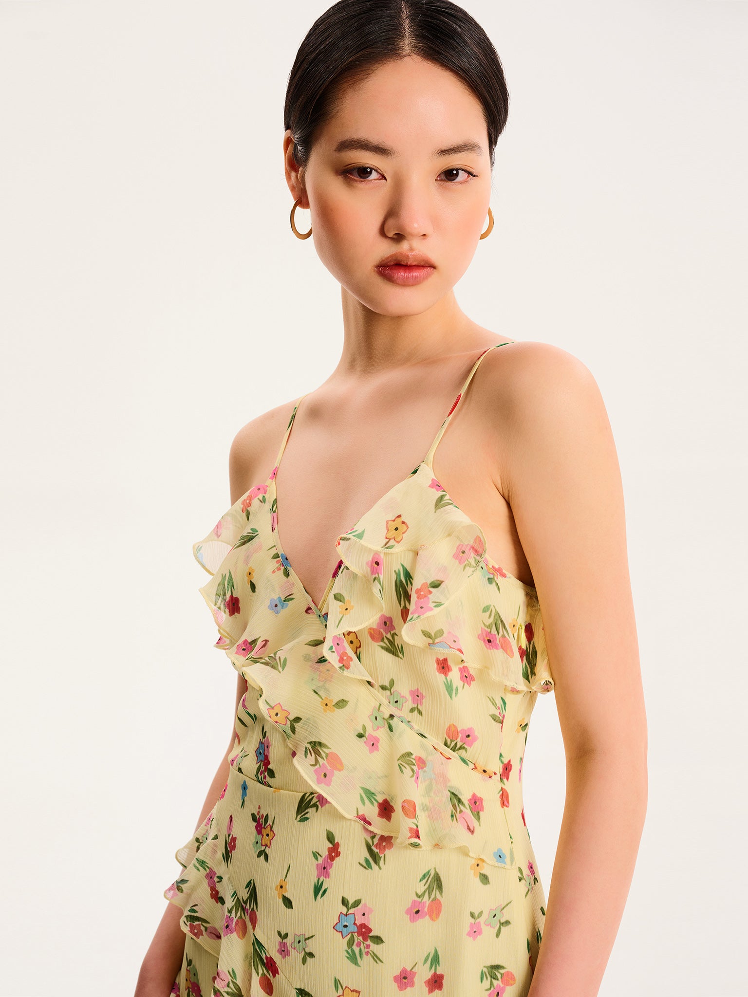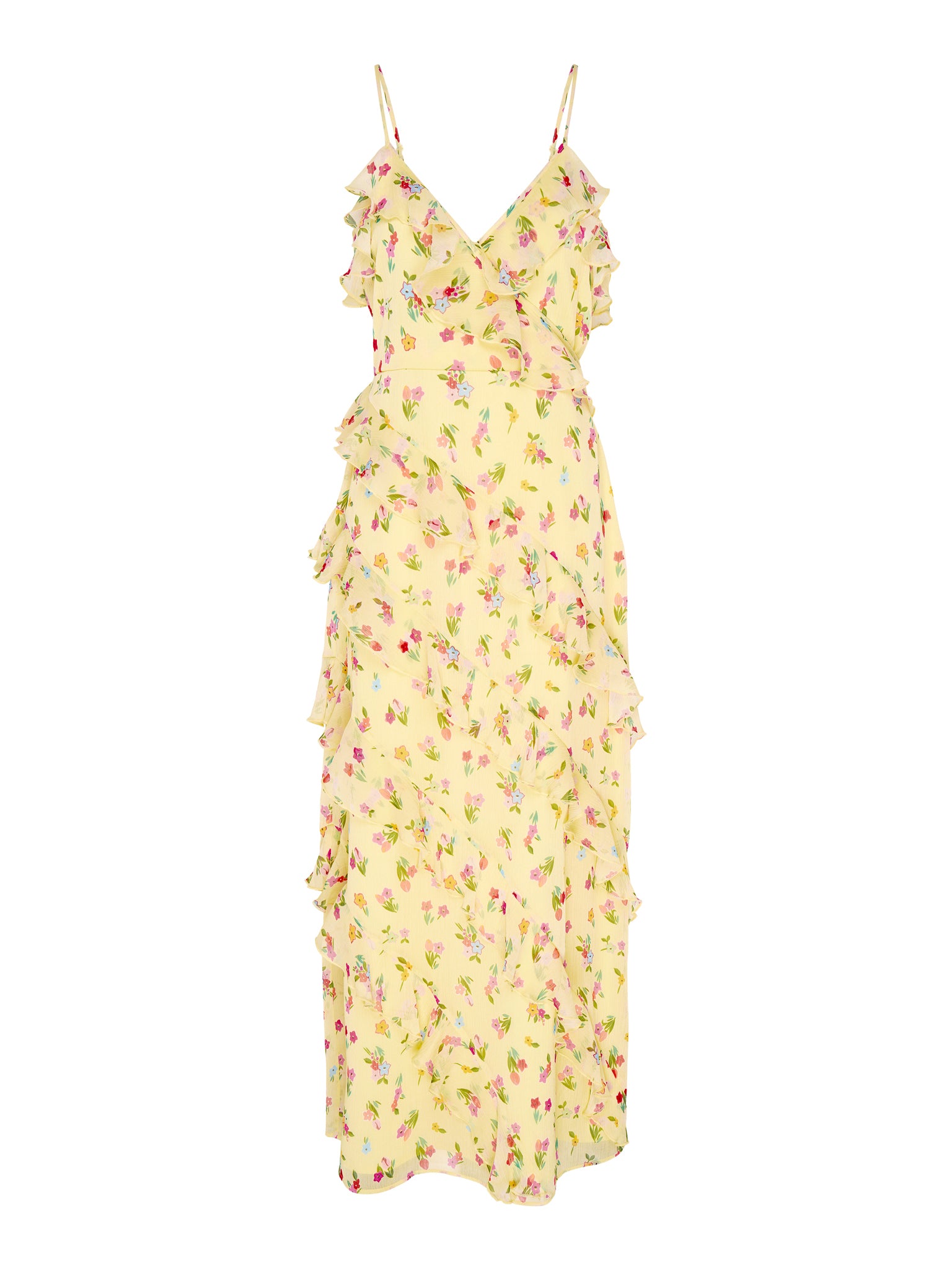 Missy is dreamy and romantic, crafted from lightweight chiffon. Designed with cascading ruffles, this midi dress is equal parts fun and elegant in pale yellow pastel with an illustrated floral print. The spaghetti straps and flattering V-neckline create an easy silhouette that’s perfect for warmer days whether dressed up for an event or a casual brunch.