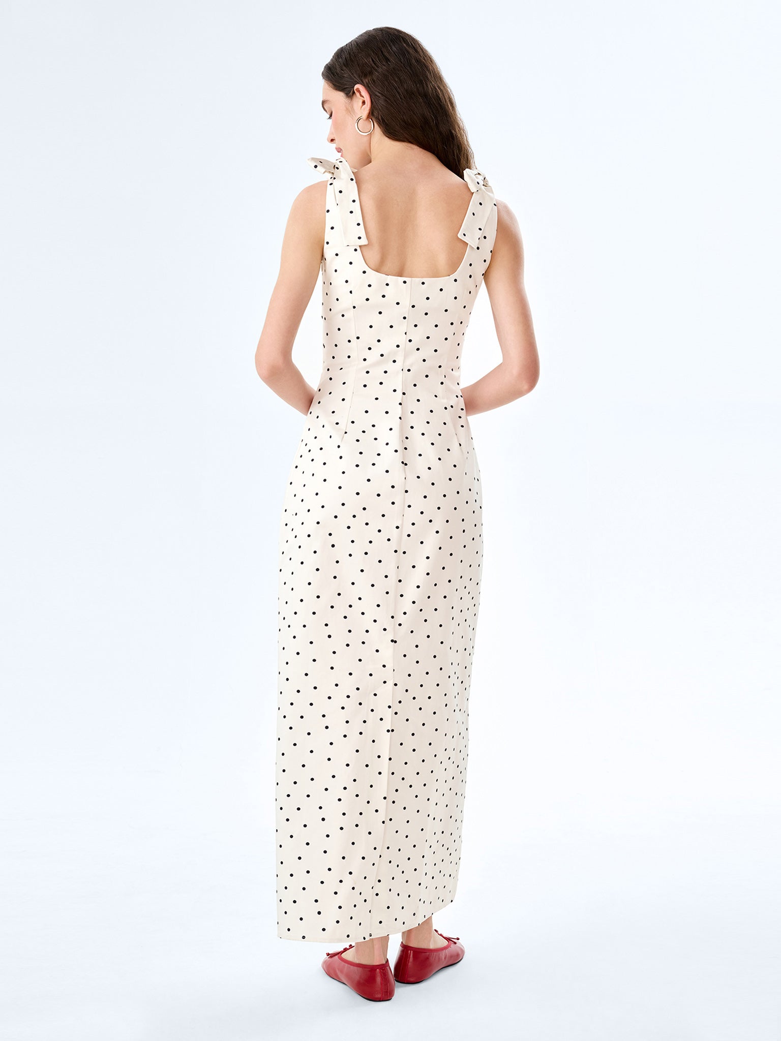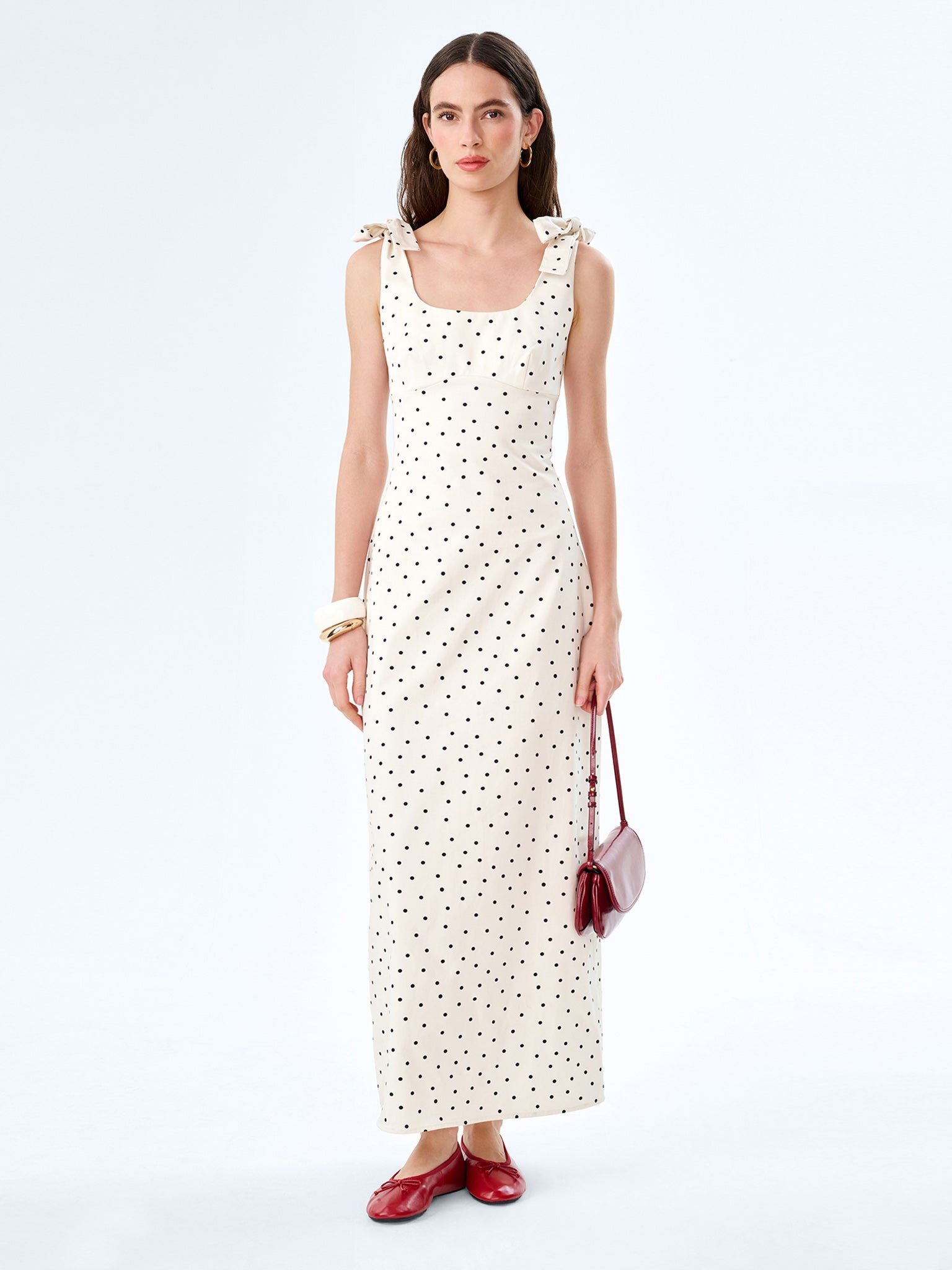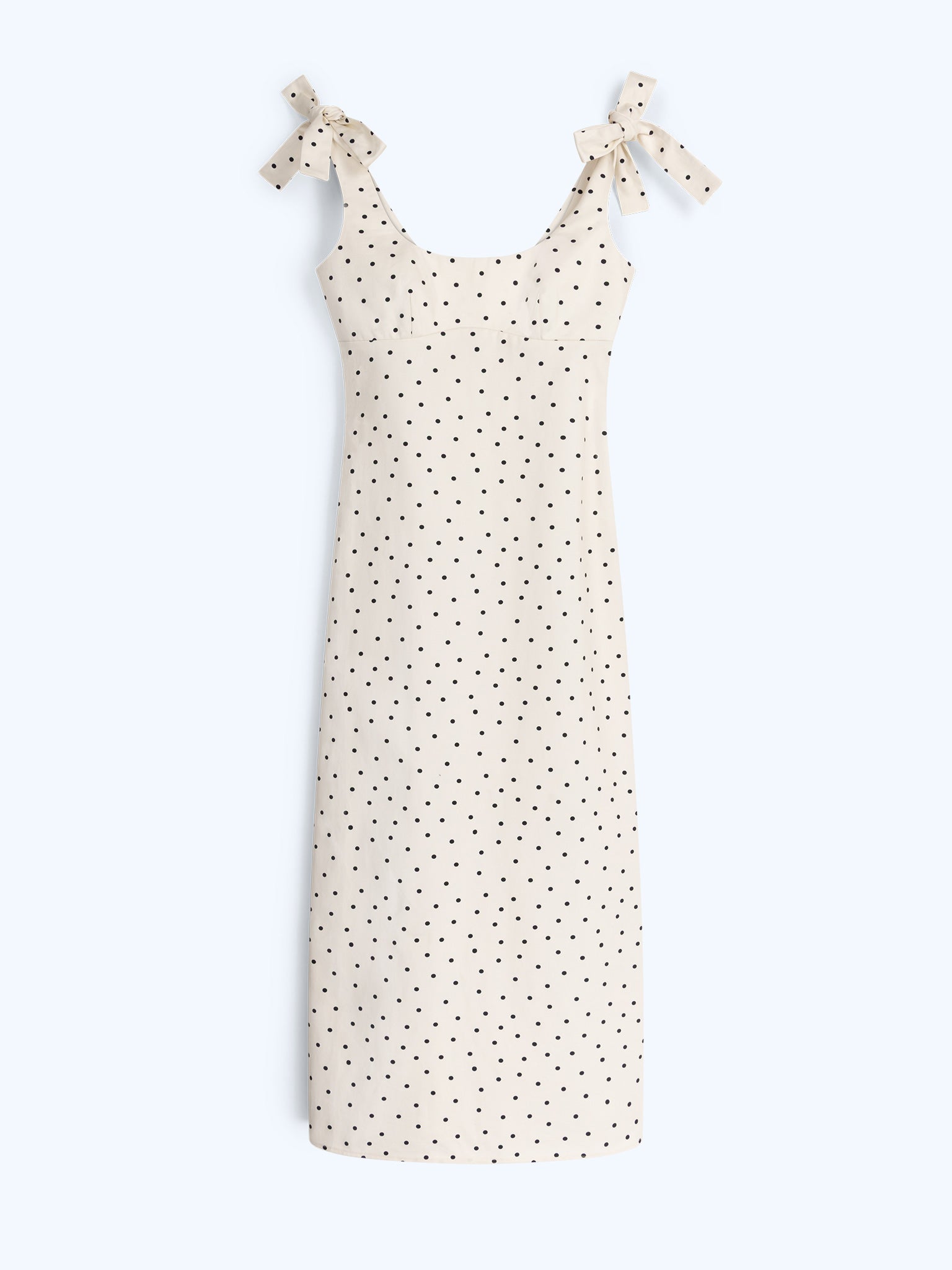 The Morgane Dress is effortless, feminine and made for every day. Crafted from breathable cotton, this A-line midi dress features a flattering scoop neckline and a fitted bodice that flows into a softly flared skirt. Designed in classic white with a polka dot print, functional tie straps add a relaxed, playful touch.