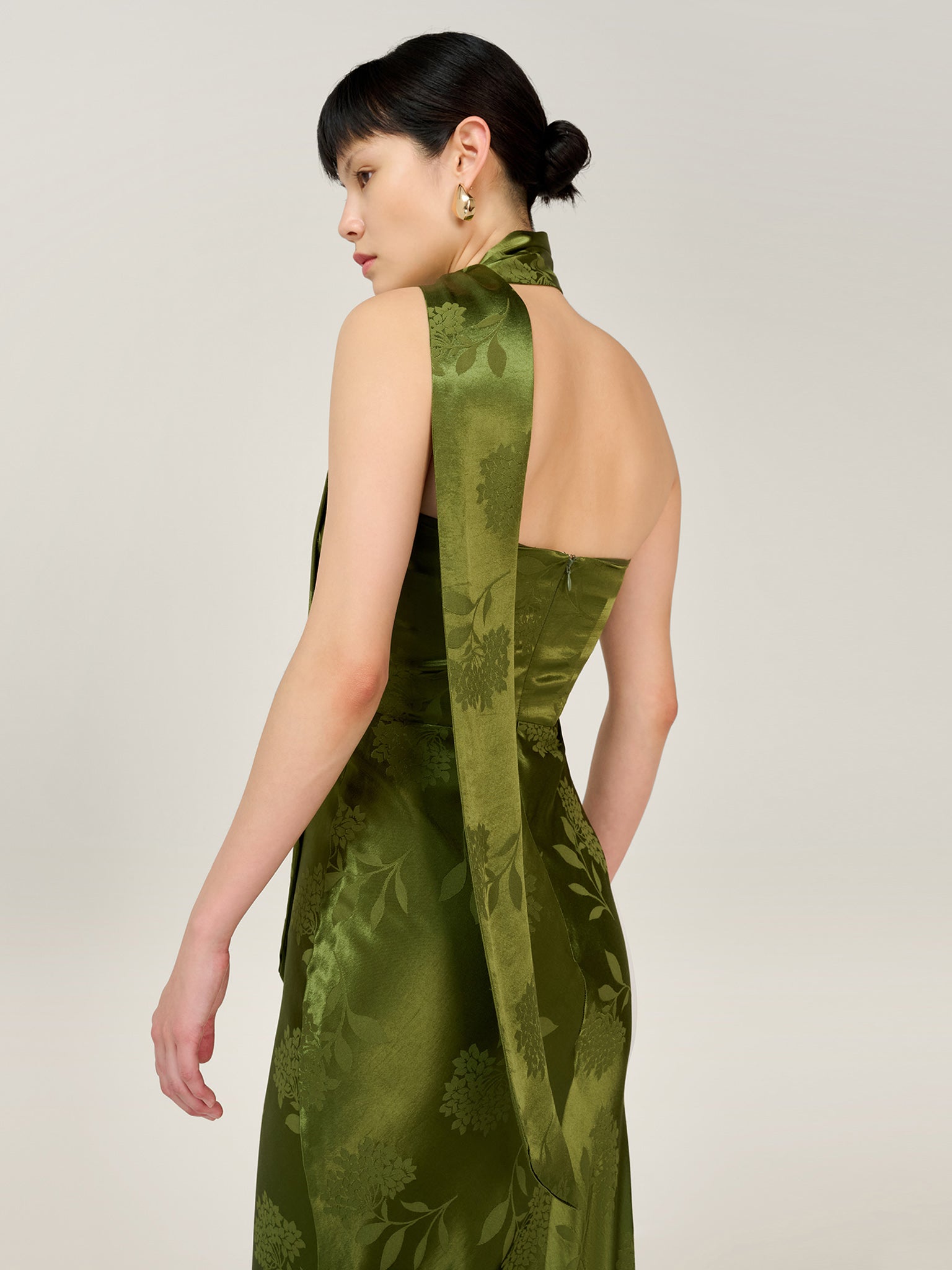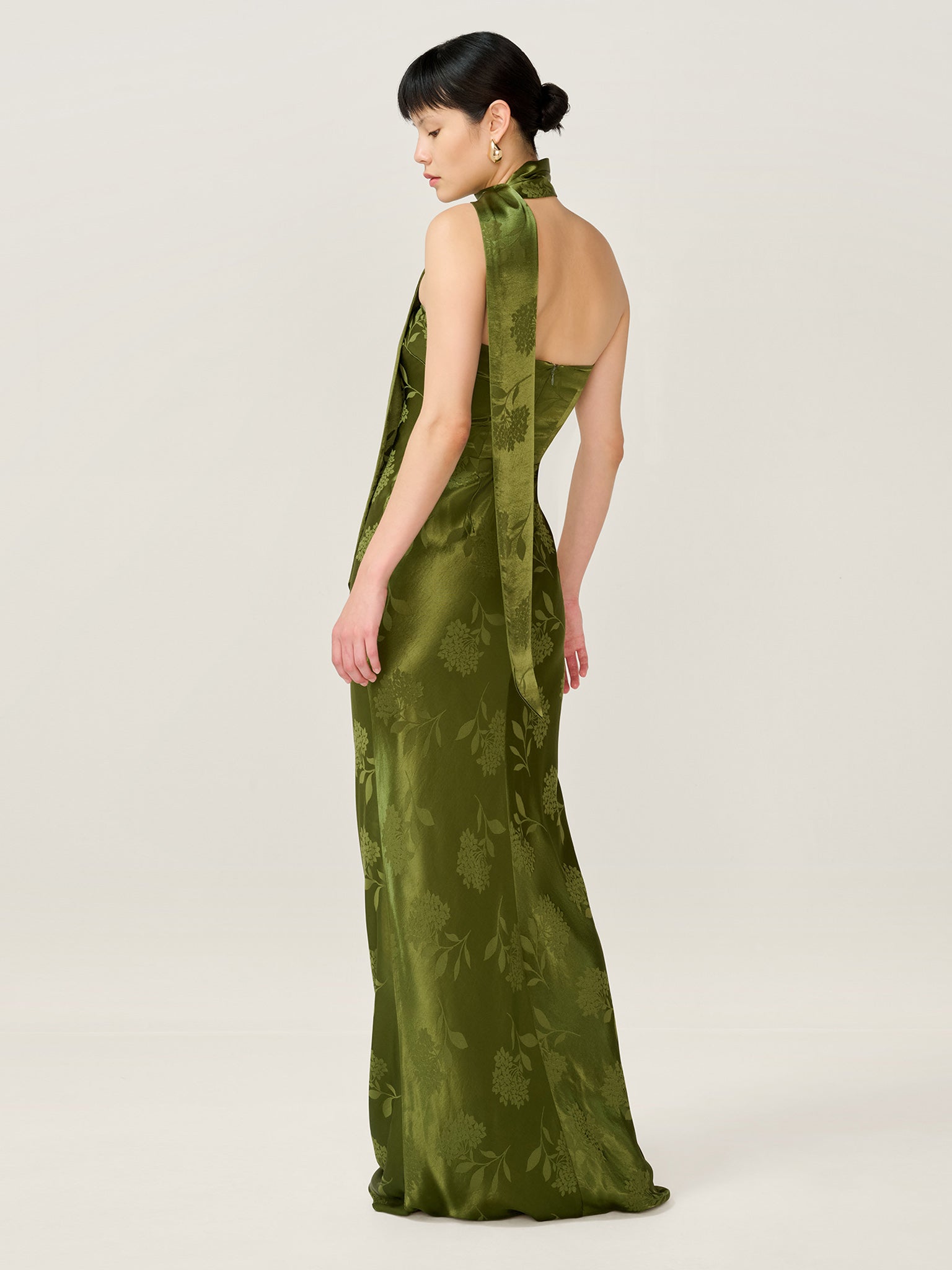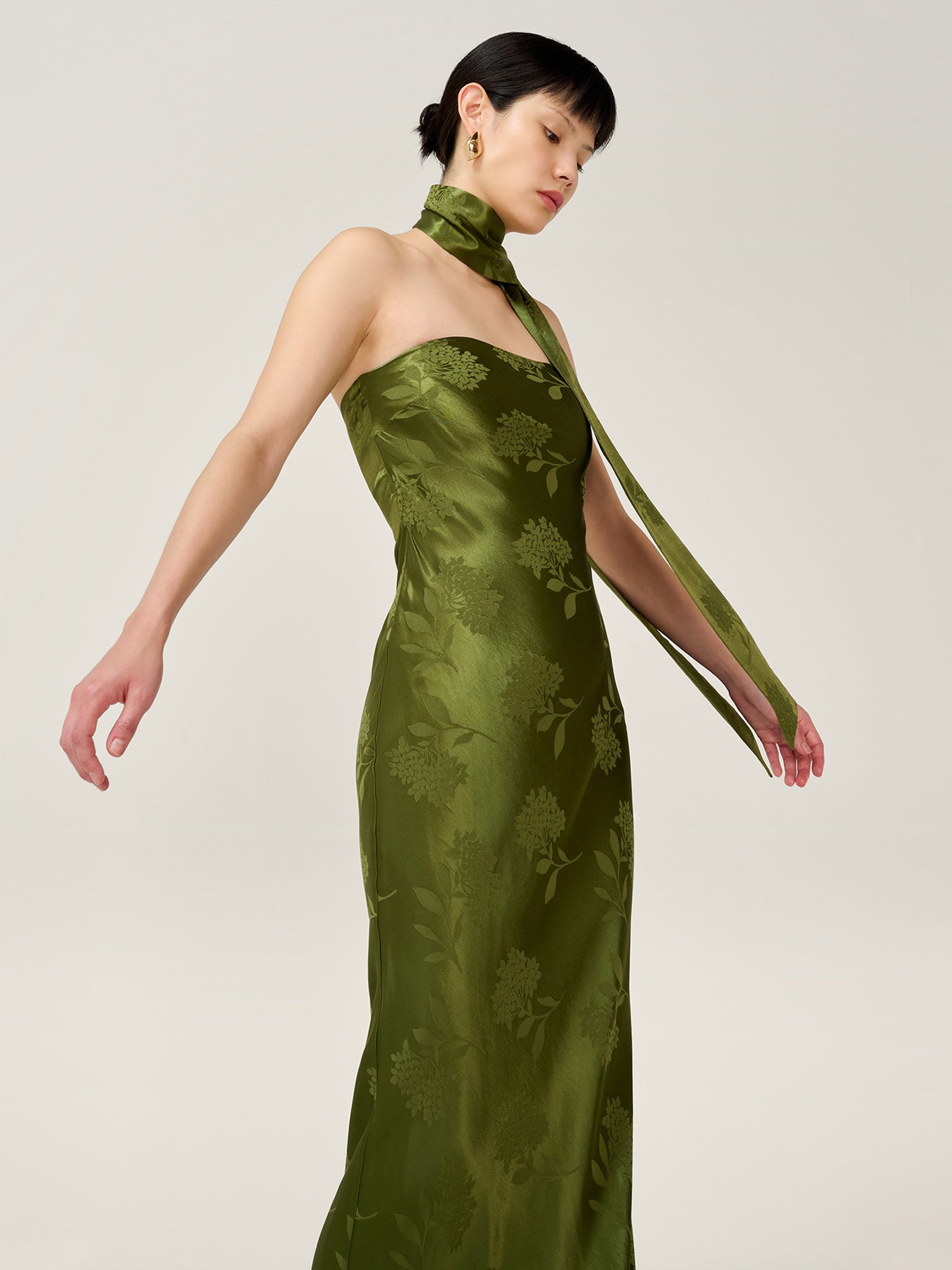 In a rich pear green, Myla is crafted in a slinky LENZING™ ECOVERO™ Viscose blend with a subtle floral jacquard finish. Fitted through the body for a clean, elongating silhouette, she’s finished with a matching scarf for added styling versatility; drape, tie and accessorise to your heart’s content. Designed as part of our wedding edit, Myla makes an elegant choice for bridesmaids, or for guests seeking something refined with just enough edge.