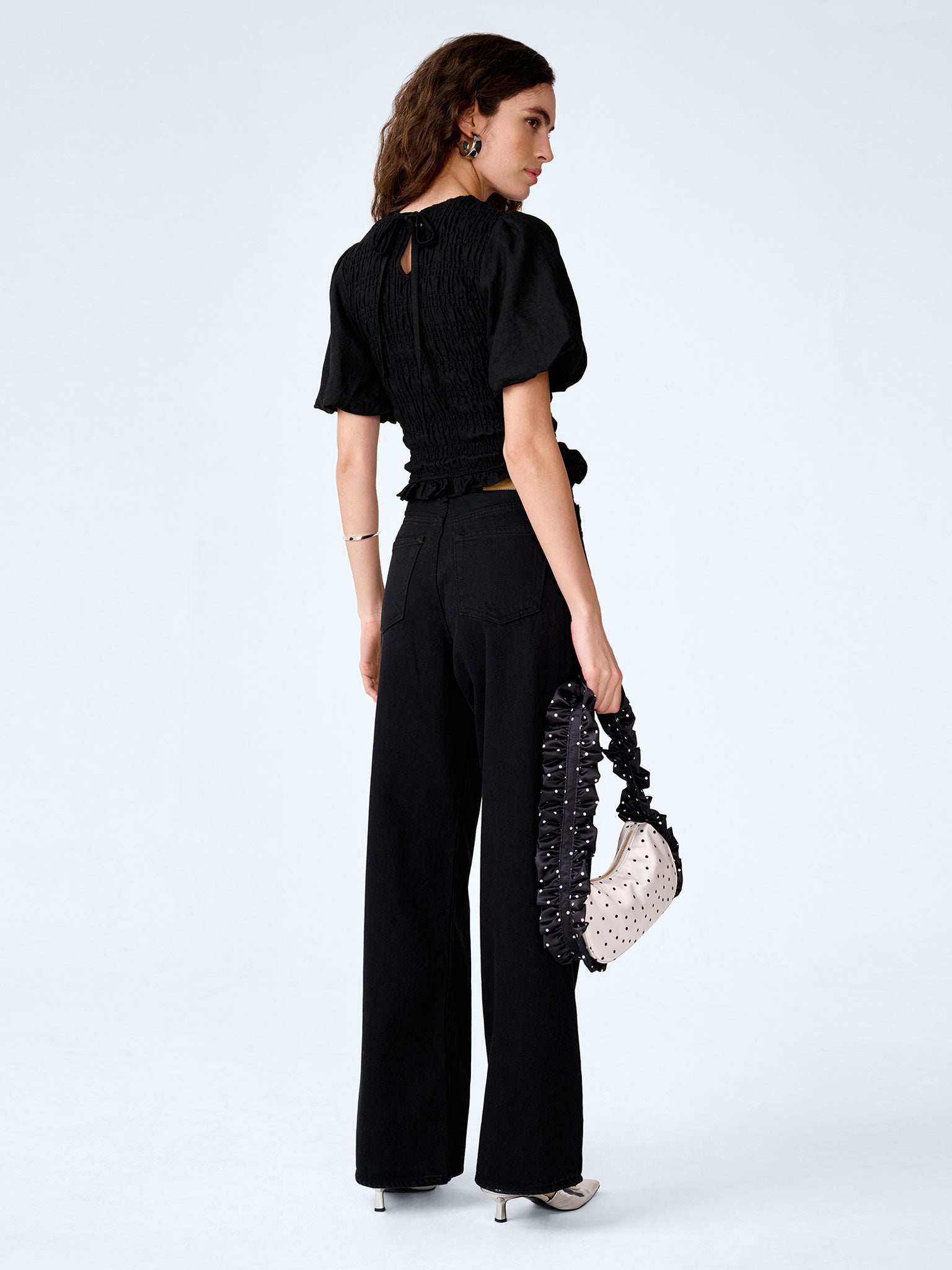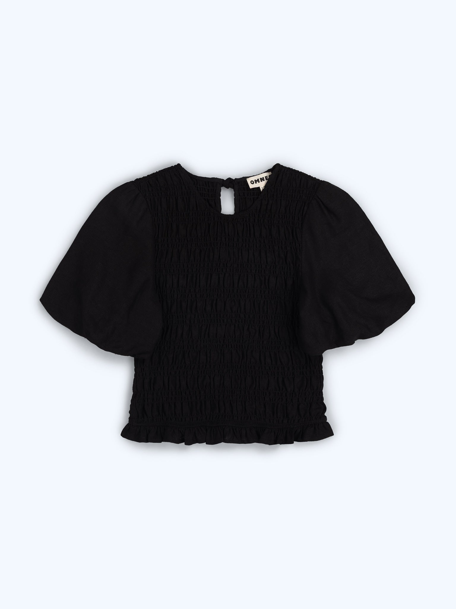 Pretty and playful, Nicolla will elevate your everyday basics. Crafted from breathable linen in timeless black, it features shirring throughout, a short puff sleeve and a soft peplum frill for an easy, feminine silhouette. Wear it, layer it, love it.