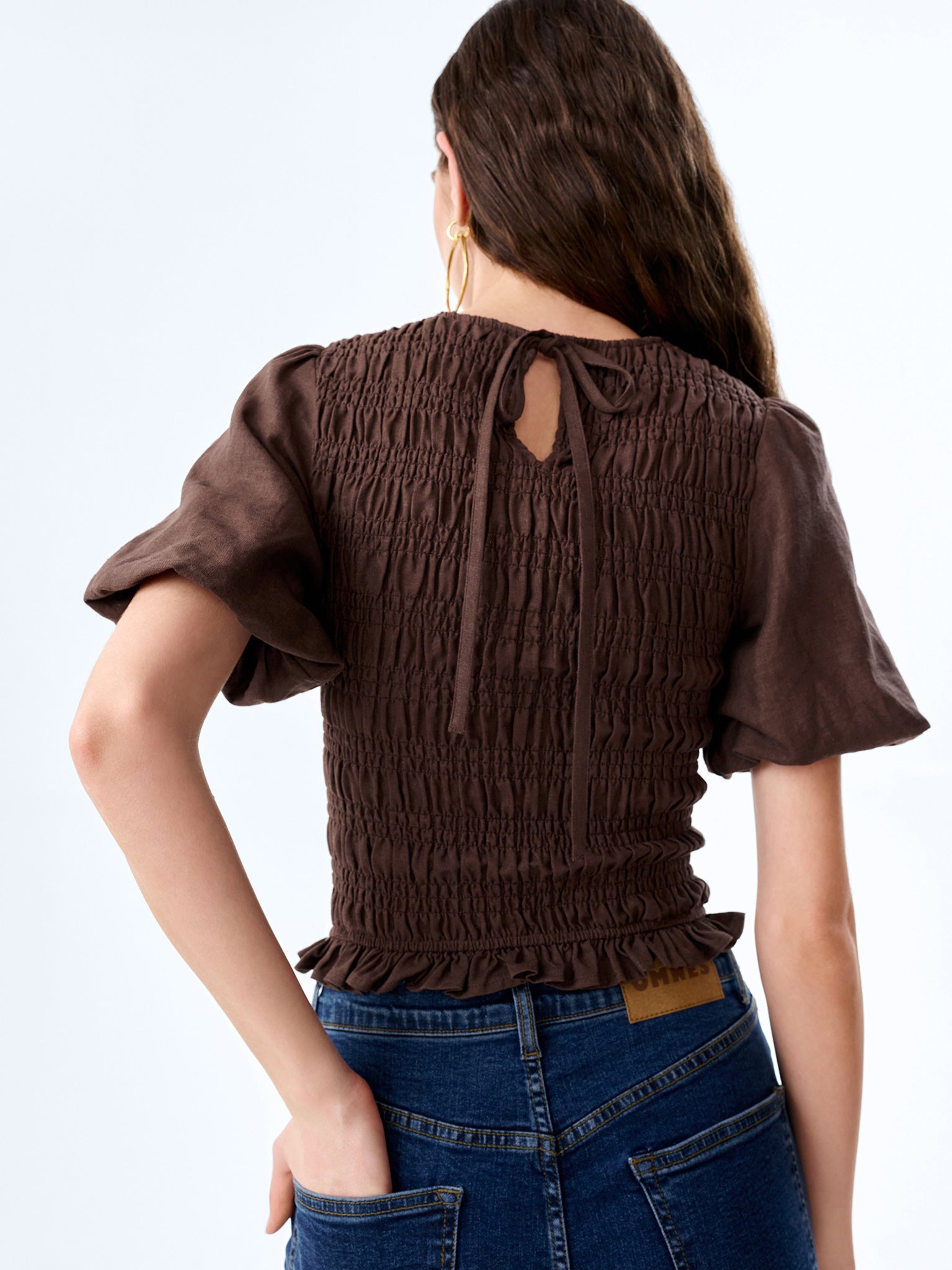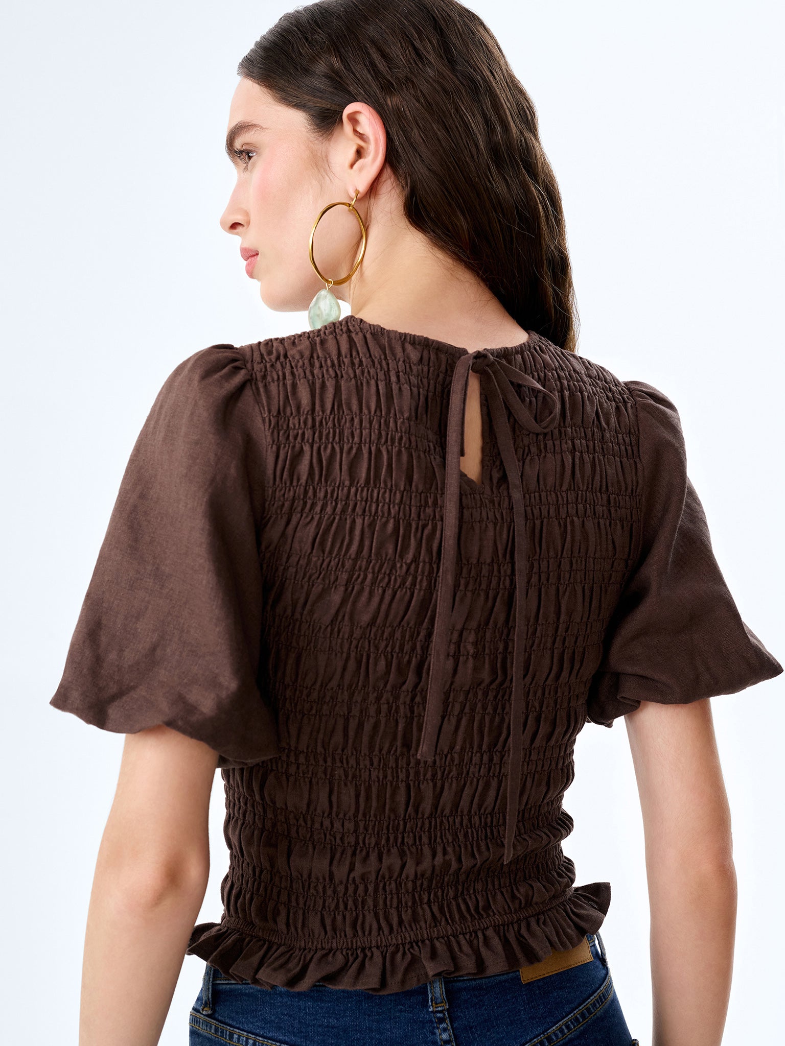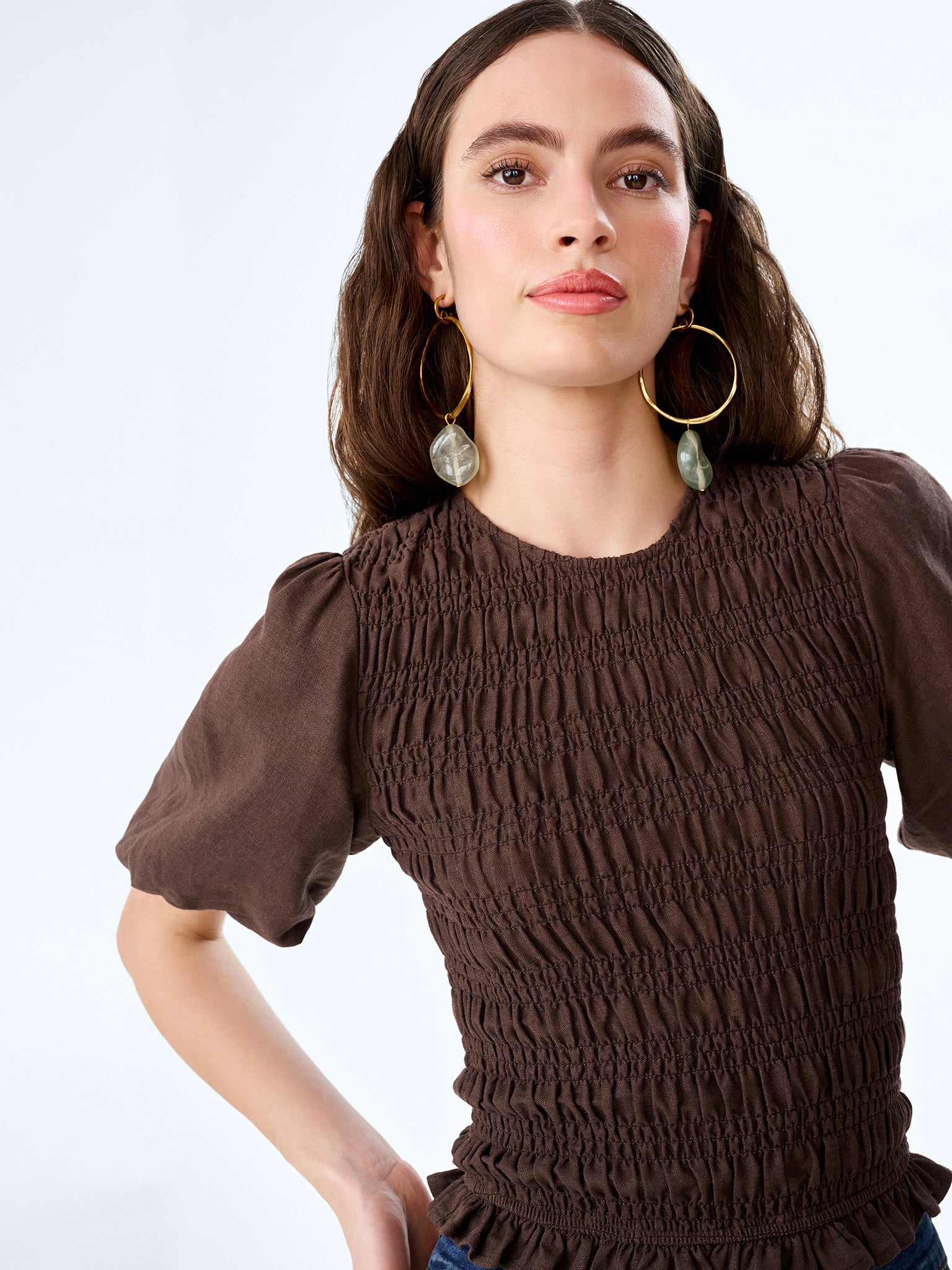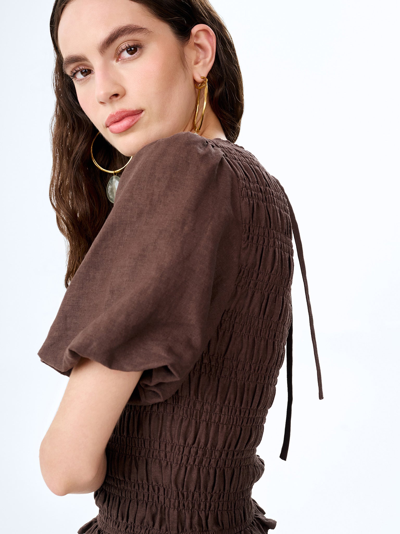 Pretty and playful, Nicolla will elevate your everyday basics. Crafted from breathable linen in a rich chocolate brown tone, it features shirring throughout, a short puff sleeve and a soft peplum frill for an easy, feminine silhouette. Wear it, layer it, love it.