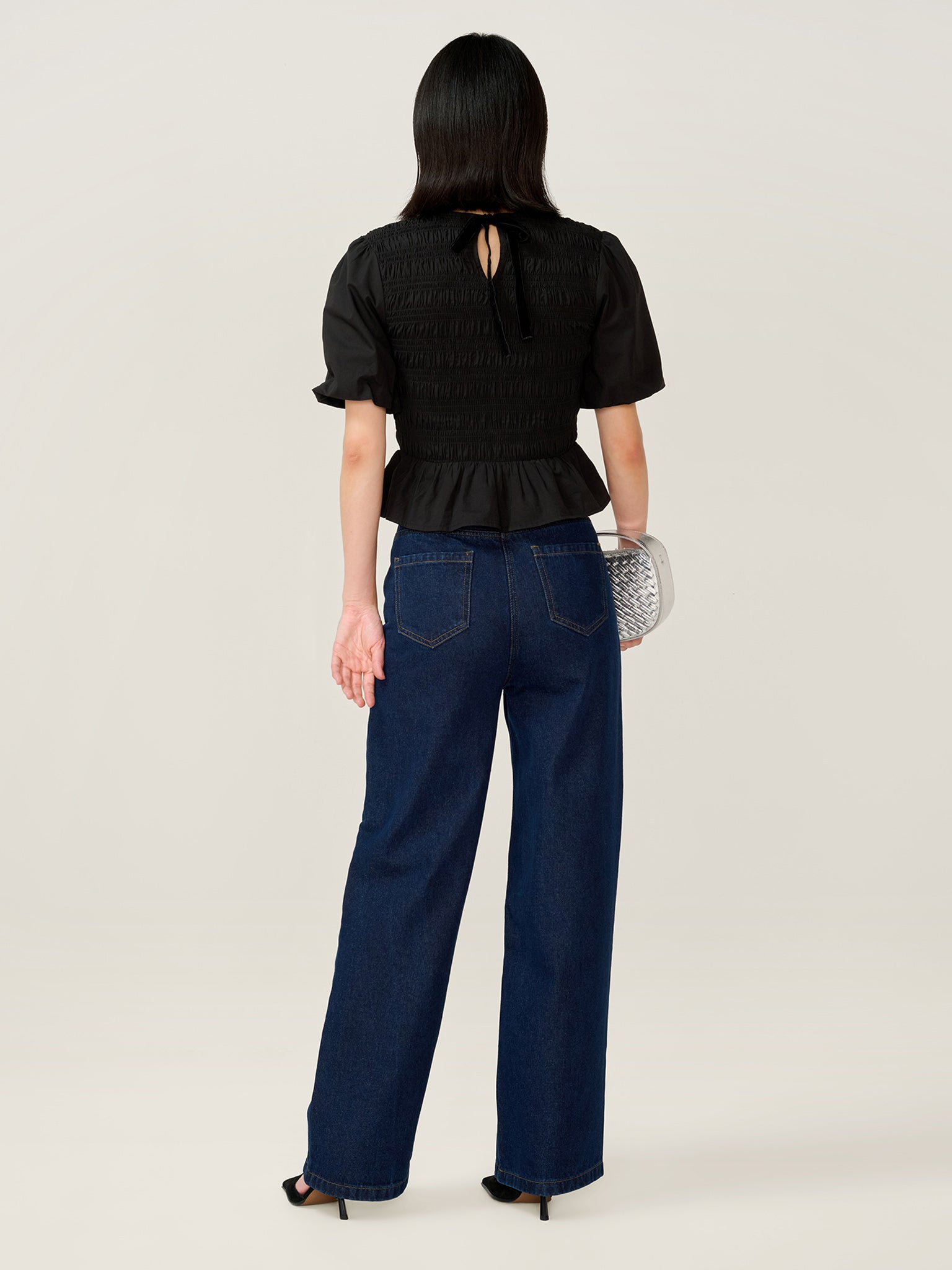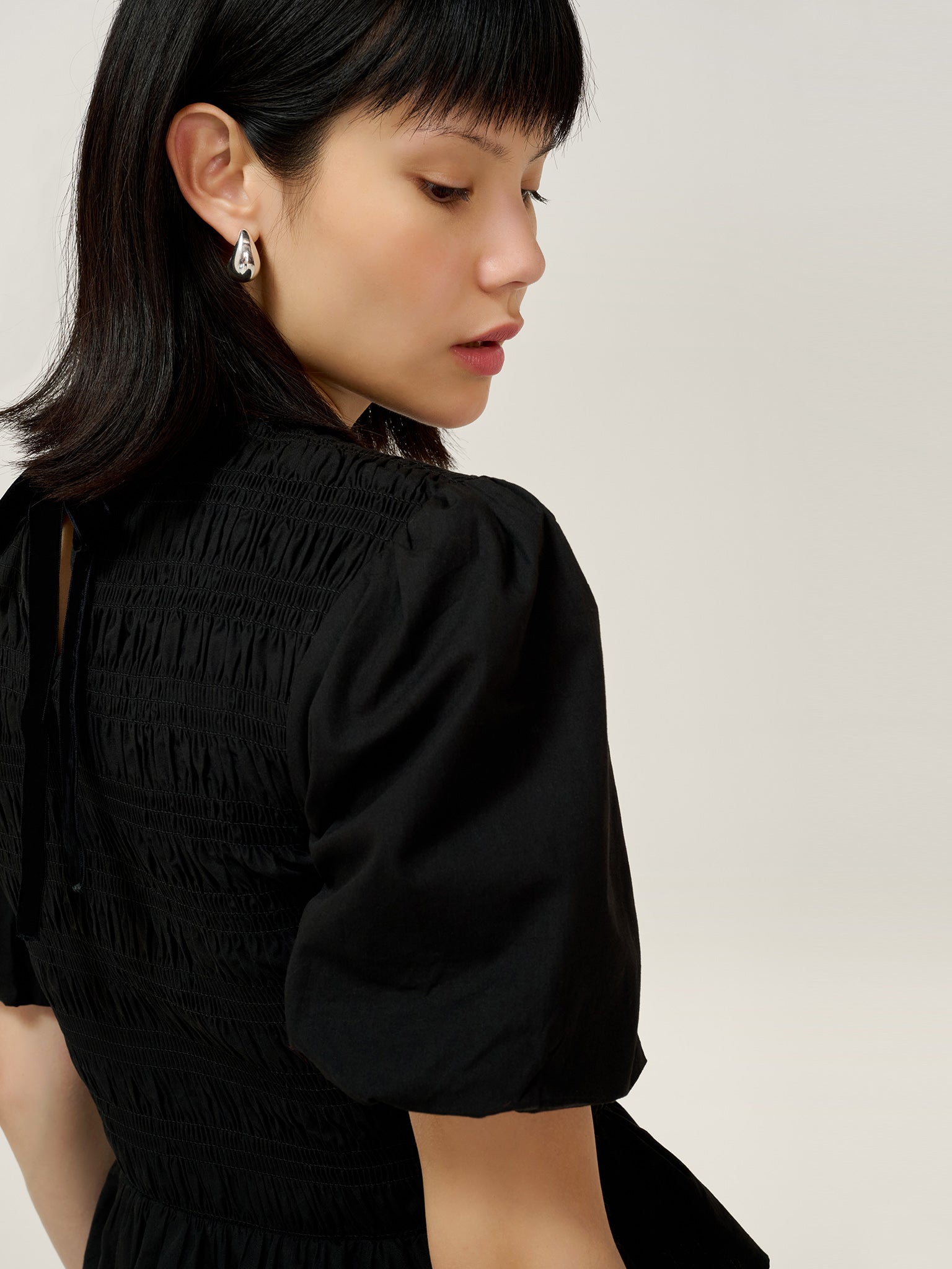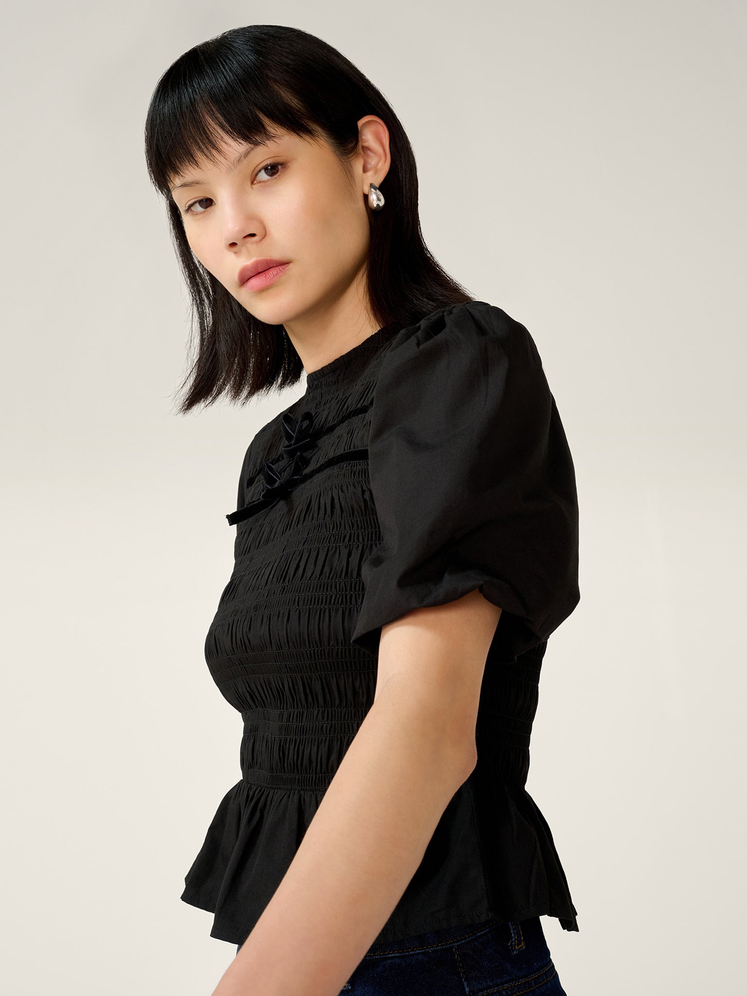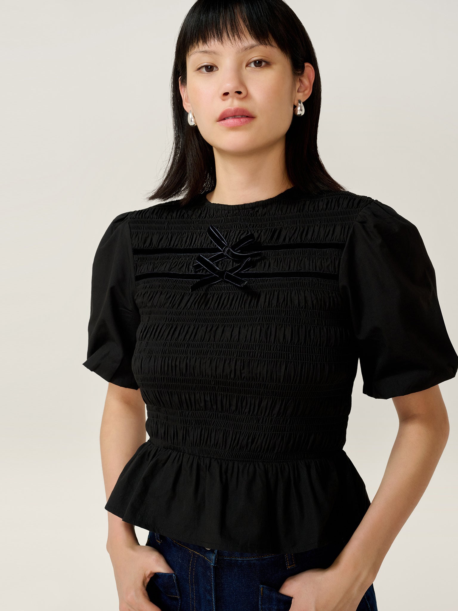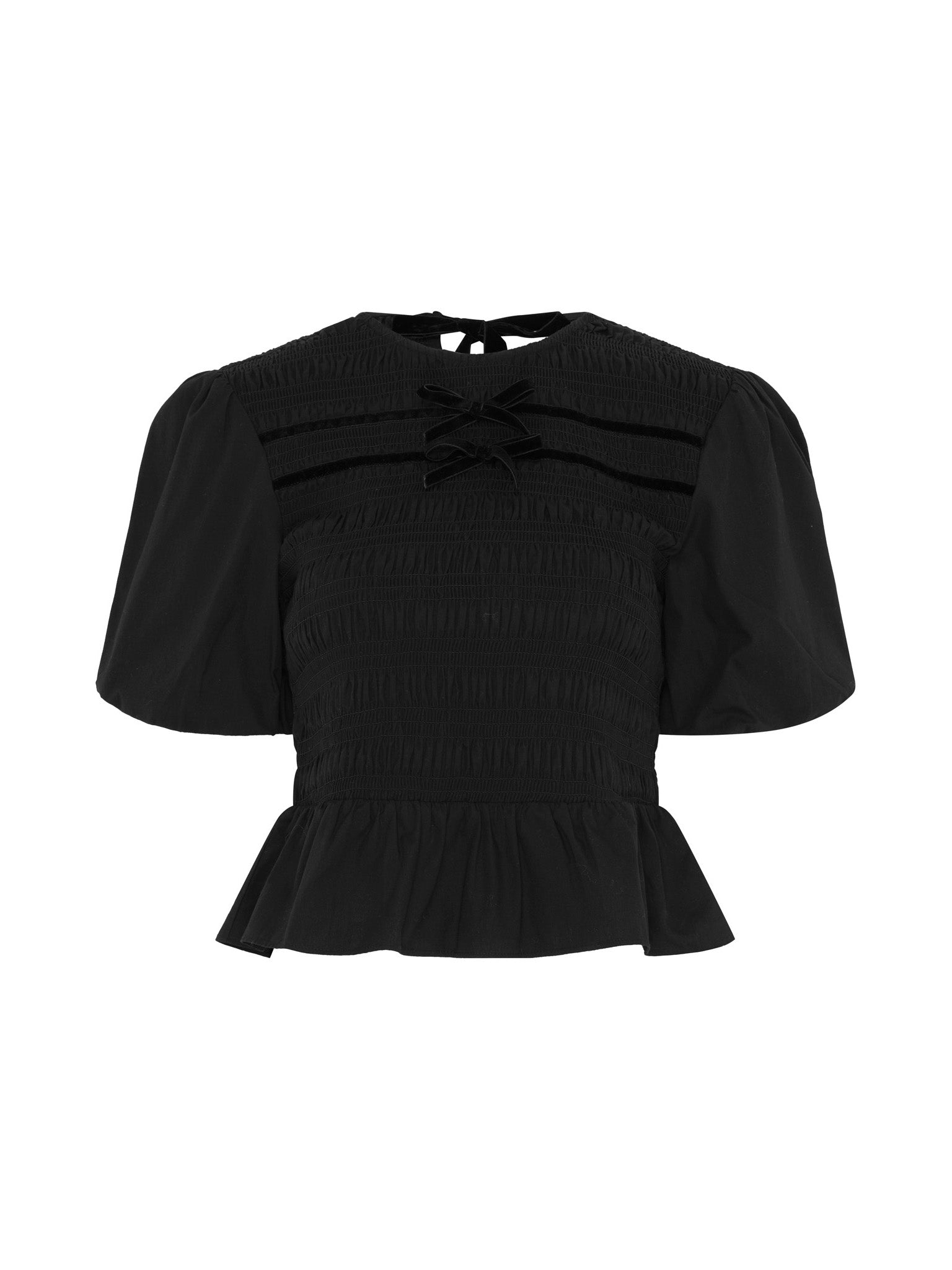 Noemi is your shortcut to effortless charm. Made from soft cotton, it features a shirred bodice, puff sleeves, and a flattering peplum ruffle hem. Finished with a double velvet bow detail, it’s the perfect mix of sweet and structured; ideal for pairing with denim or dressing up for a night out.