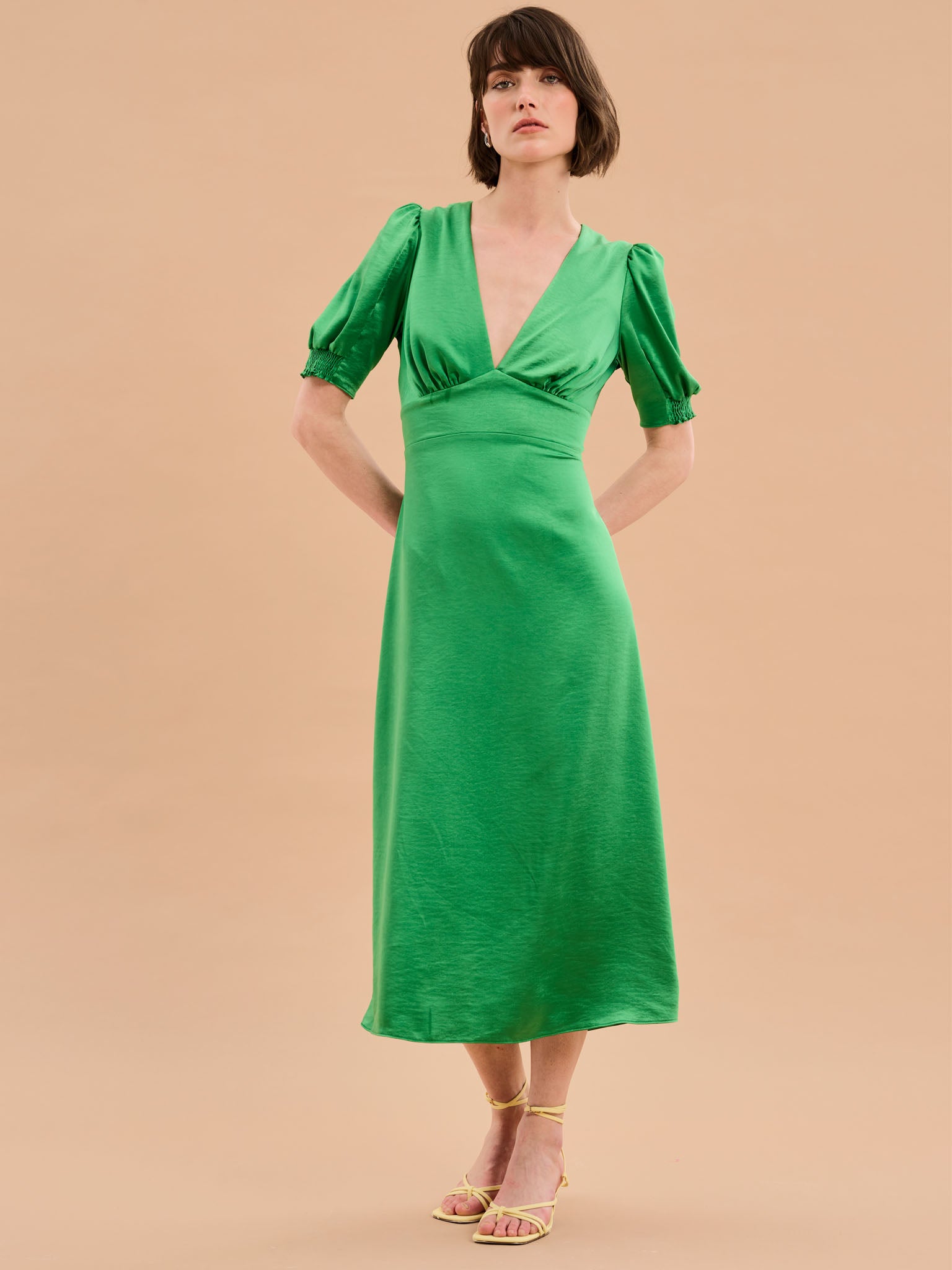 Odette is elegance with an edge. The 3/4 length sleeves are gathered at the bottom to create a feminine silhouette offset with a deep v-neckline. With an open back with sash detail, this dress in fern green recycled satin is a date night dream.