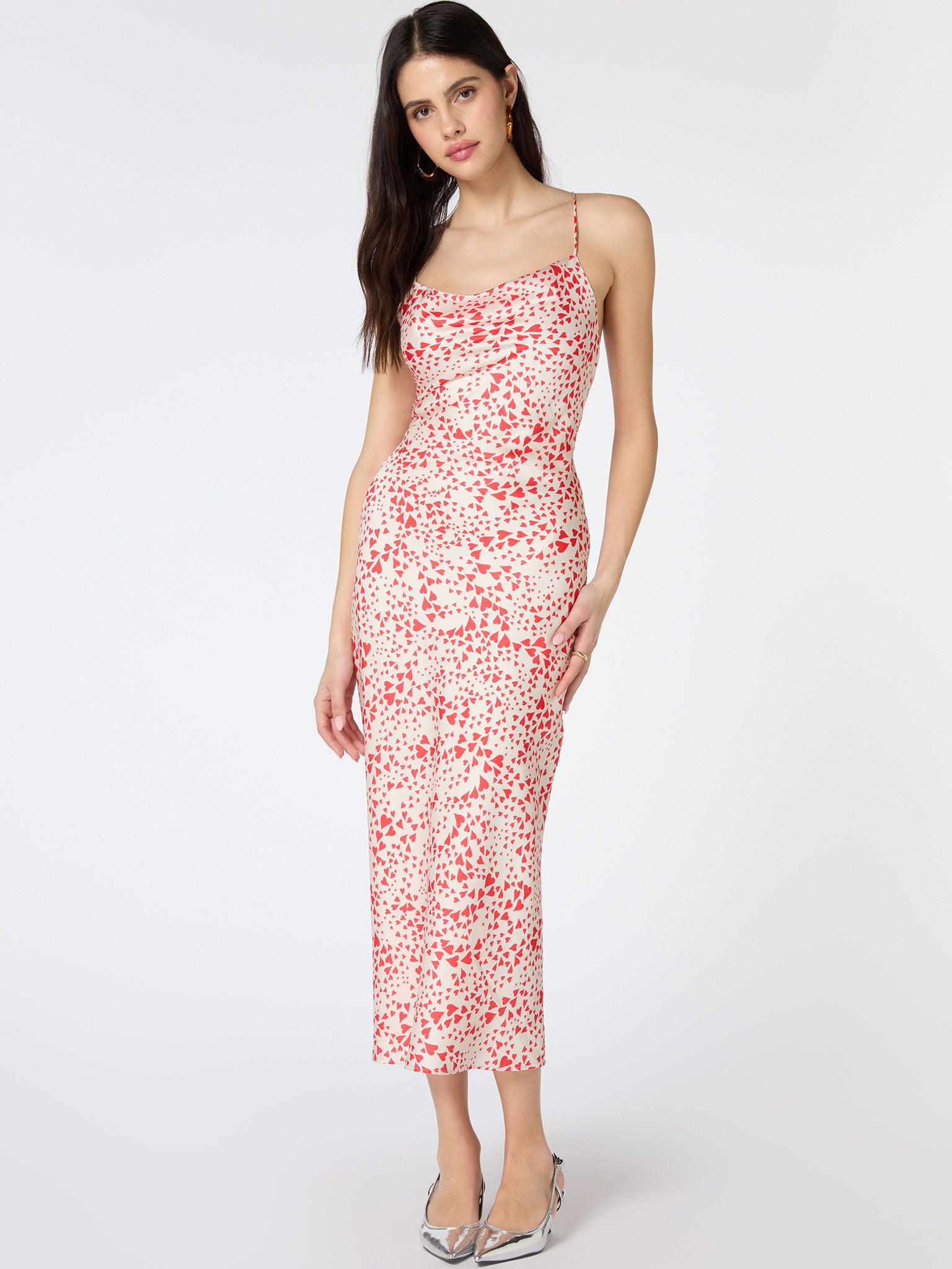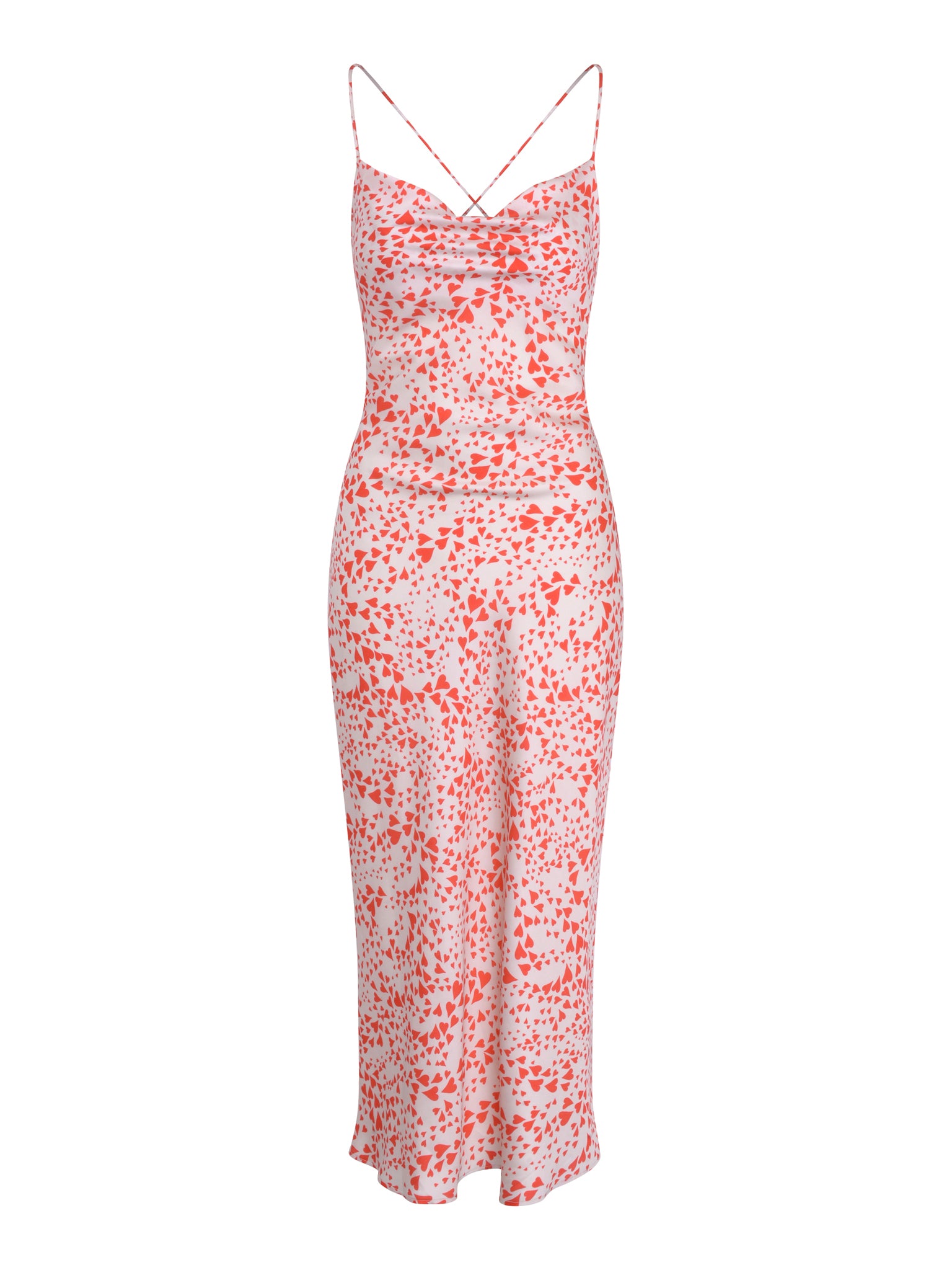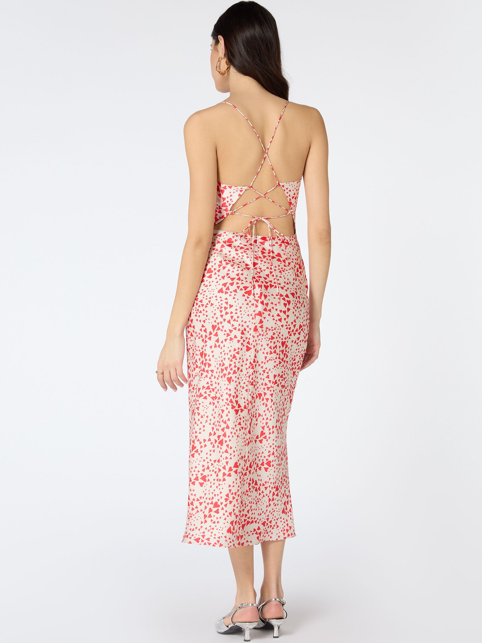 Our iconic Riviera has been updated with a sweet heart print. Showcasing a flattering body-skimming cut, cowl neck and tie back detail, this playful statement dress is perfect with a strappy heel for a simple but sexy look or dressed down with trainers and a cardigan. Expertly crafted from 100% satin-feel recycled polyester.