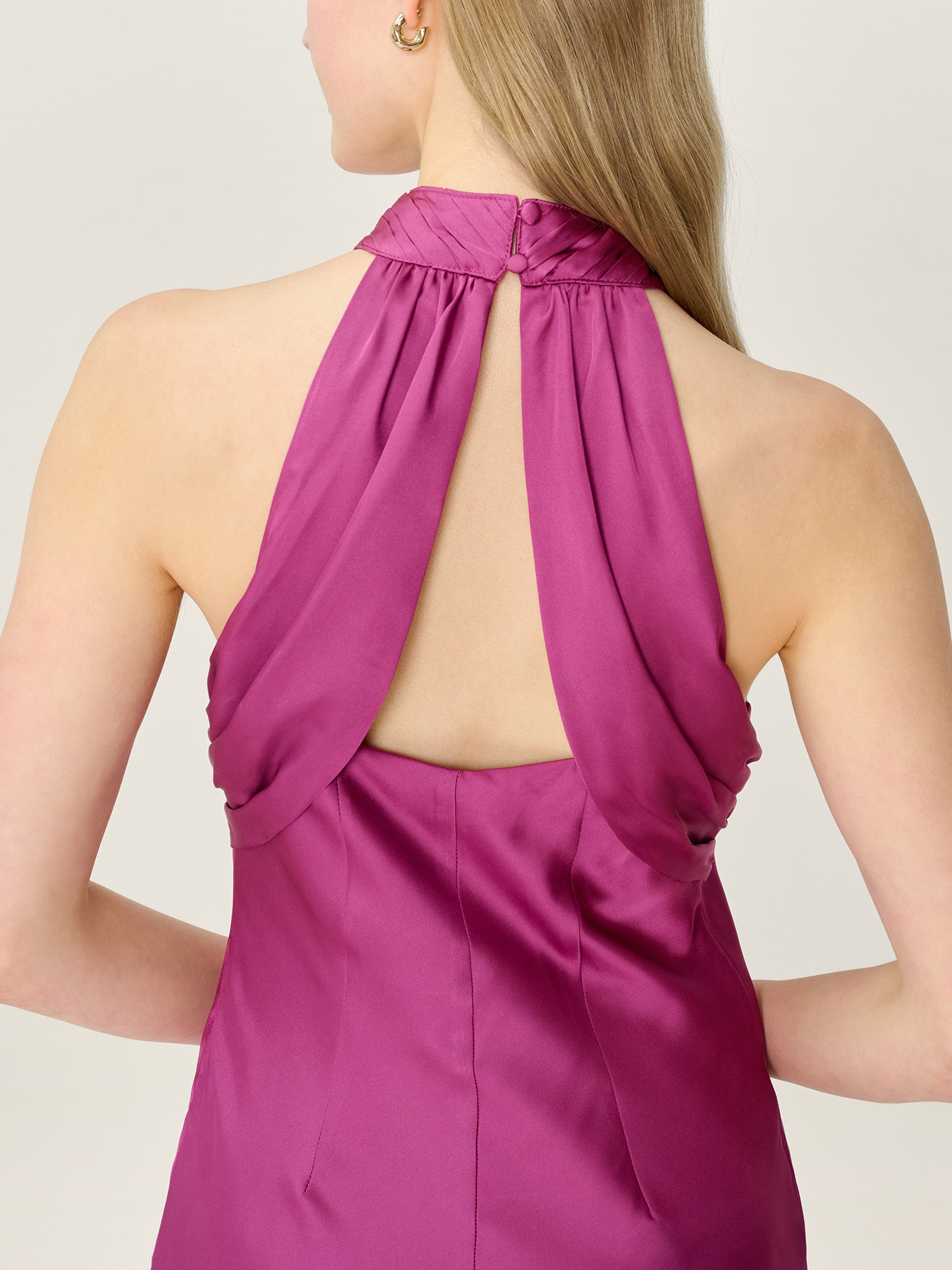 Meet your new party favourite, Seychelles. Designed with a sleek halter neckline and a softly draped, open back, this standout dress is crafted from satin-like recycled polyester with a subtle, light-catching sheen. Cut to a flattering midaxi length in magenta, Seychelles is made for dancing, celebrating and nights that last till morning.
