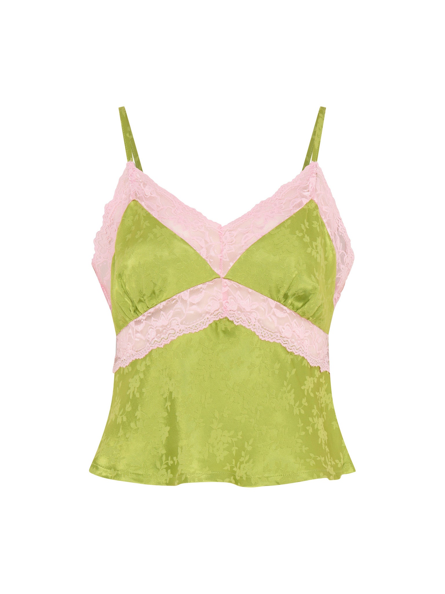 The Tamara top is a romantic cami with a playful twist. Crafted from floral jacquard in a vibrant lima bean green, it’s made using LENZING™ ECOVERO™ viscose; a more responsible fabric with a beautiful drape and soft feel. Delicate pink lace trim adds contrast and charm, while the cami silhouette makes it easy to wear on its own, layer or style with the matching skirt for a co-ord that works from day to night.