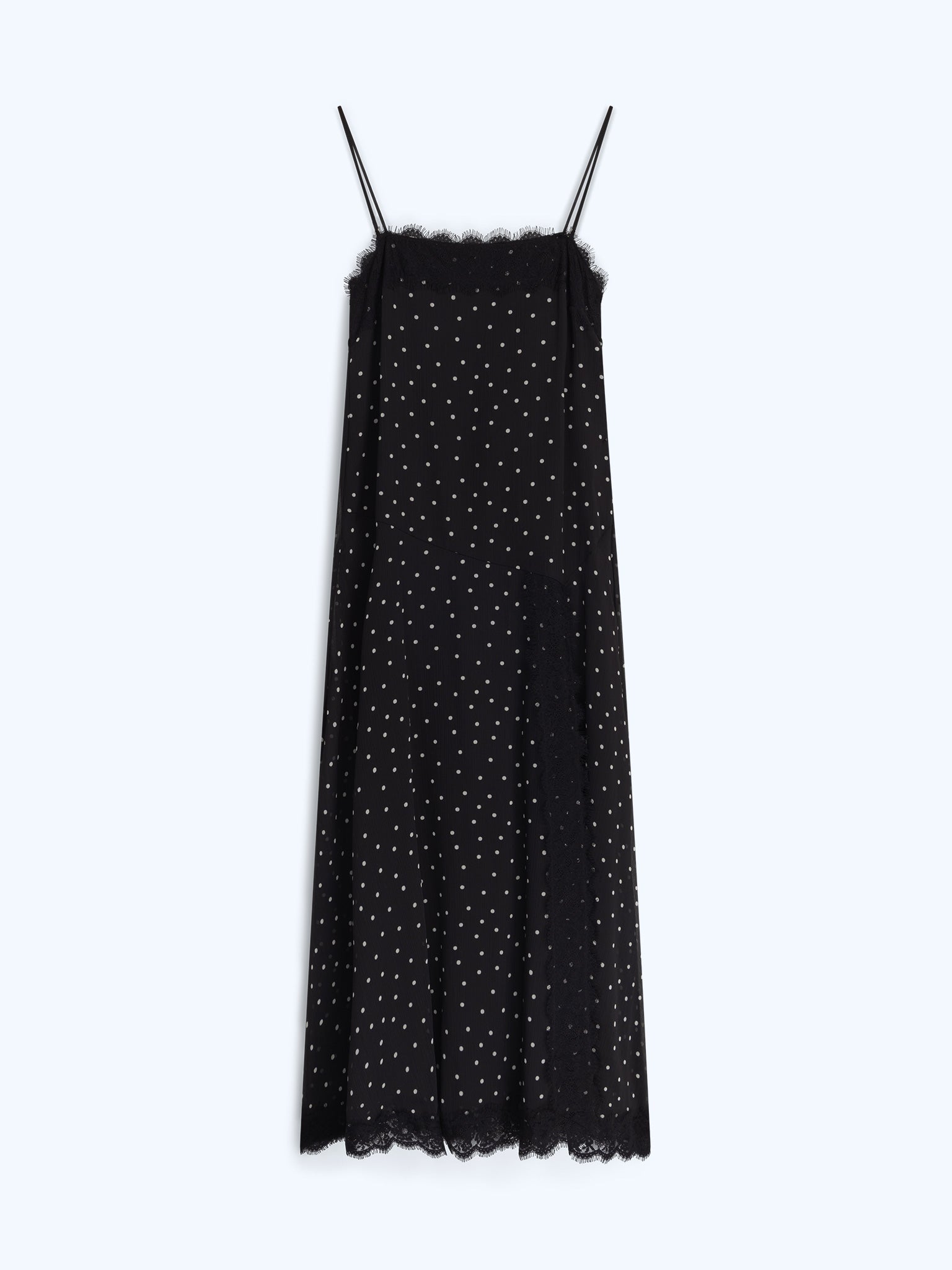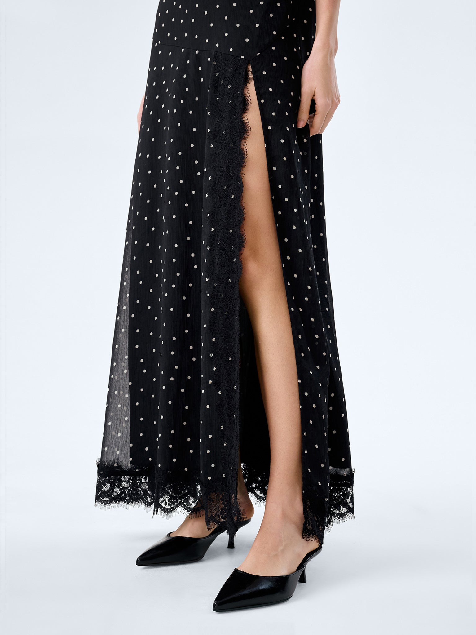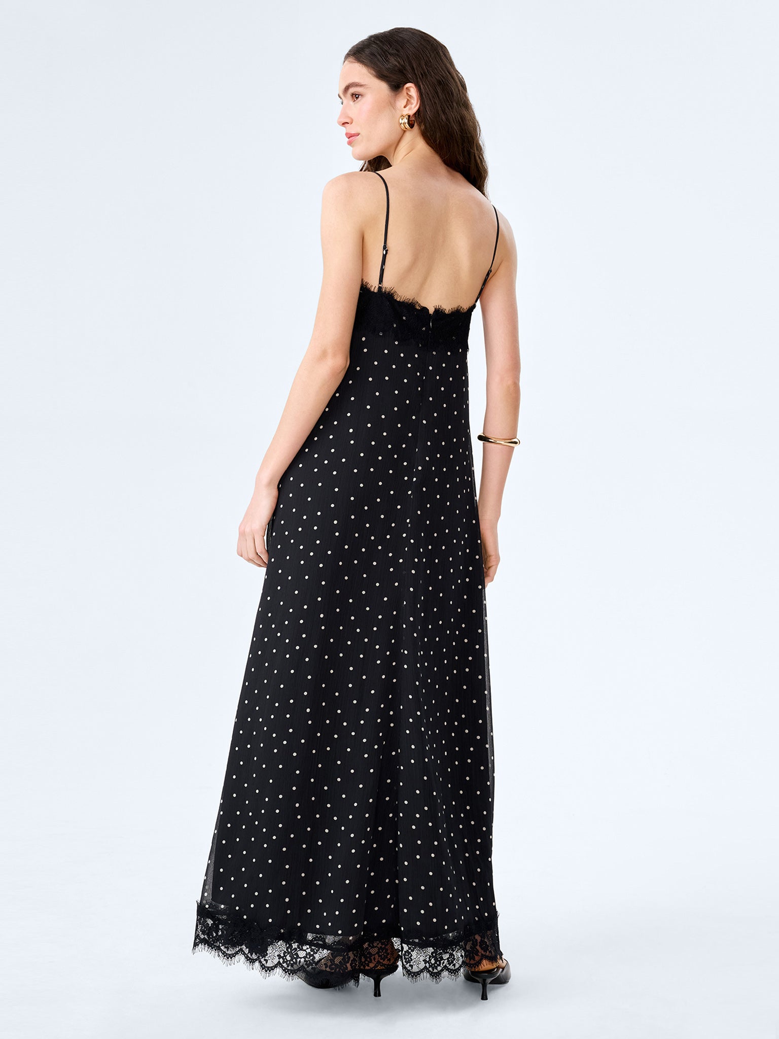 The Thèa Dress is effortless, feminine and oh so easy to wear. Designed in a floaty black chiffon with a polka dot print, this maxi-length shift dress features a clean square neckline and delicate cami straps. Finished with subtle lace trim for a soft romantic touch, the adjustable straps ensure the perfect fit. A cheeky leg split adds just a touch of playful drama, making Thèa a timeless choice for any occasion.