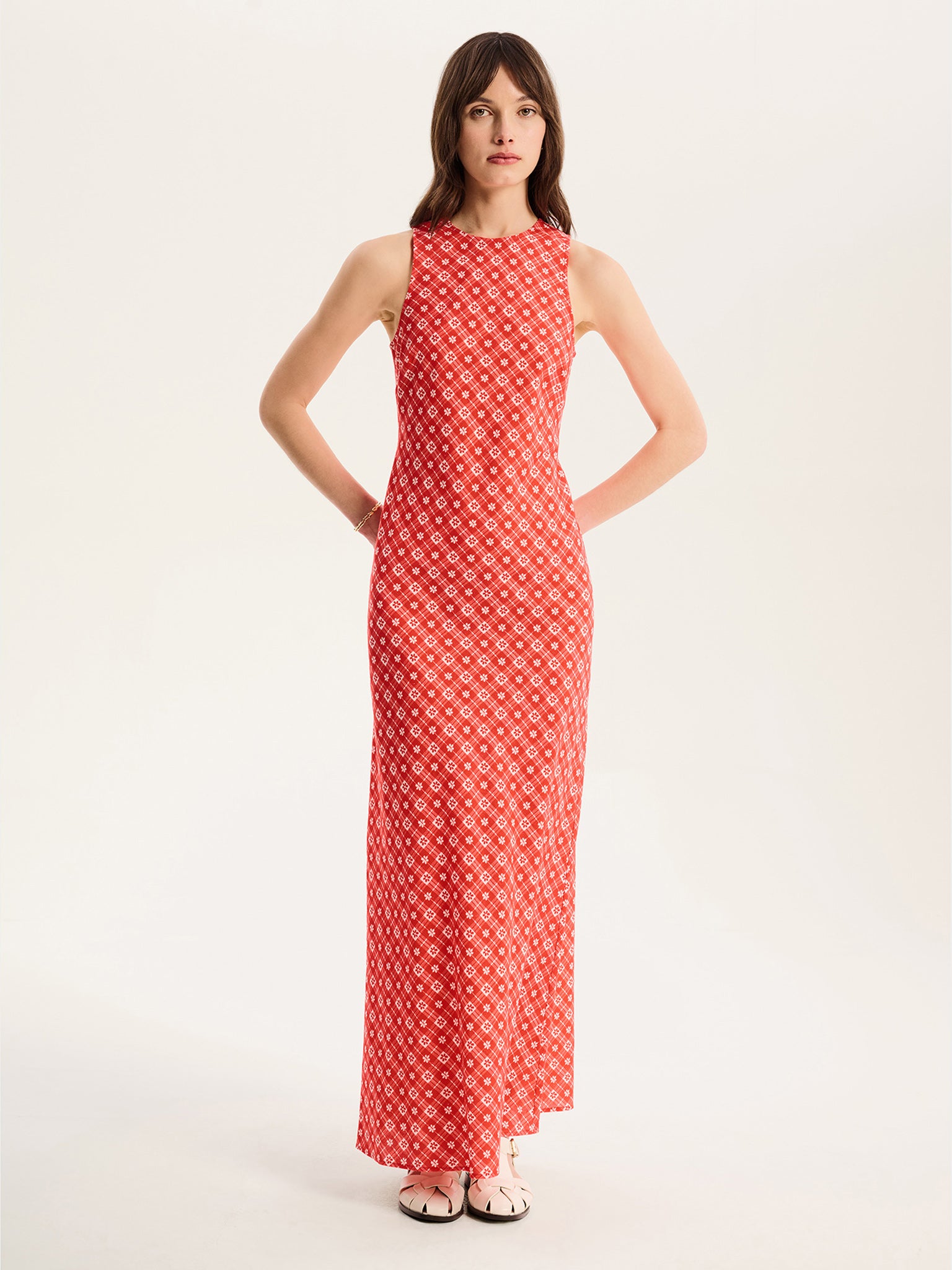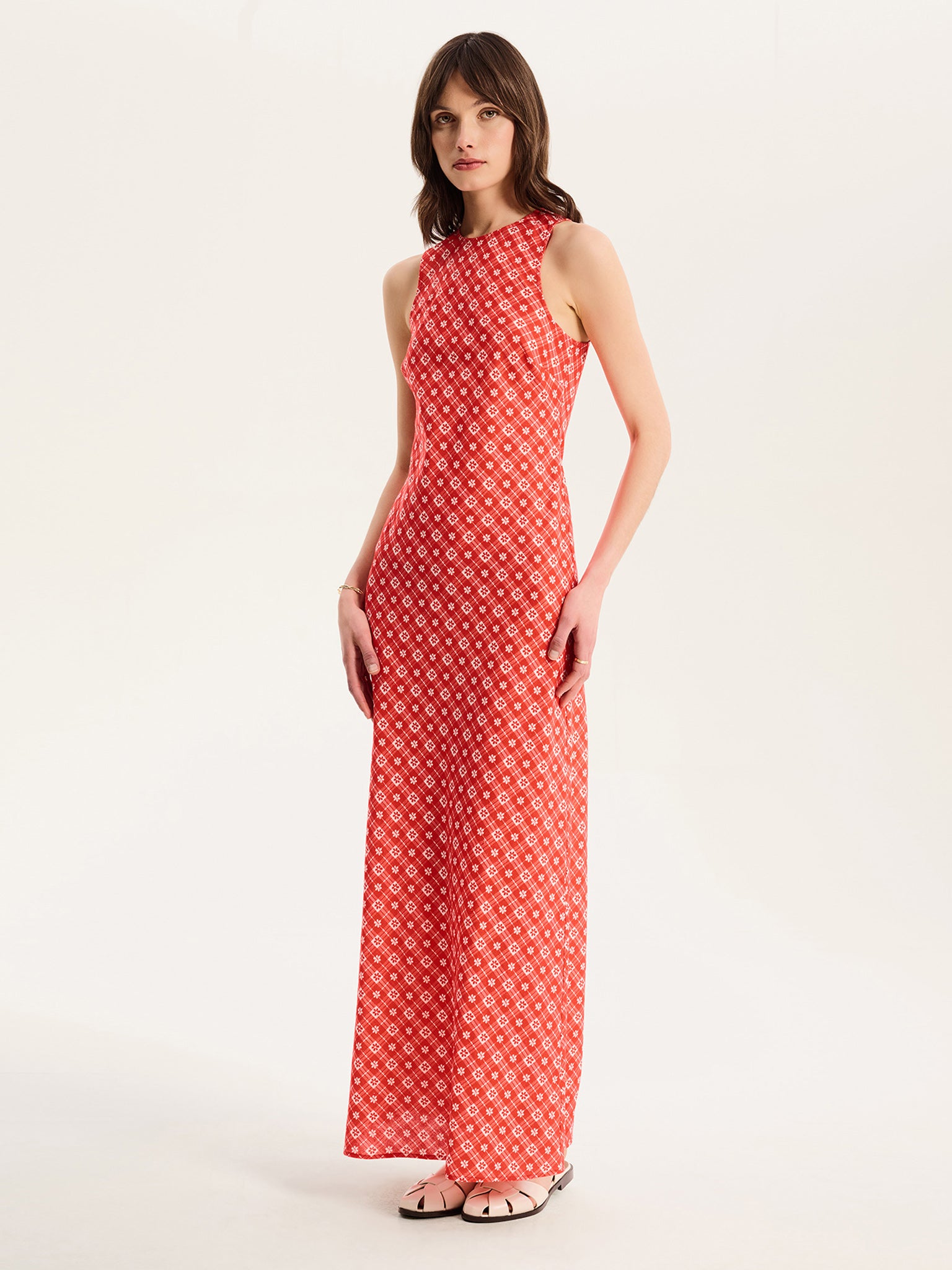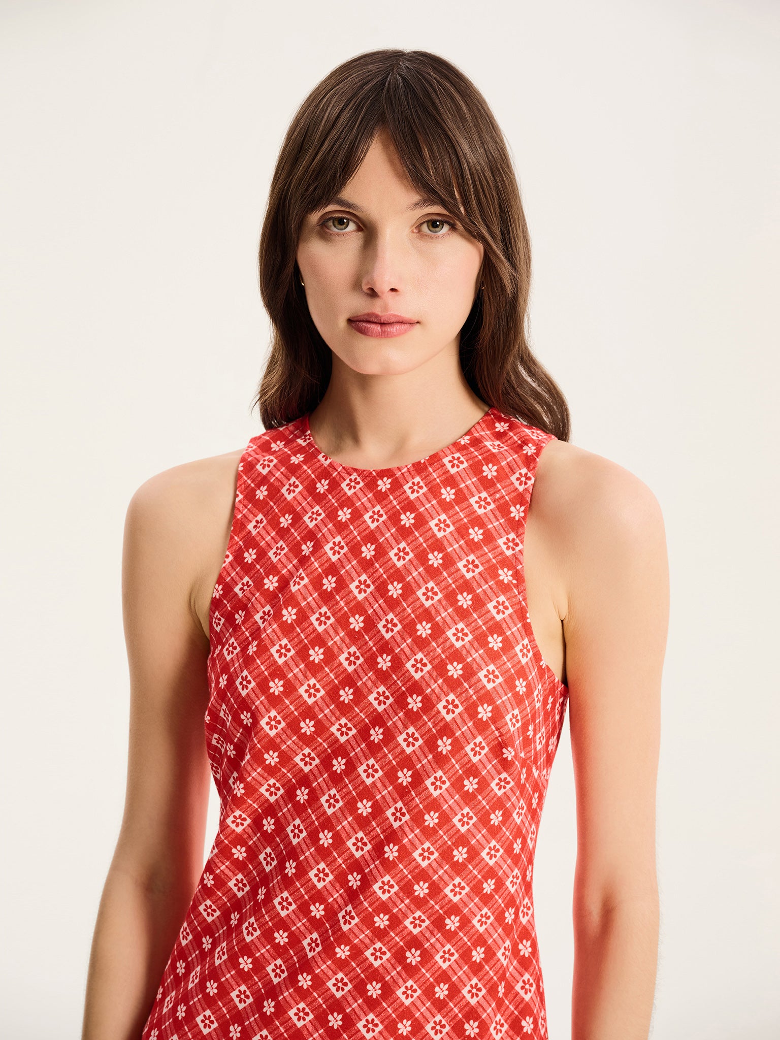 Torin maxi dress is a timeless piece, designed with a flattering bias cut that gracefully drapes over your figure. In a breezy cotton and linen blend this sleeveless dress features a classic crew neck and playful floral gingham print. Whether for a day out or a relaxed evening, the Torin dress is your go-to for laid-back yet polished style.