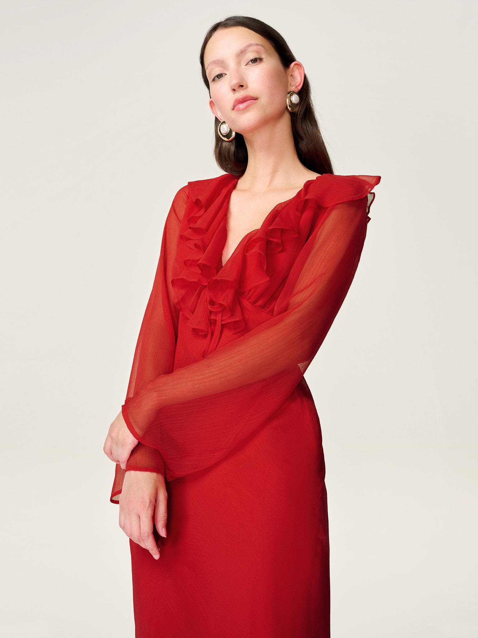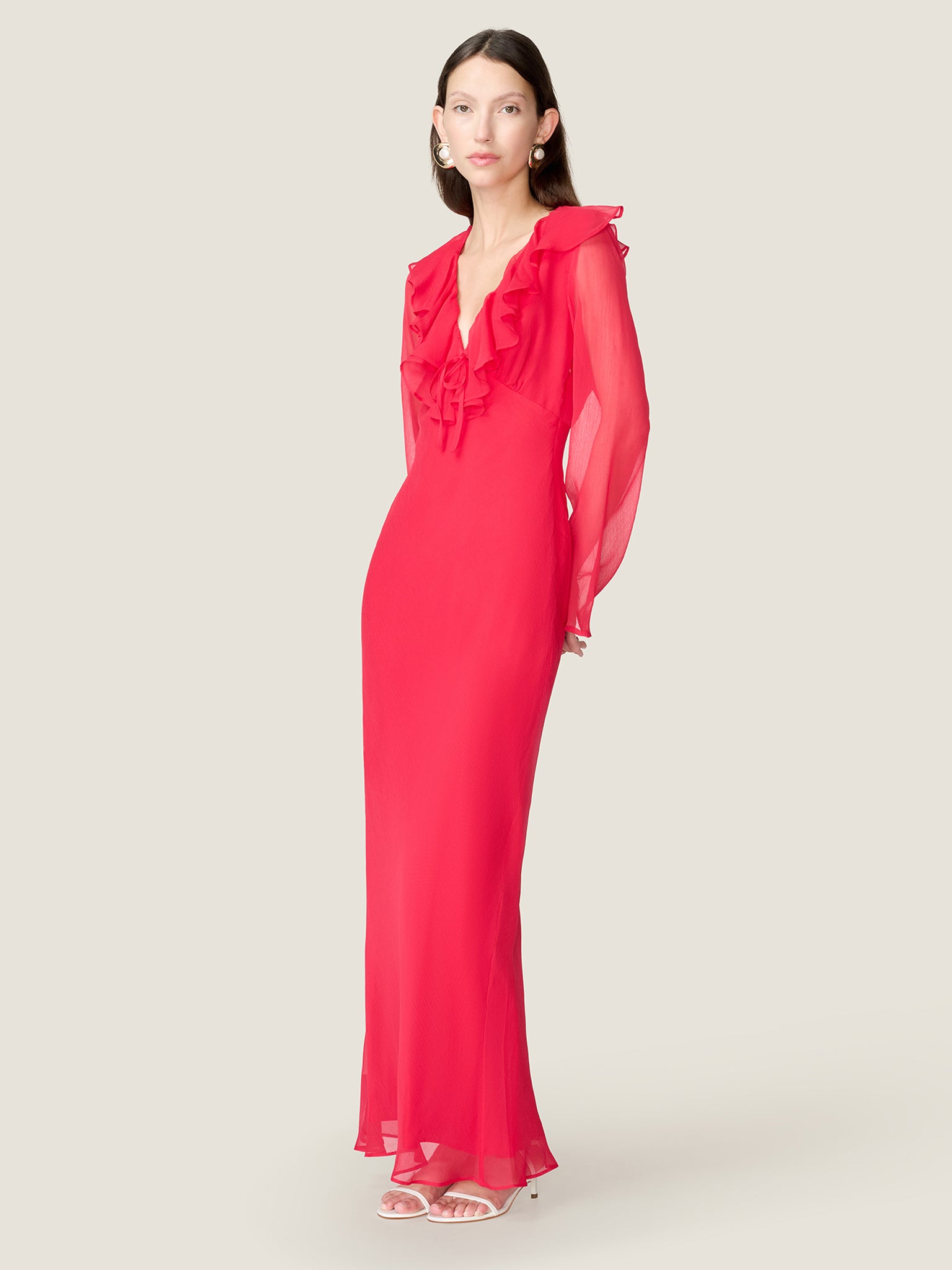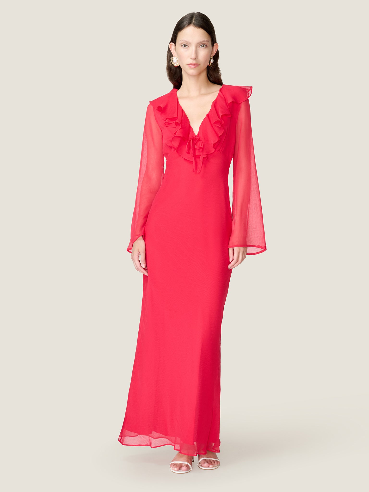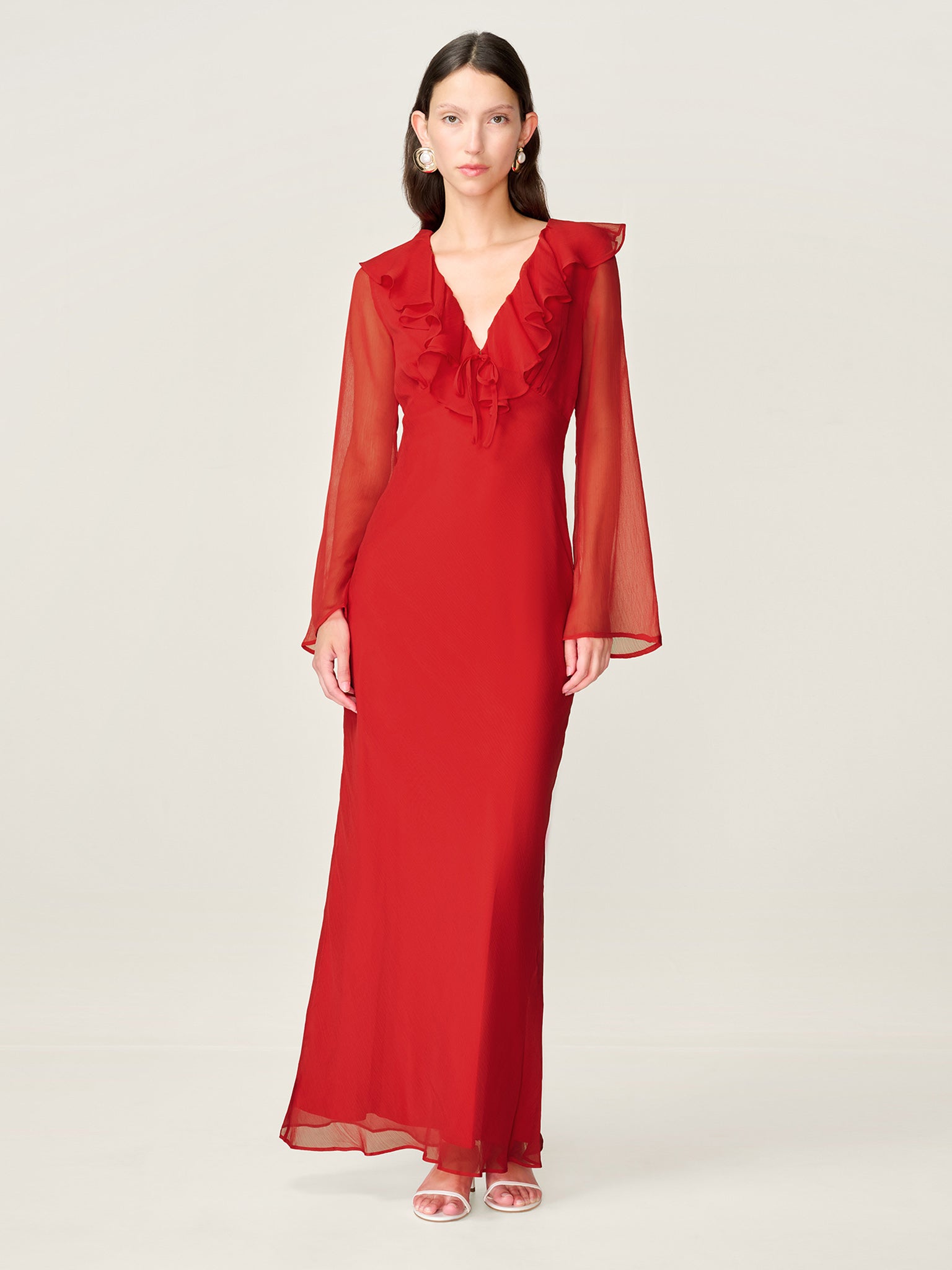 The Yvette dress is made from lightweight chiffon with a fluid drape and just the right amount of sheer. Designed with a deep V-neck, and gently flared sleeves, it’s finished with a delicate ruffle along the neckline for a romantic touch. In a bold shade of Barbados Cherry, this maxi dress strikes a balance between subtle and statement.