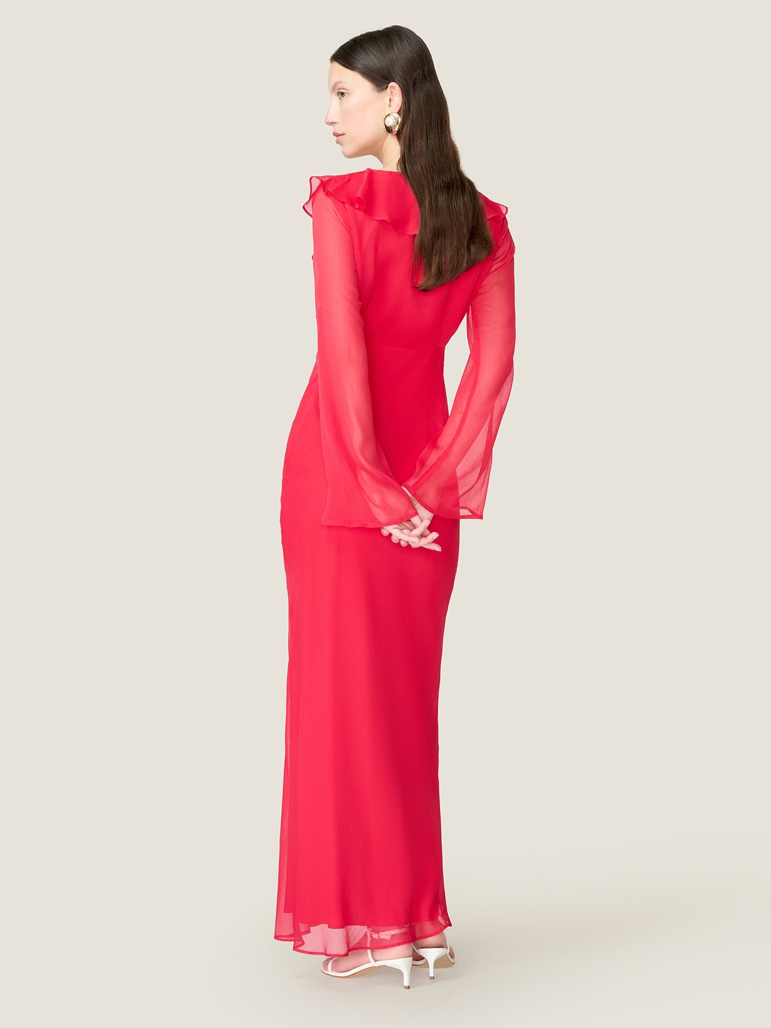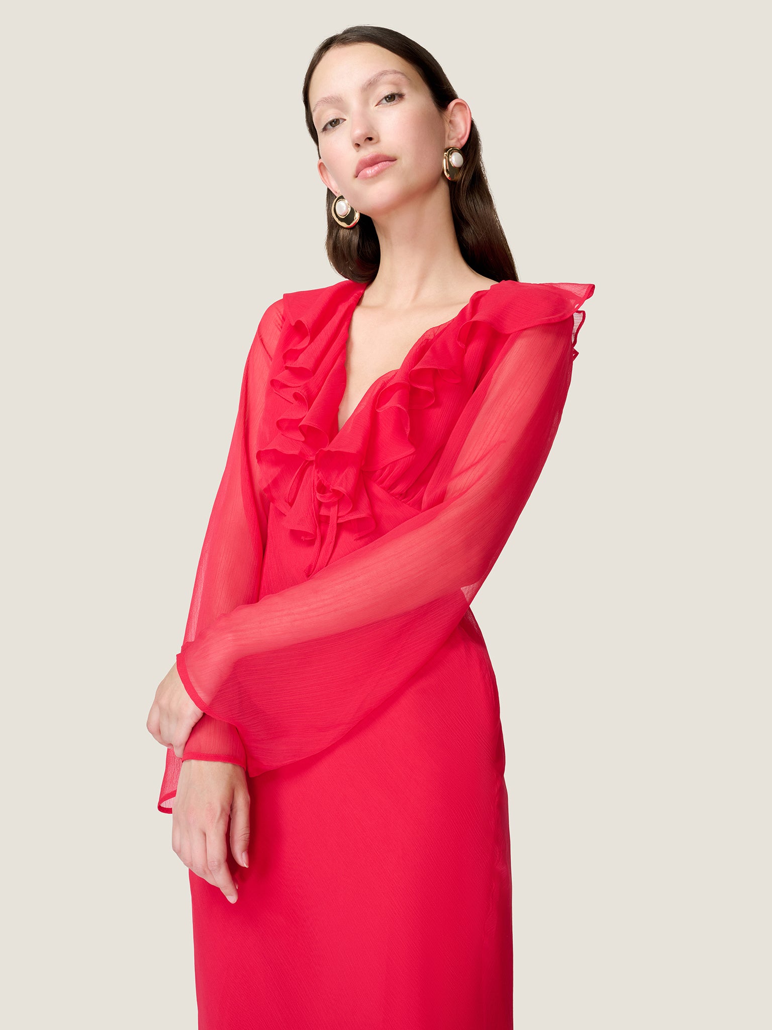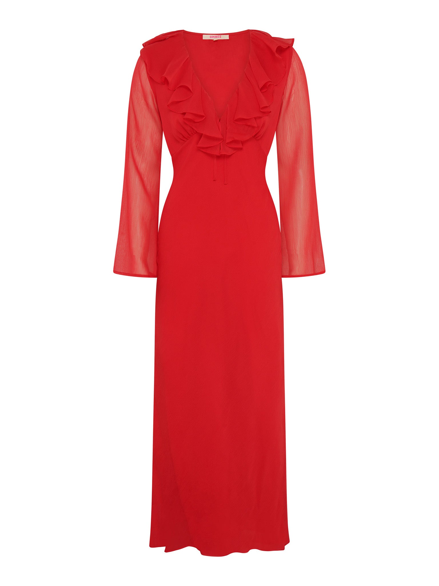 The Yvette dress is made from lightweight chiffon with a fluid drape and just the right amount of sheer. Designed with a deep V-neck, and gently flared sleeves, it’s finished with a delicate ruffle along the neckline for a romantic touch. In a bold shade of Barbados Cherry, this maxi dress strikes a balance between subtle and statement.