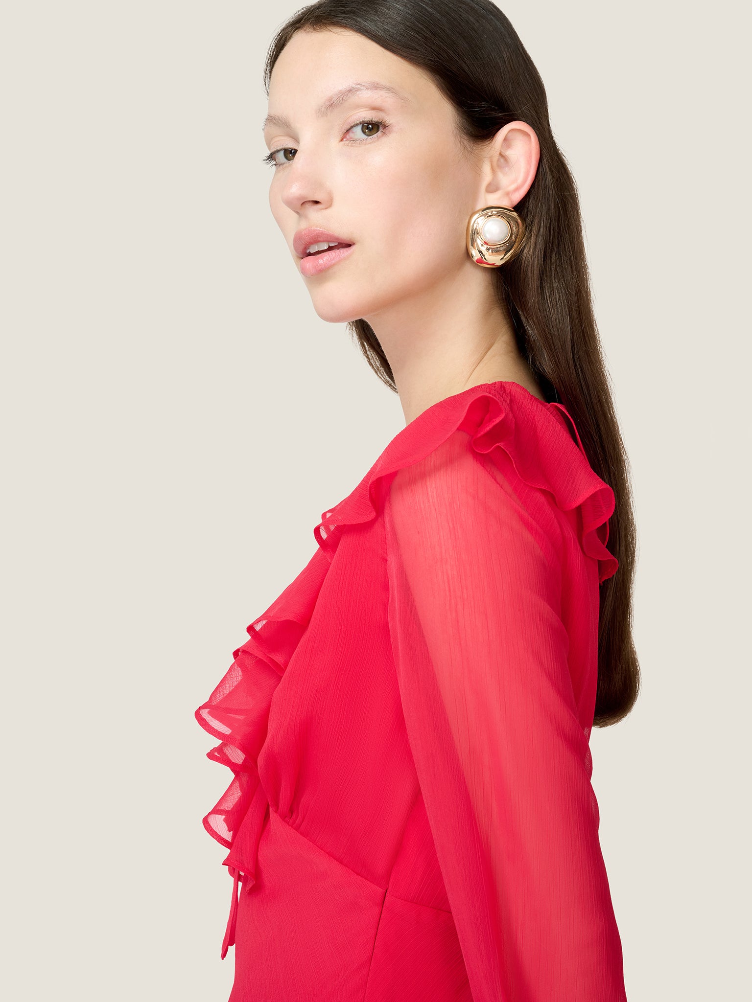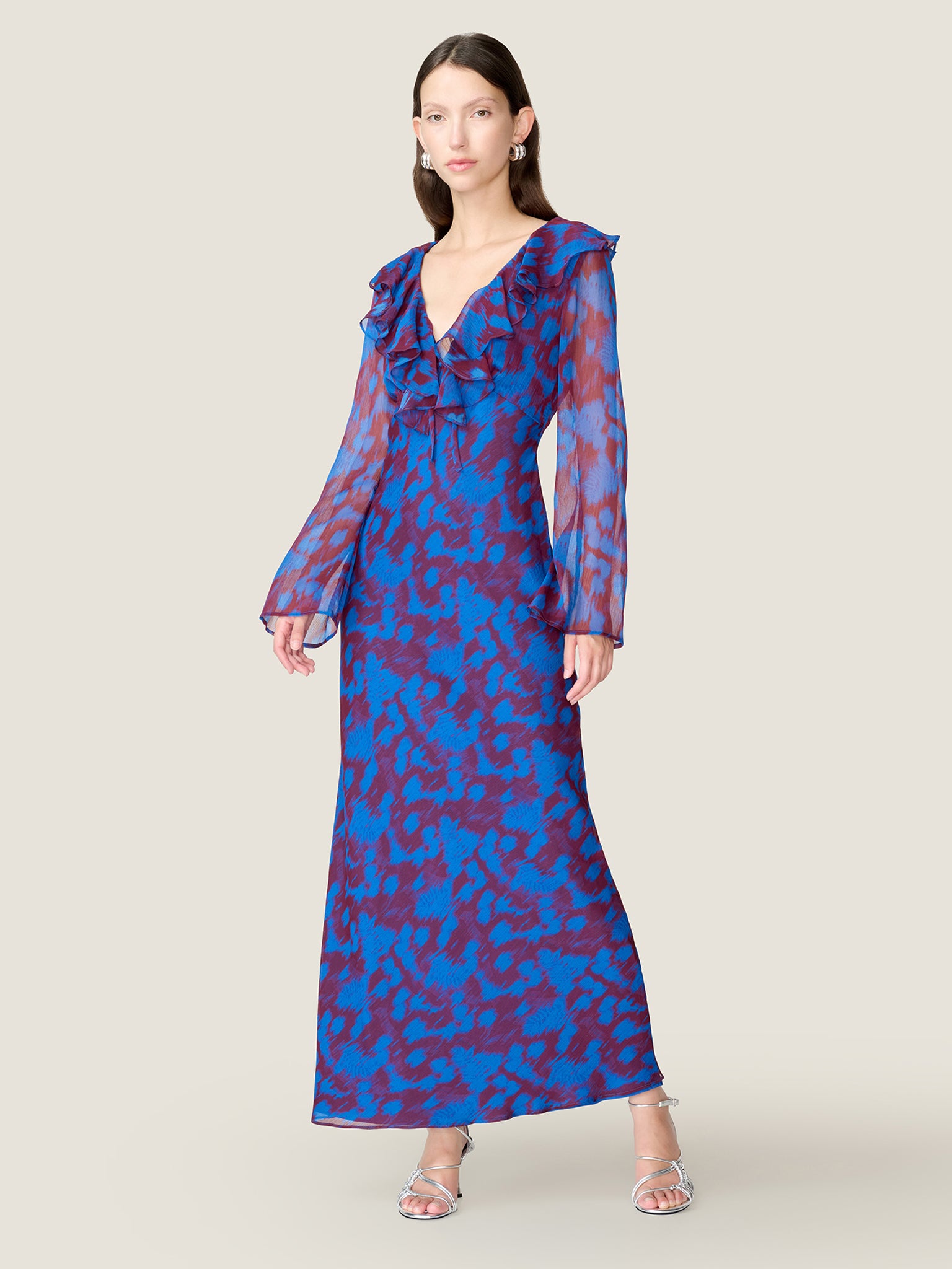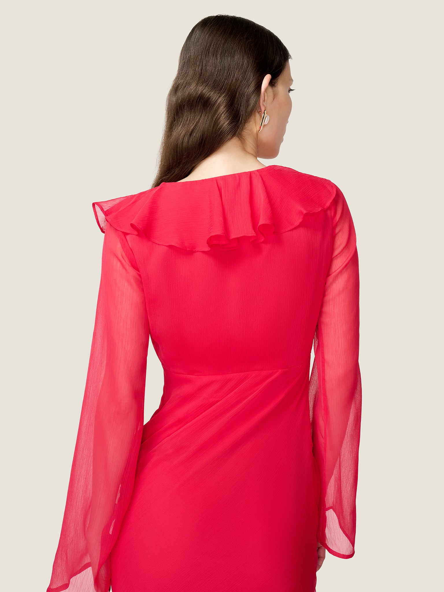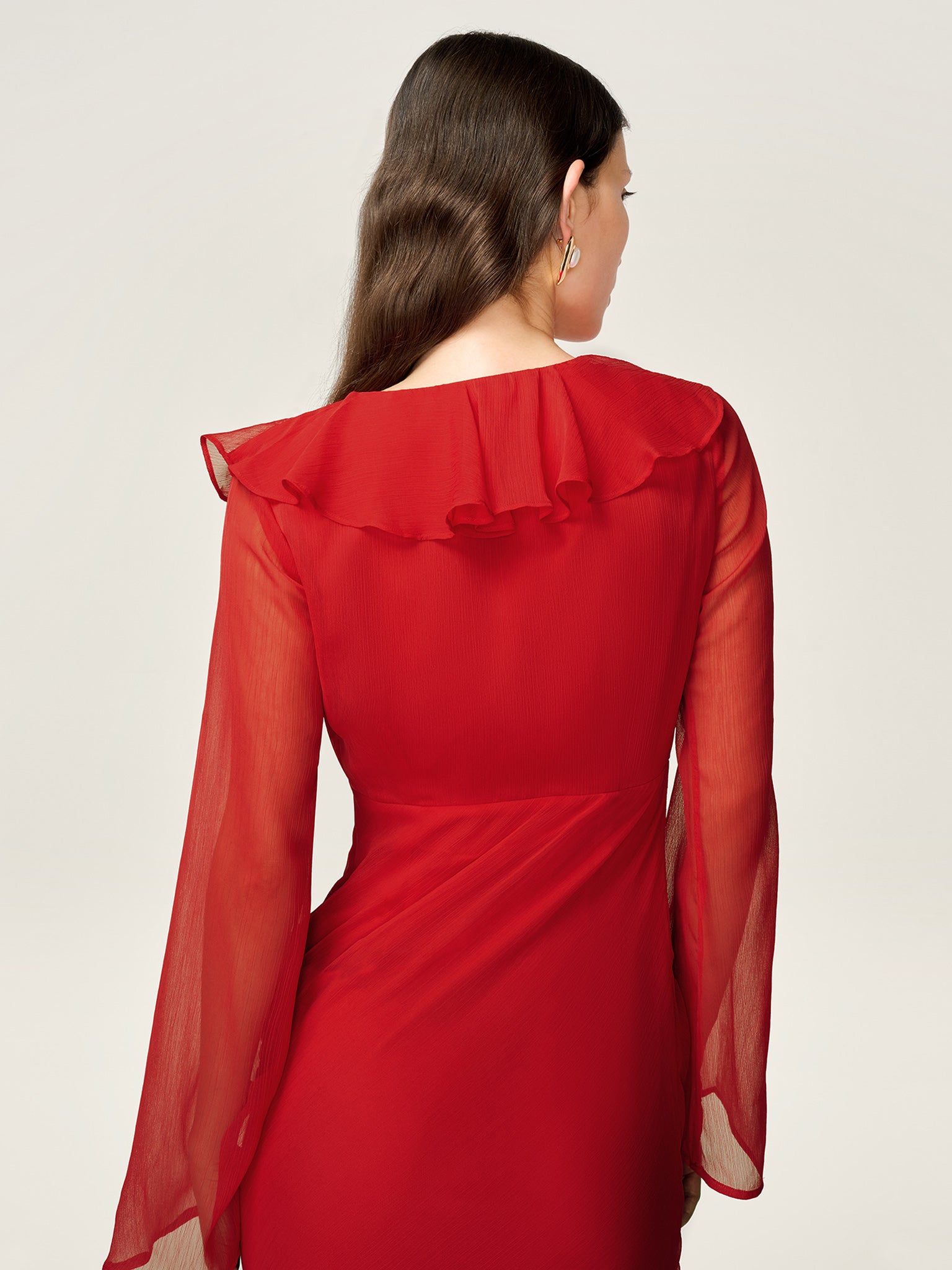 The Yvette dress is made from lightweight chiffon with a fluid drape and just the right amount of sheer. Designed with a deep V-neck, and gently flared sleeves, it’s finished with a delicate ruffle along the neckline for a romantic touch. In a bold shade of Barbados Cherry, this maxi dress strikes a balance between subtle and statement.